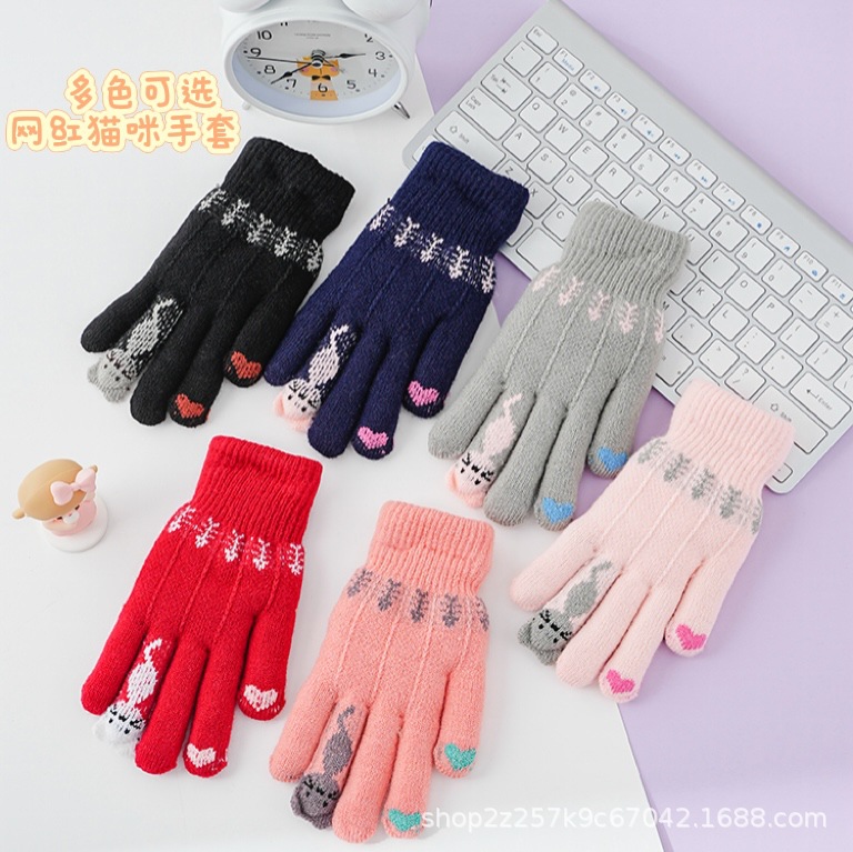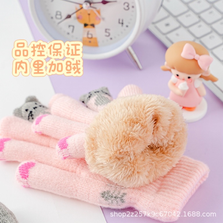 봄, 가을, 겨울 및 겨울에 여성을위한 어린이 니트 울 장갑 따뜻한 더블 레이어 다섯 손가락 사이클링 학생들을위한 귀여운스토어 가기