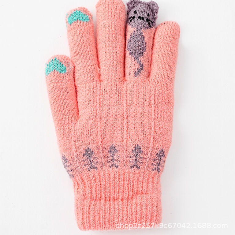 봄, 가을, 겨울 및 겨울에 여성을위한 어린이 니트 울 장갑 따뜻한 더블 레이어 다섯 손가락 사이클링 학생들을위한 귀여운