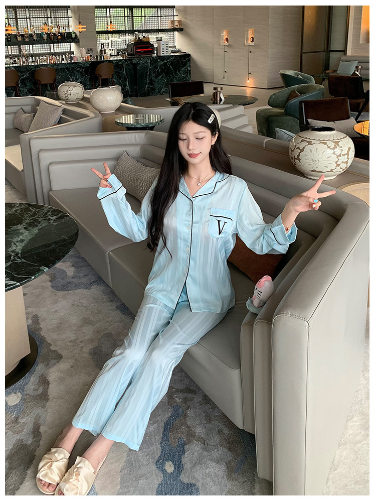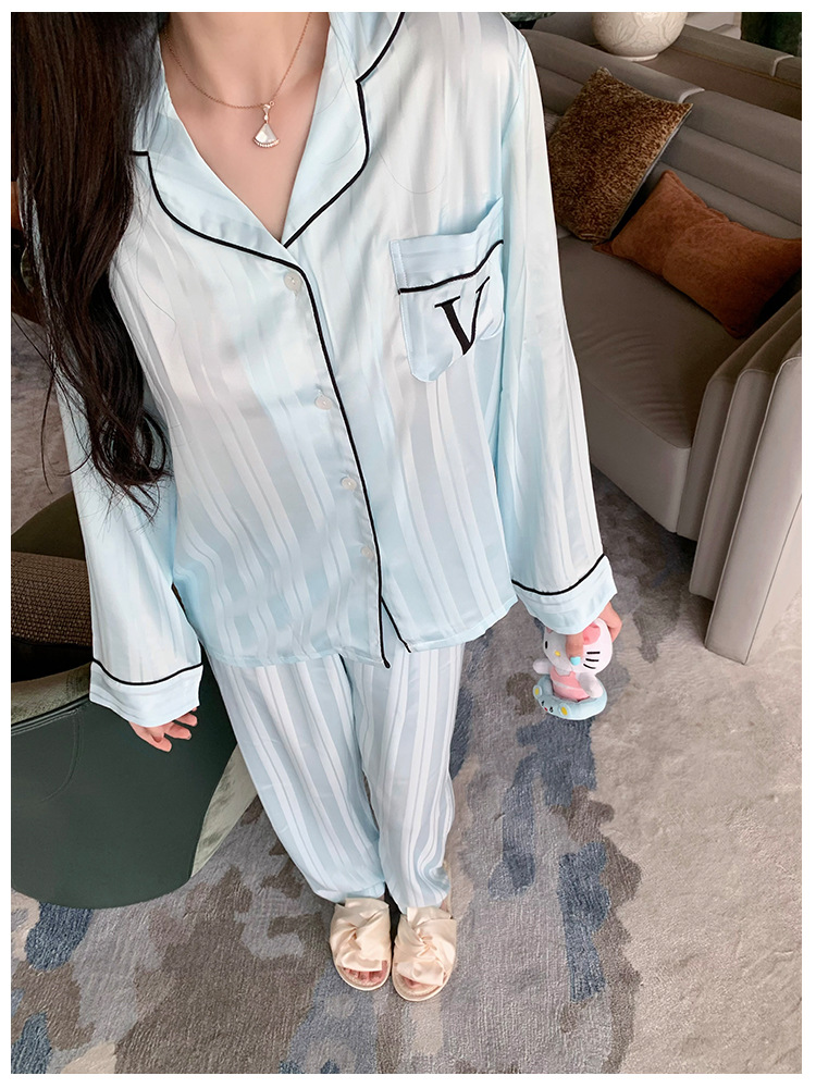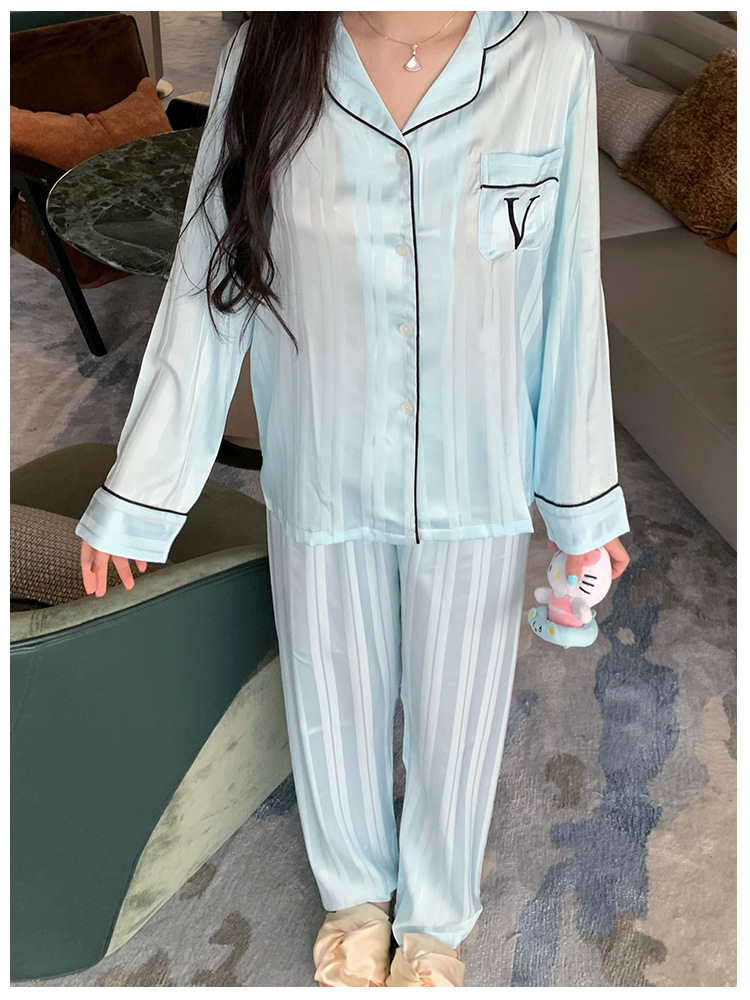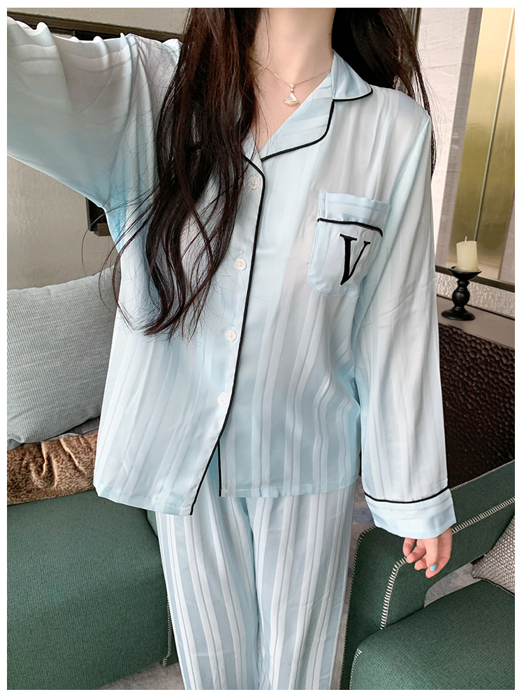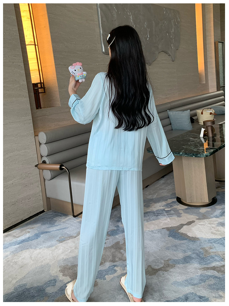 양치 아이스 실크 잠옷 세트 줄무늬 자카드 느슨한 편안한 홈 옷 세트 여성 달빛 두꺼운 봄과 가을스토어 가기