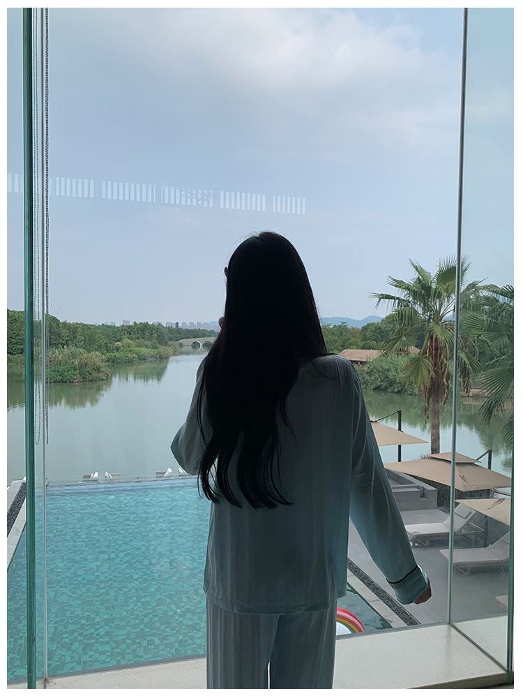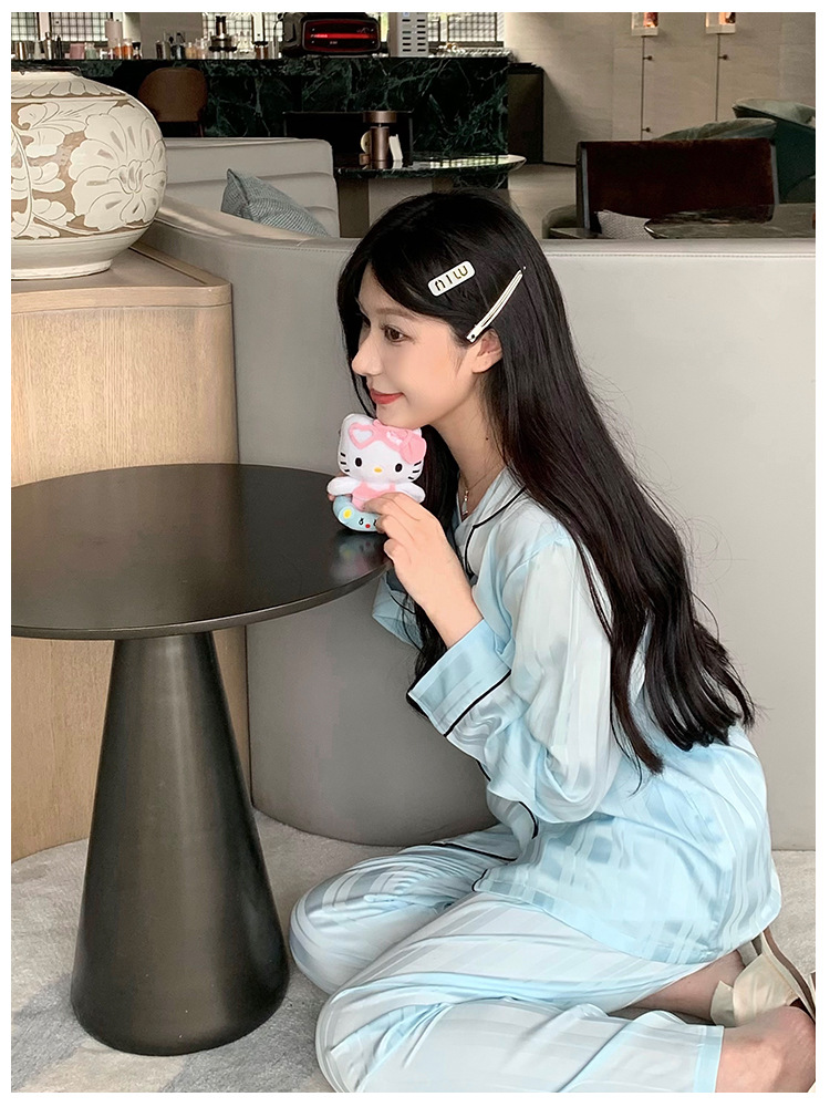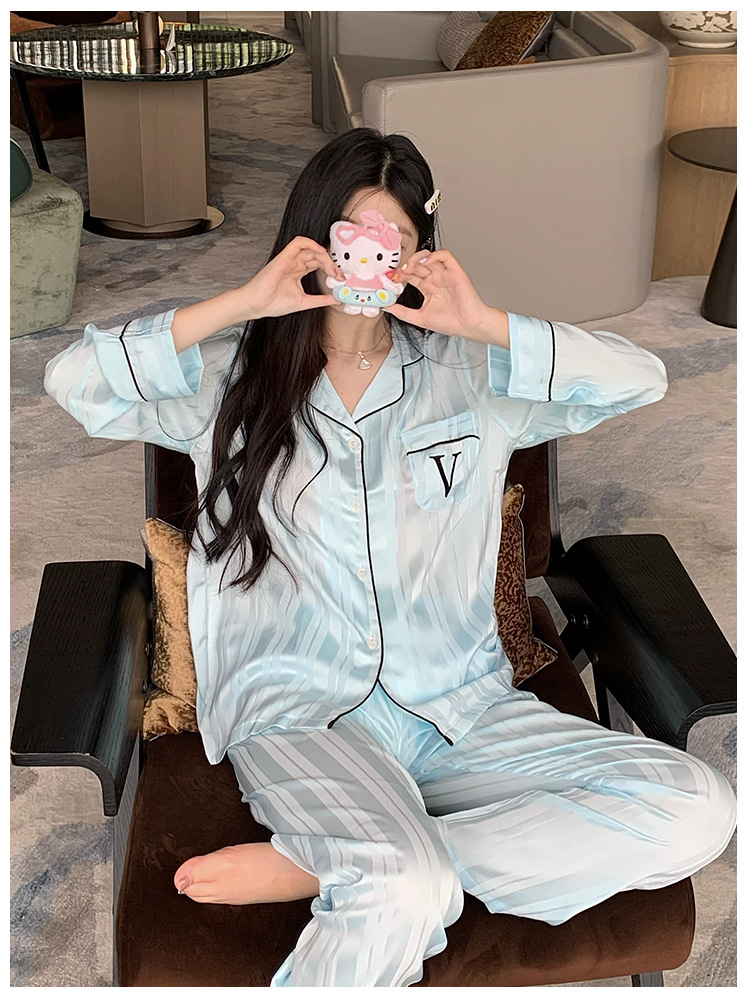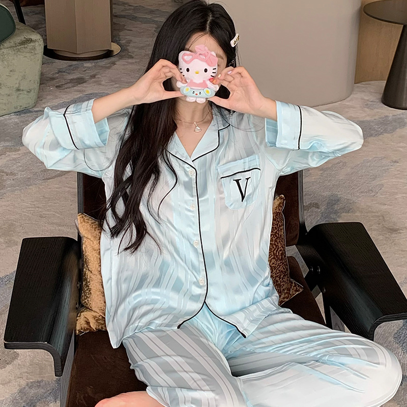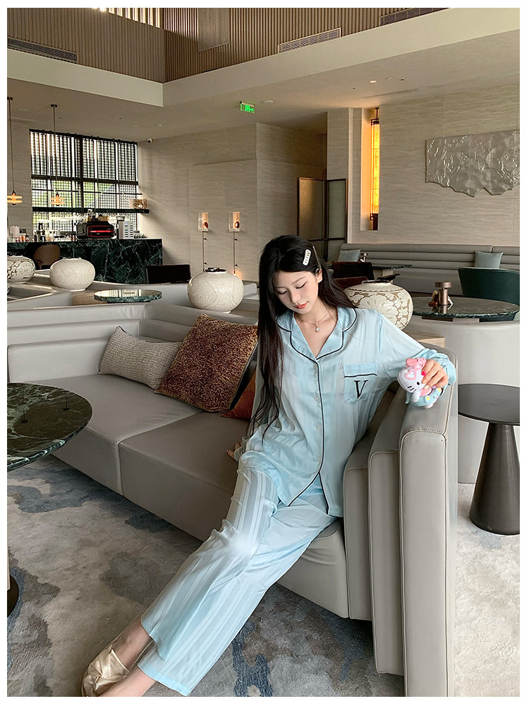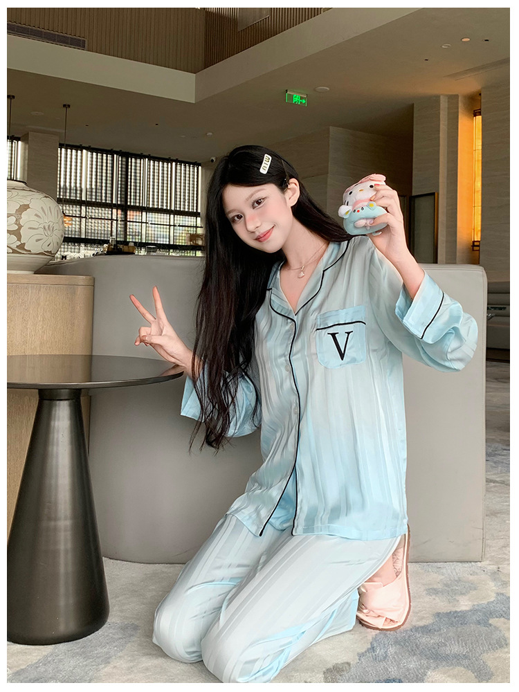 양치 아이스 실크 잠옷 세트 줄무늬 자카드 느슨한 편안한 홈 옷 세트 여성 달빛 두꺼운 봄과 가을스토어 가기