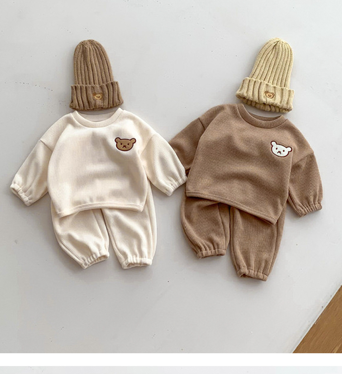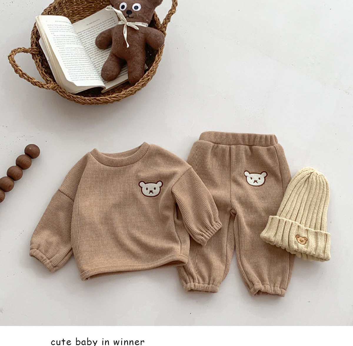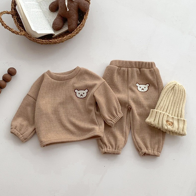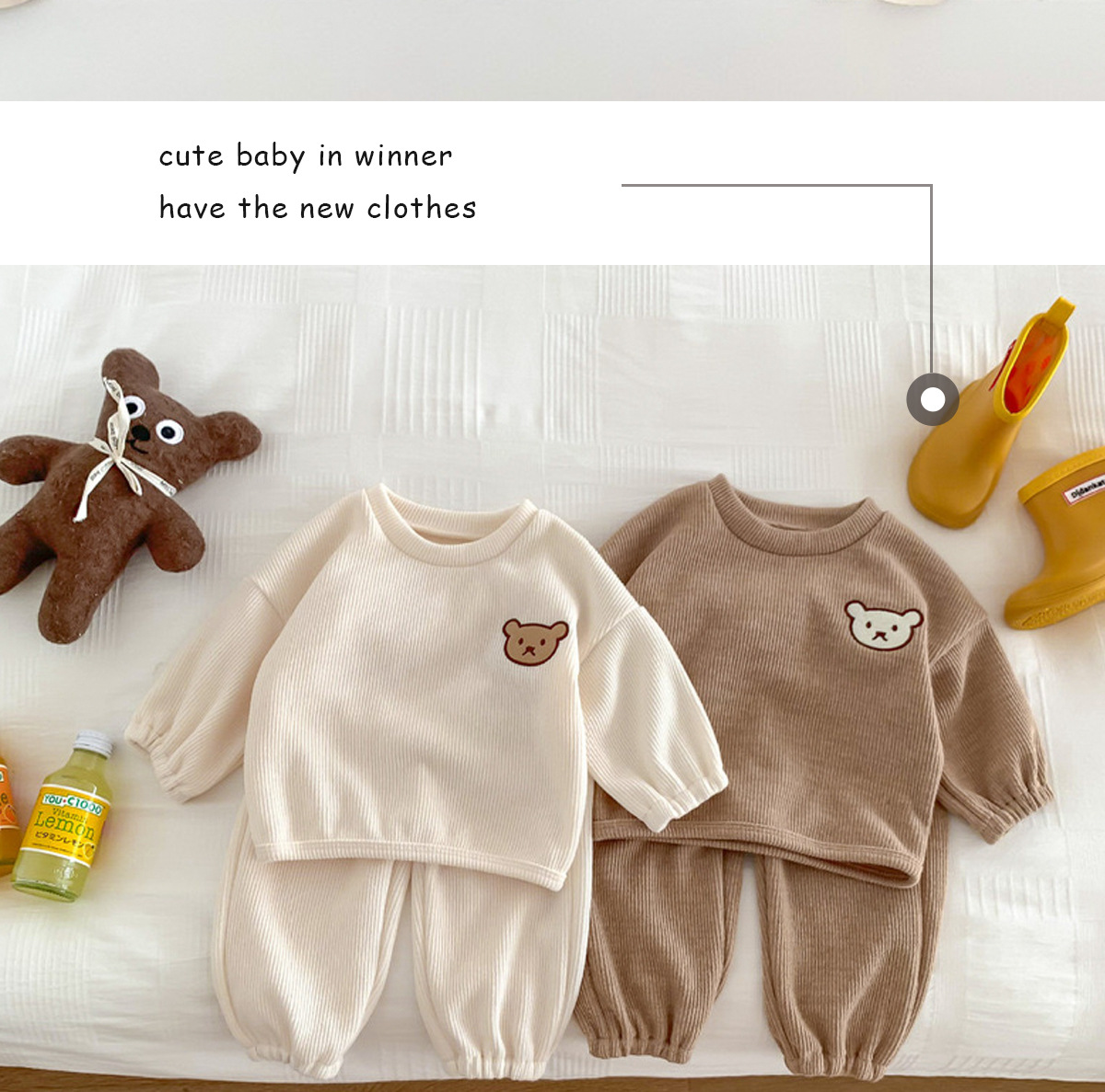 Ins 새로운 봄과 가을 한국 스타일 아기 귀여운 만화 곰 머리 긴 소매 스웨터 바지 아기 소년과 소녀를위한 캐주얼 세트스토어 가기
