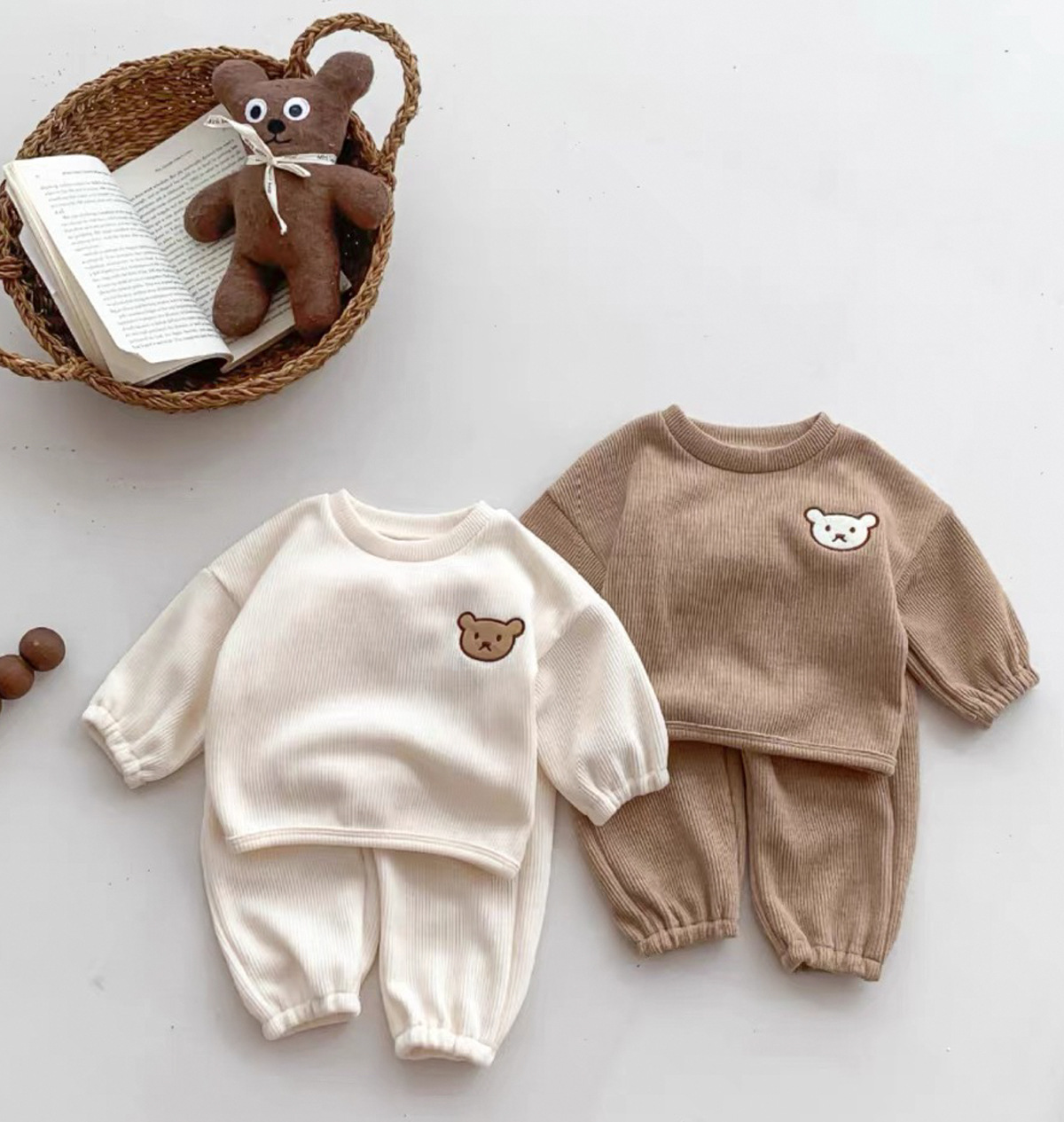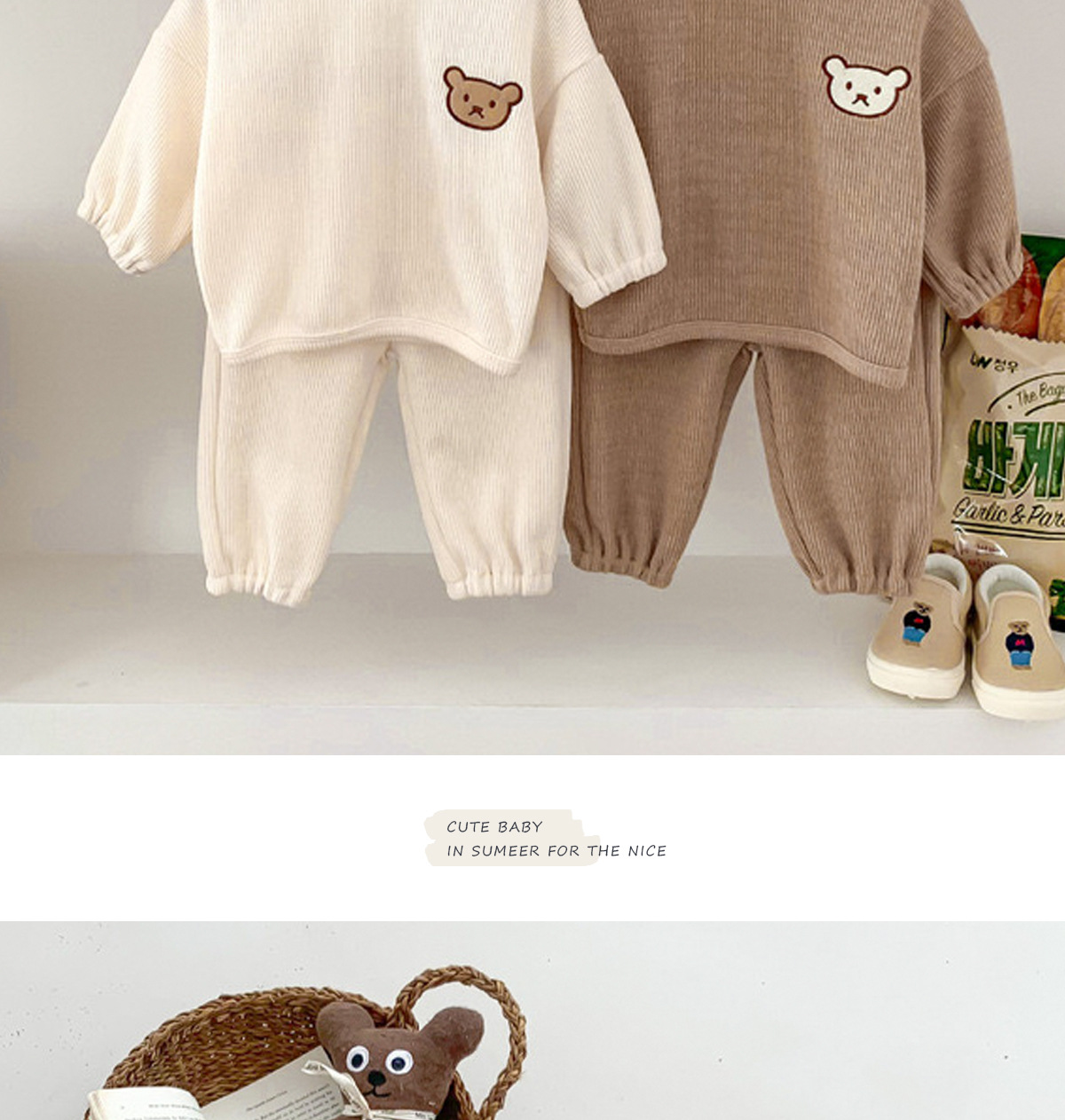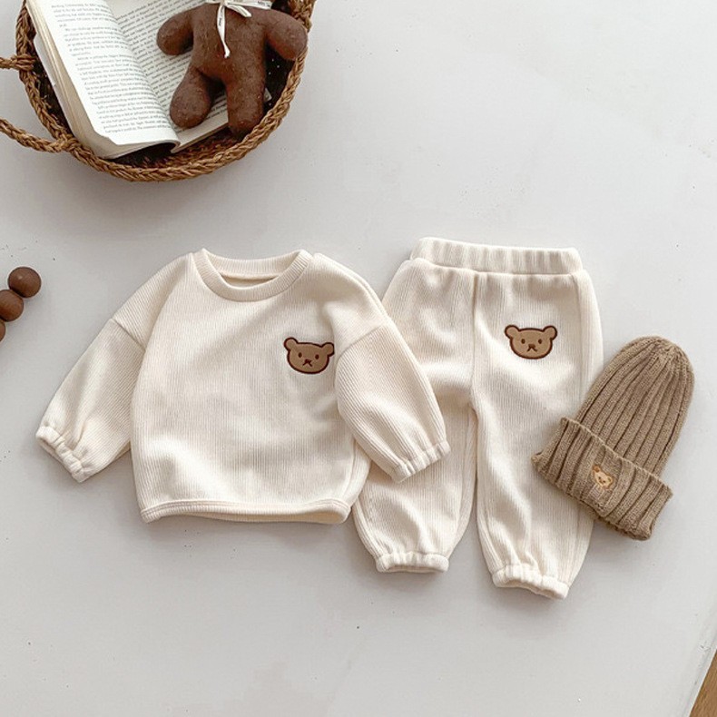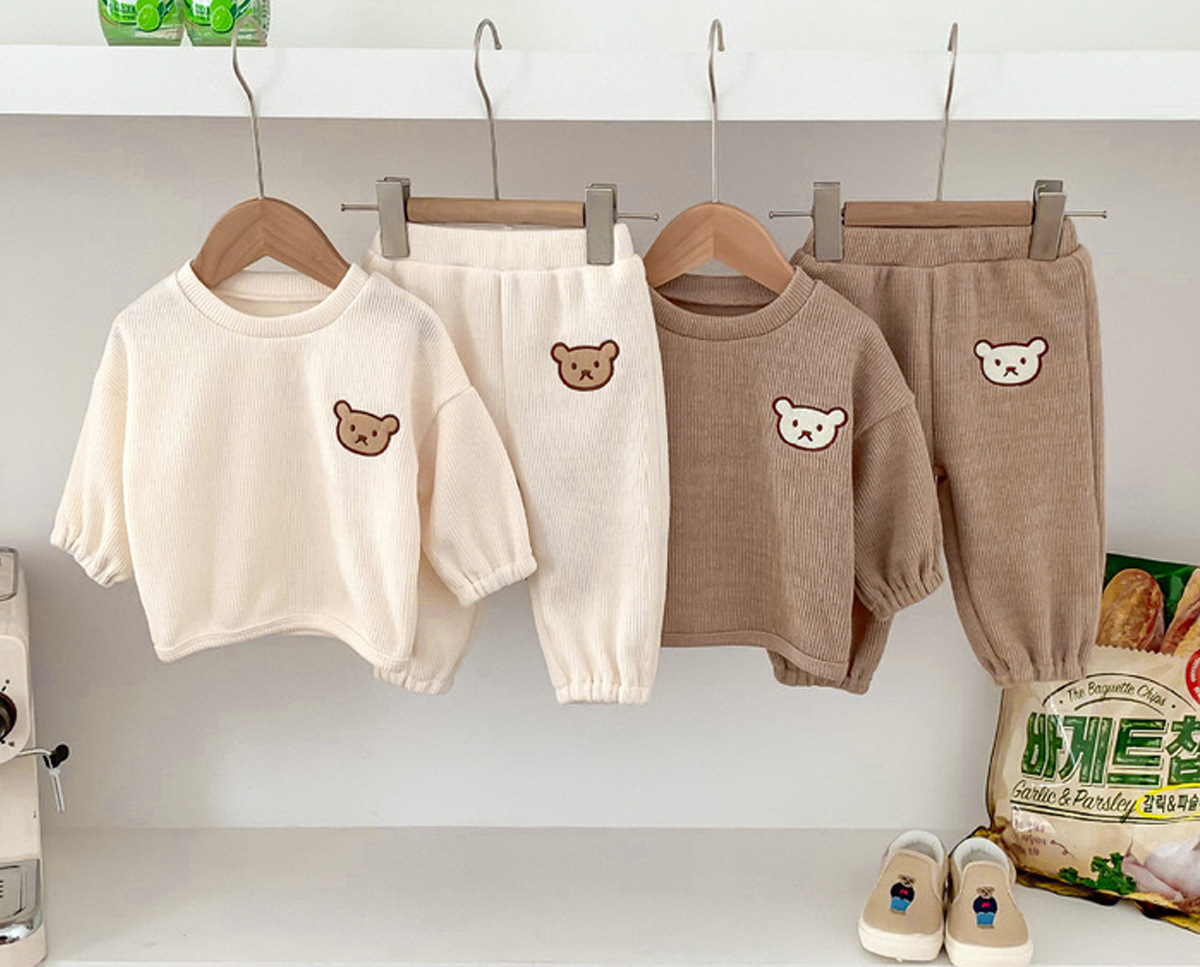 Ins 새로운 봄과 가을 한국 스타일 아기 귀여운 만화 곰 머리 긴 소매 스웨터 바지 아기 소년과 소녀를위한 캐주얼 세트스토어 가기