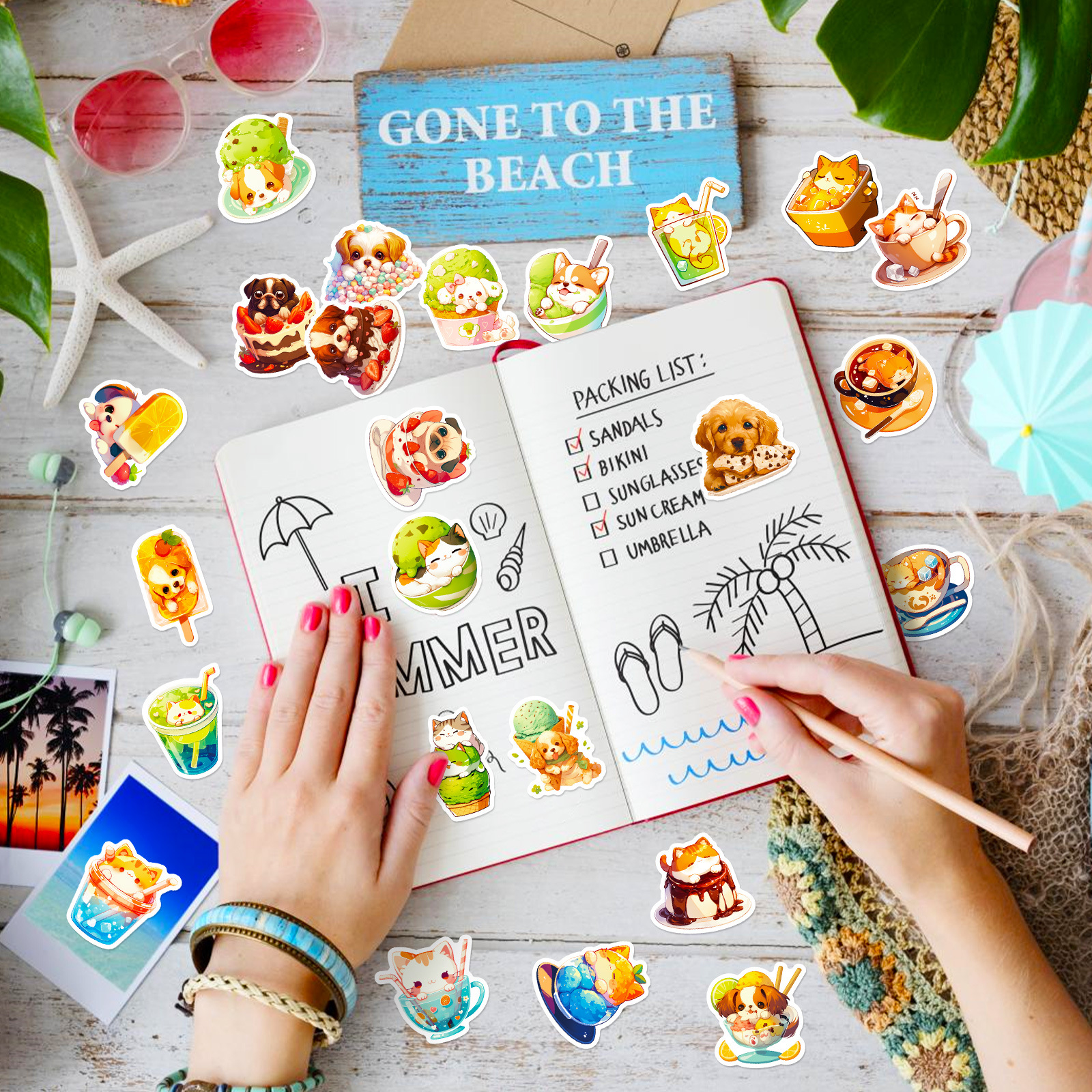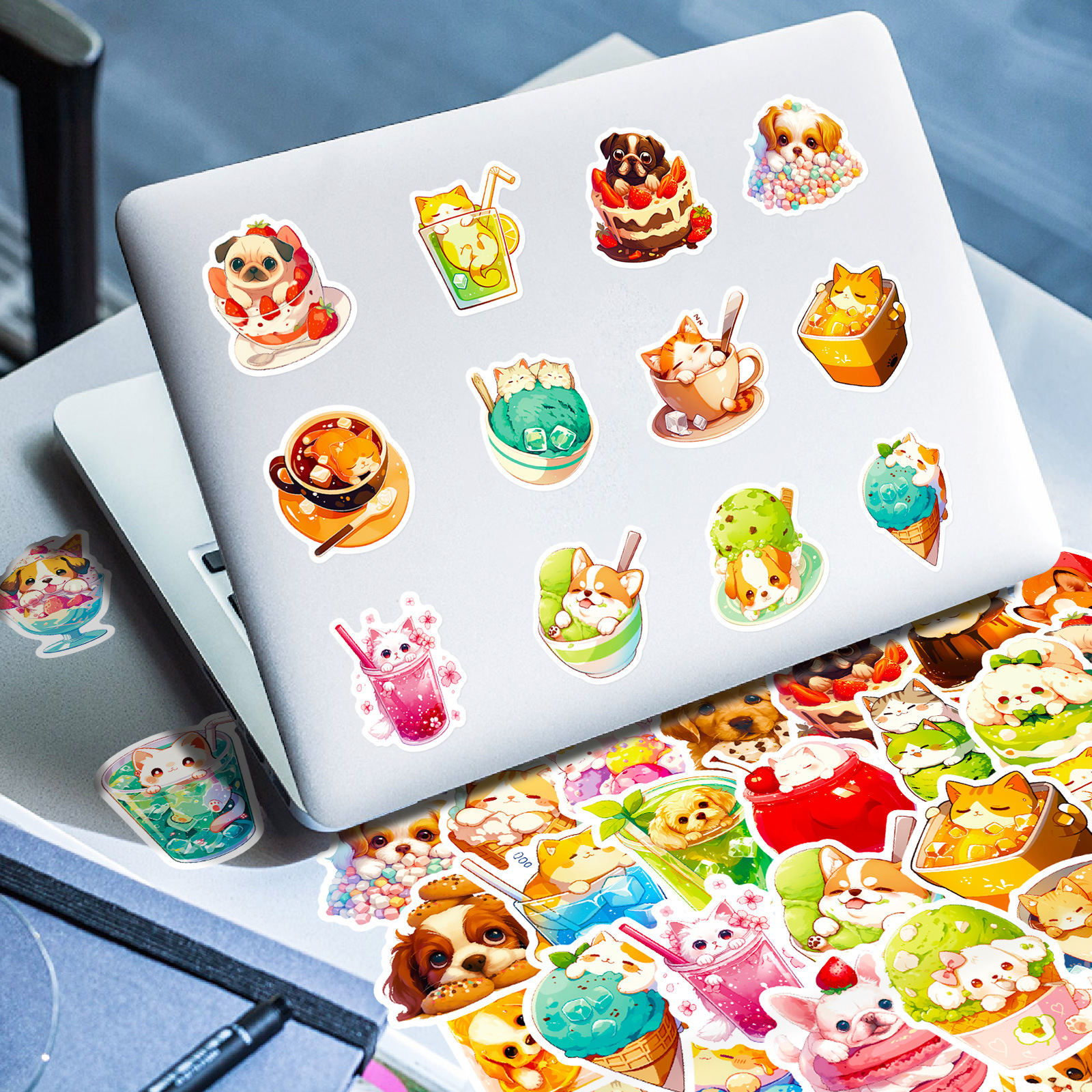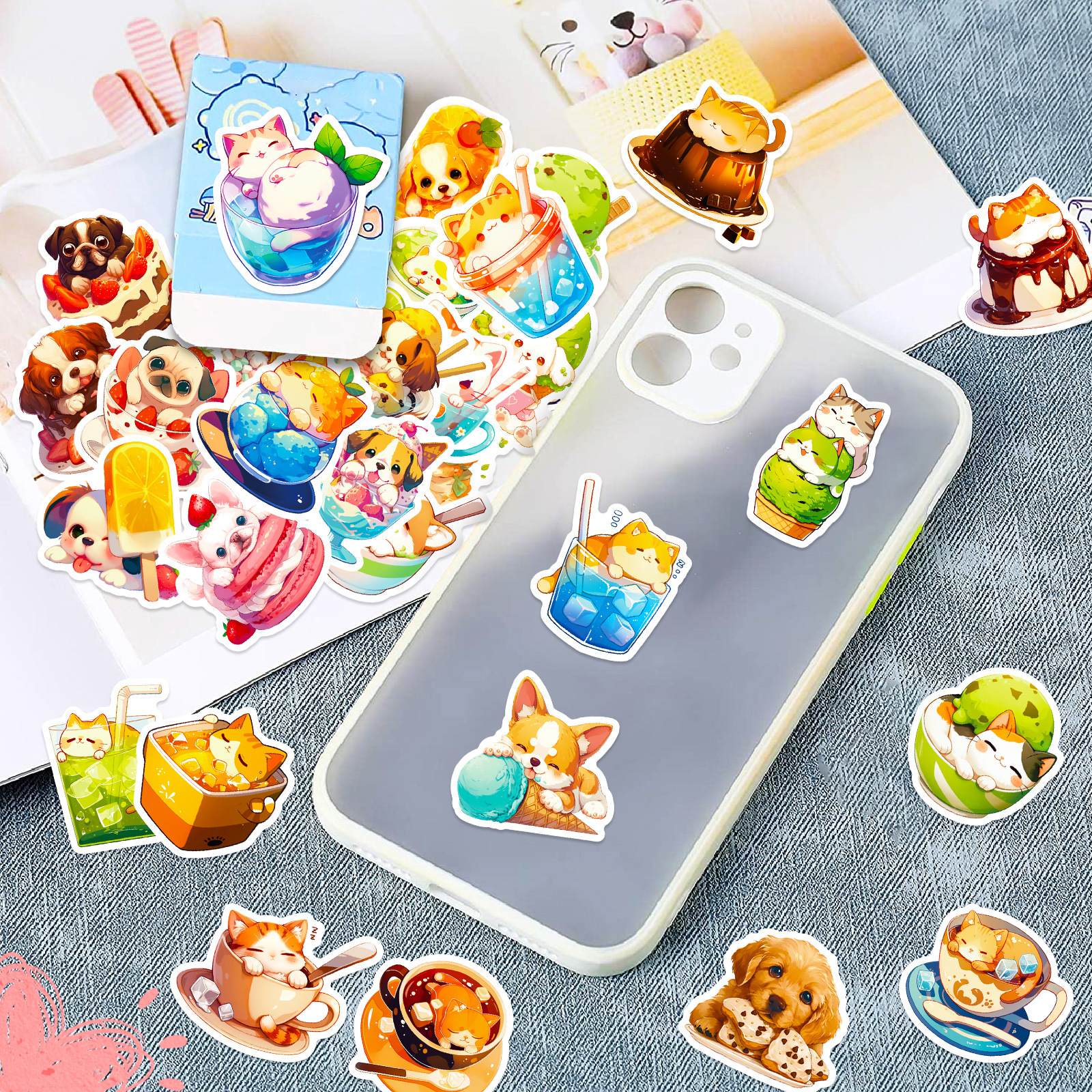 50 창조적 인 귀여운 음식 고양이 개 낙서 스티커 푸딩 고양이 아이스크림 강아지는 재미 스티커를 반복하지 않습니다스토어 가기