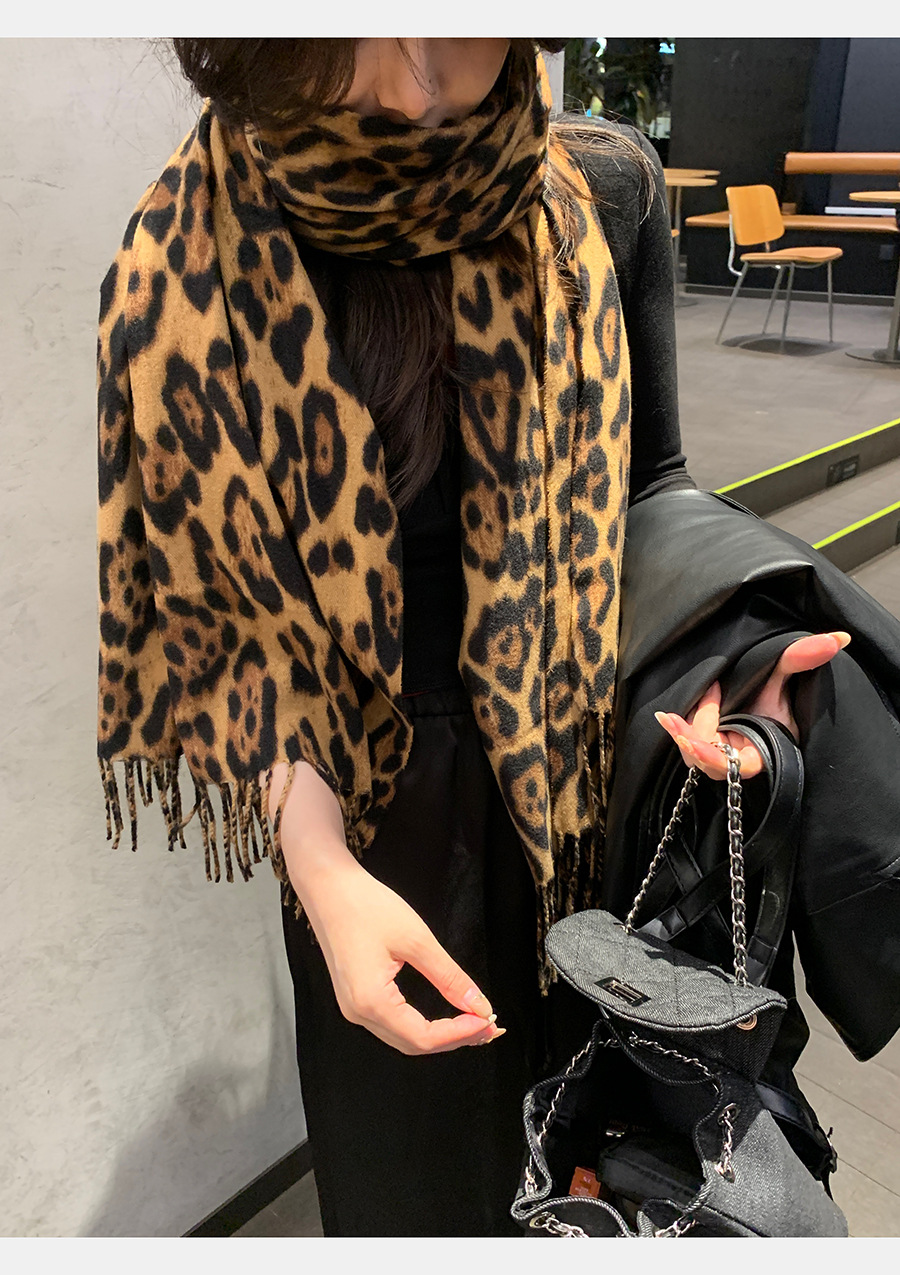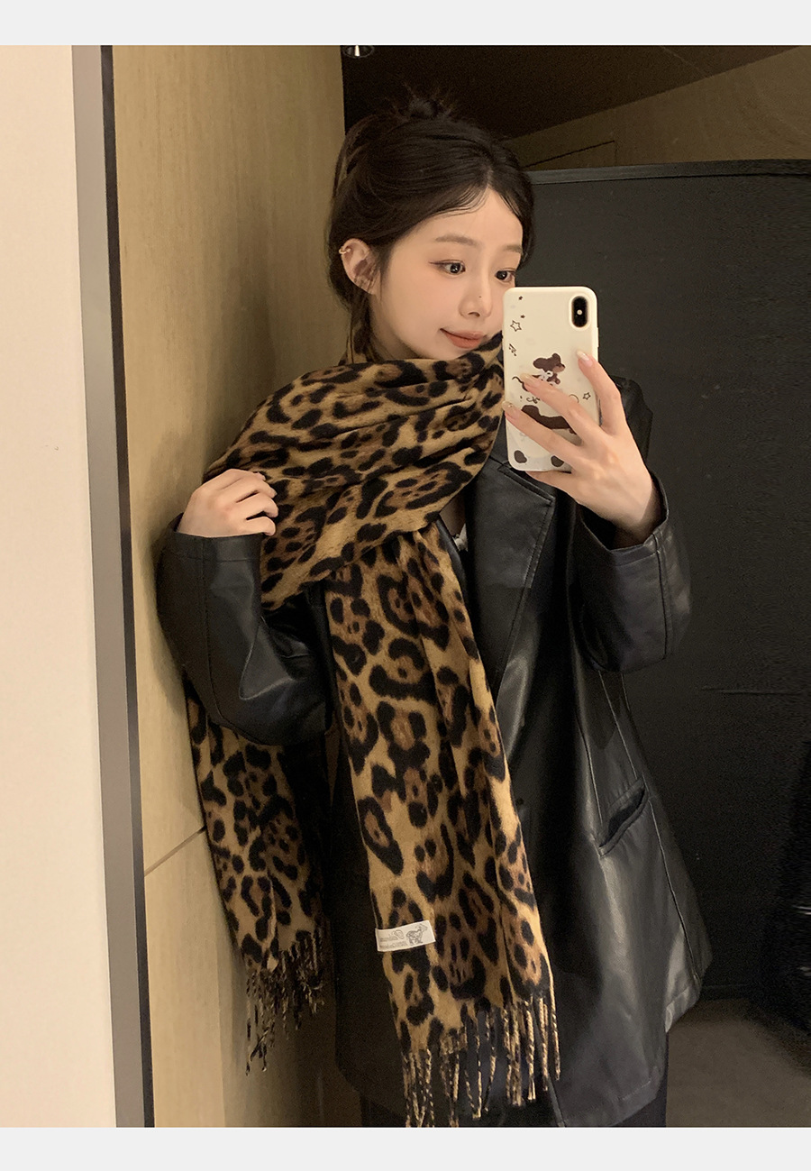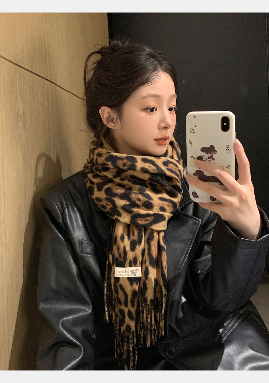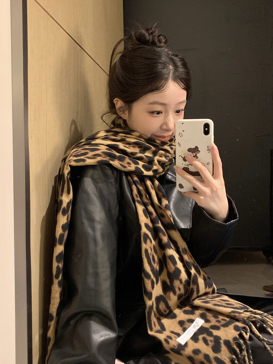 여성을위한 한국 스타일 레오파드 프린트 태슬 스카프 2024 뉴 밀레니엄 핫 소녀 스타일 가을, 겨울 두꺼운 목도리 가을, 겨울 따뜻한 스카프