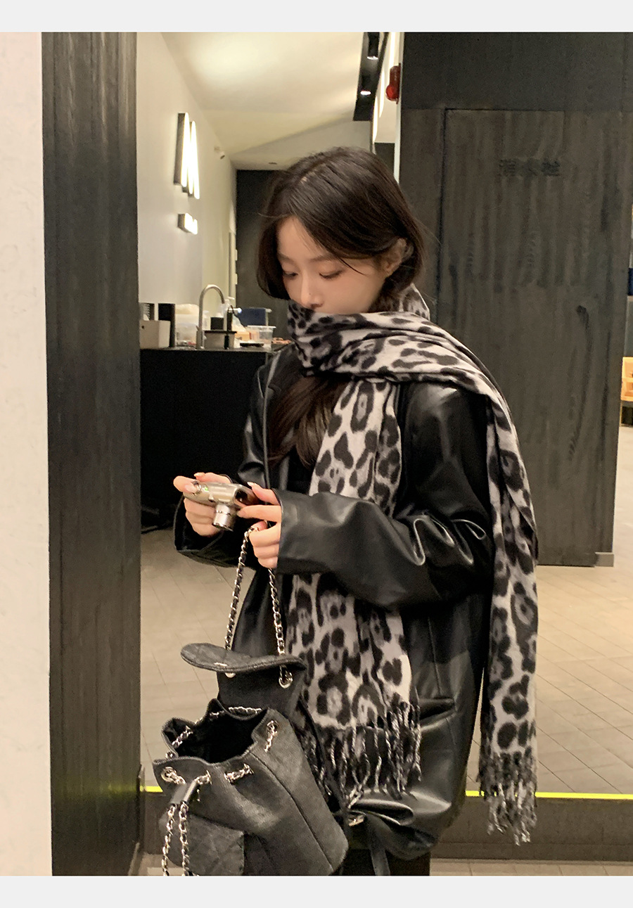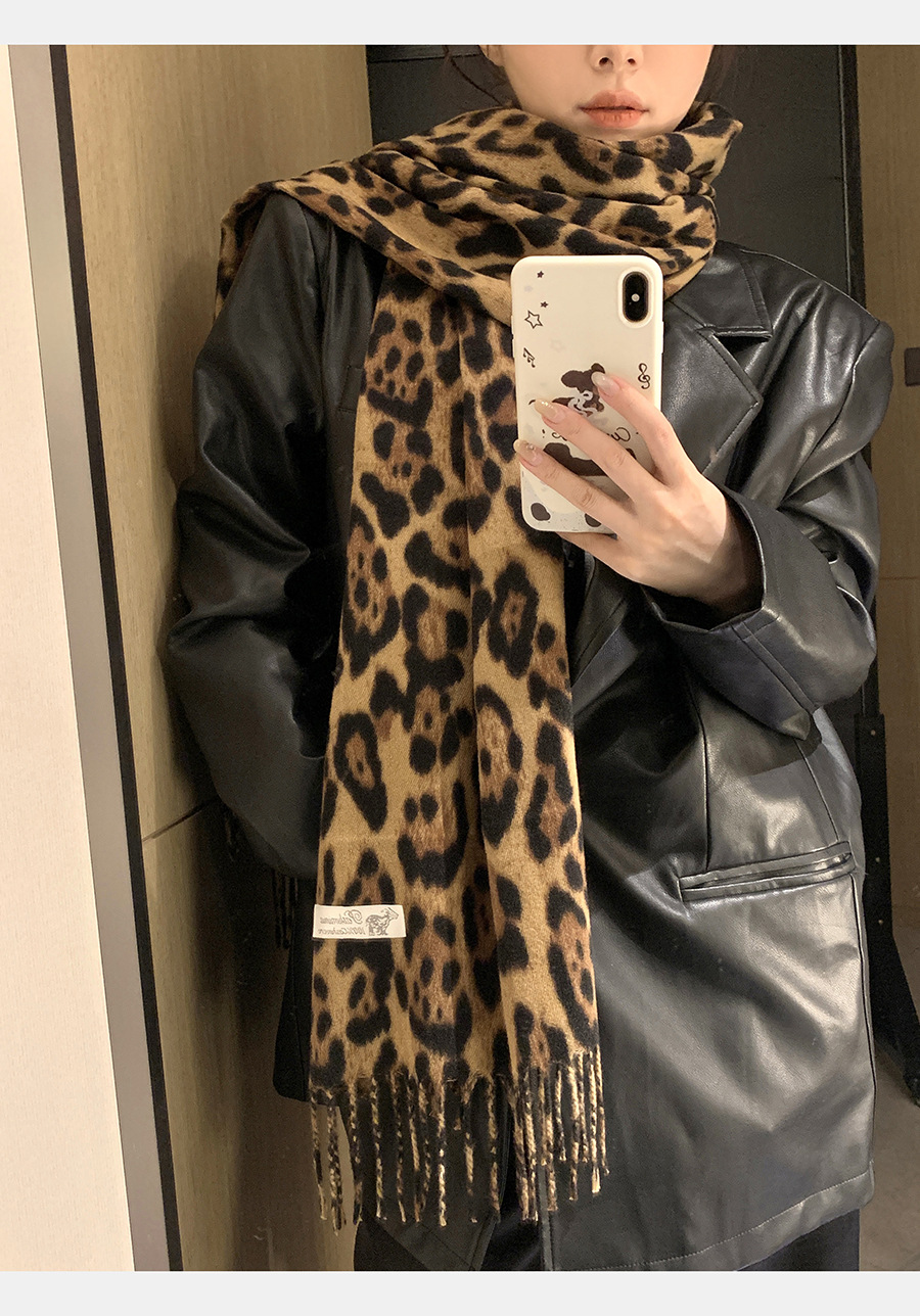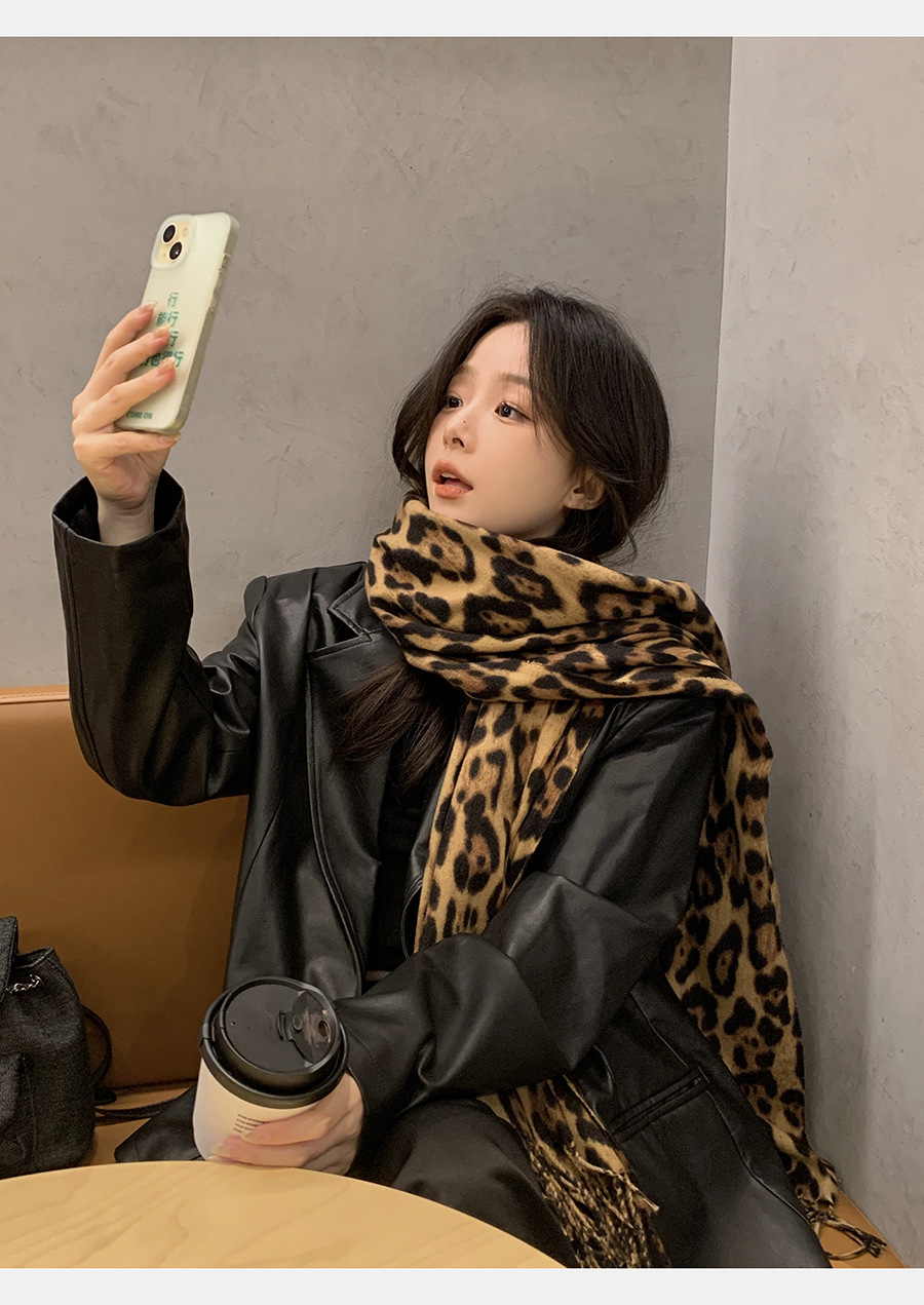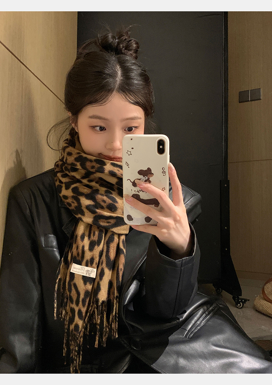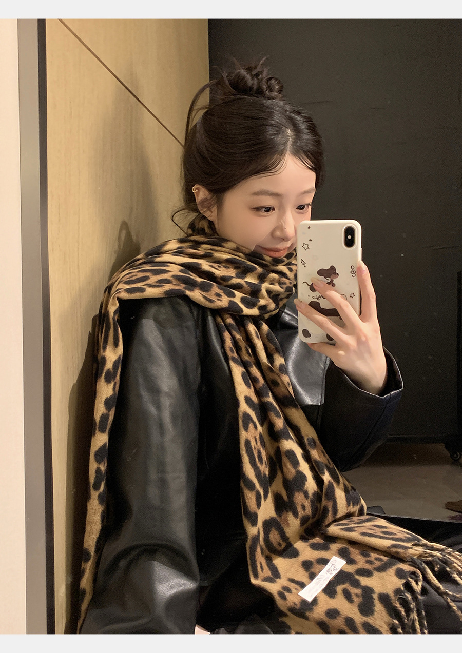 여성을위한 한국 스타일 레오파드 프린트 태슬 스카프 2024 뉴 밀레니엄 핫 소녀 스타일 가을, 겨울 두꺼운 목도리 가을, 겨울 따뜻한 스카프