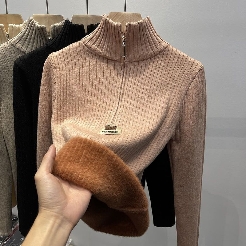 가을과 겨울 2024 새로운 원피스 벨벳 기모 두껍게 풀 올매치 베이스 셔츠 하프 하이 칼라 스웨터 여성