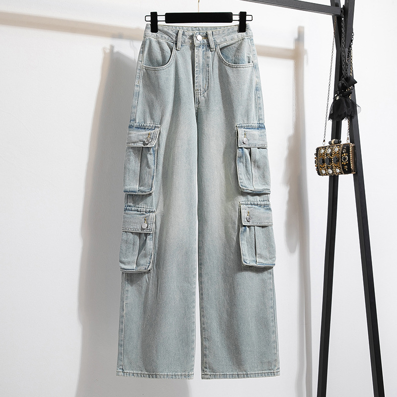 리얼 샷 퓨어 코튼 세탁 청바지 여성용 아메리칸 스타일 레트로 로우 허리 스트레이트 루즈 멀티 포켓 작업 바지 가을 플러스 사이즈