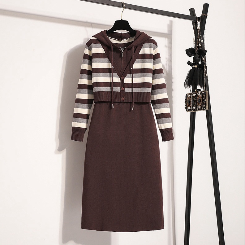 유럽 봄, 가을 여성 봄, 가을 2025 올해 인기 있는 아름다운 캐주얼 후드 가짜 투피스 드레스 세트