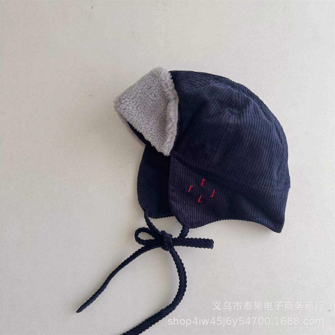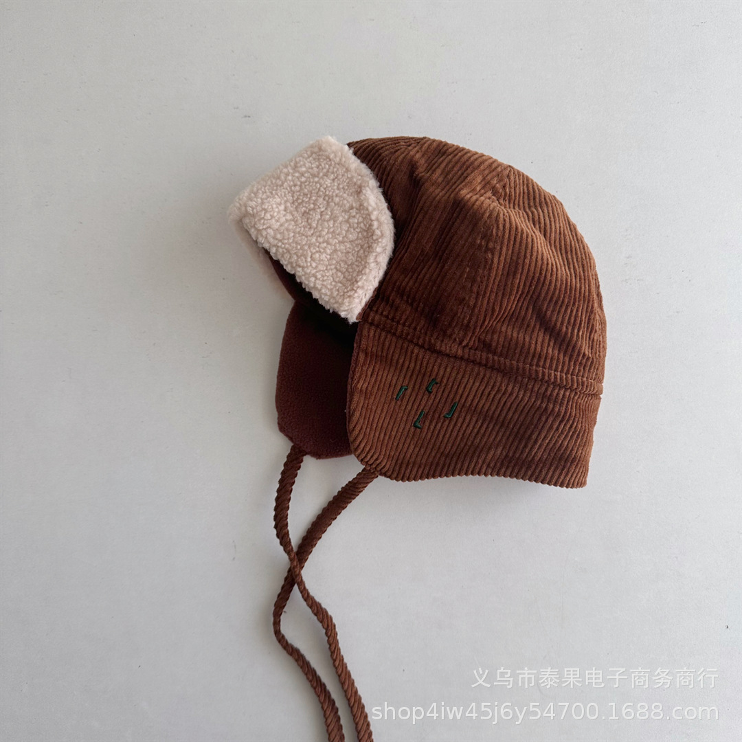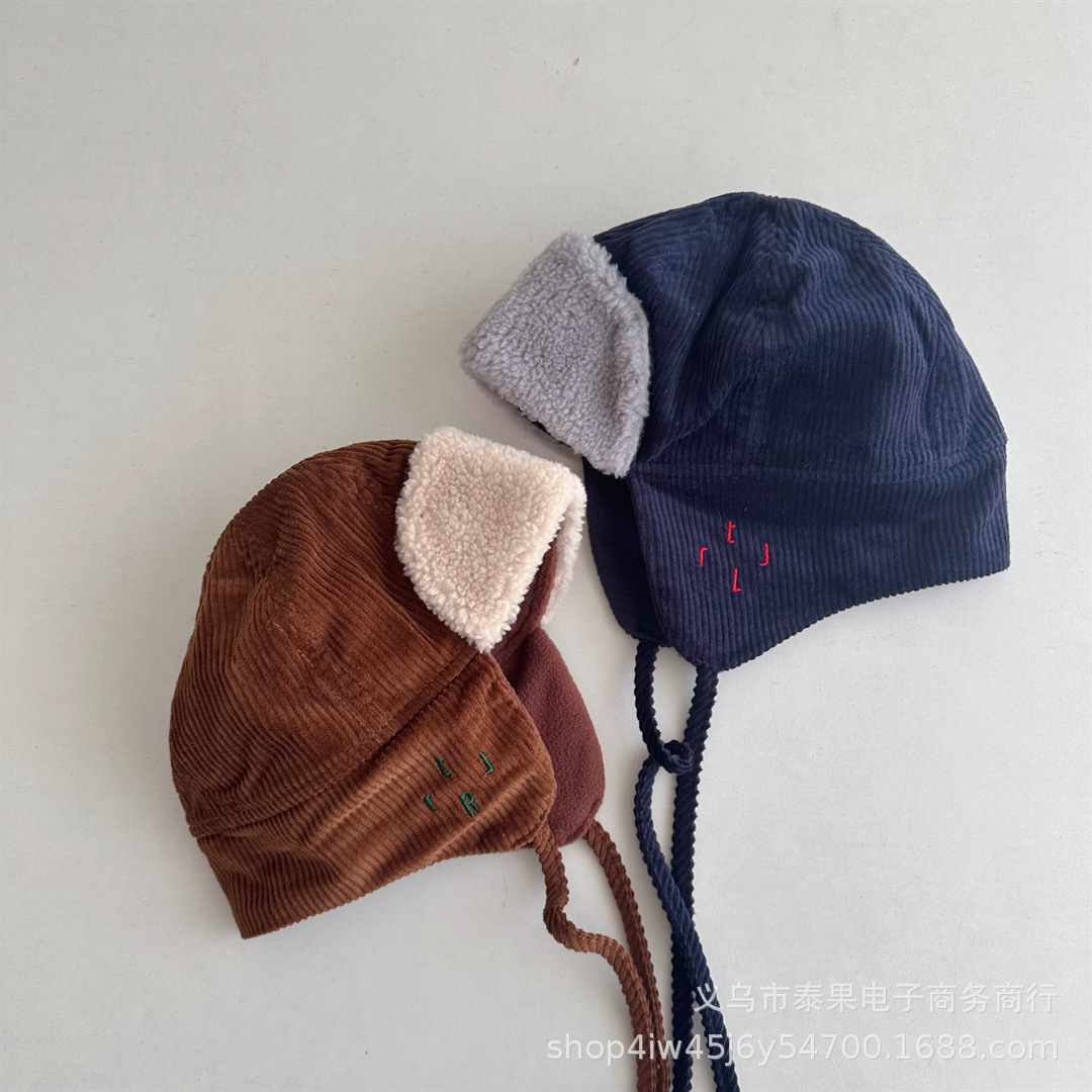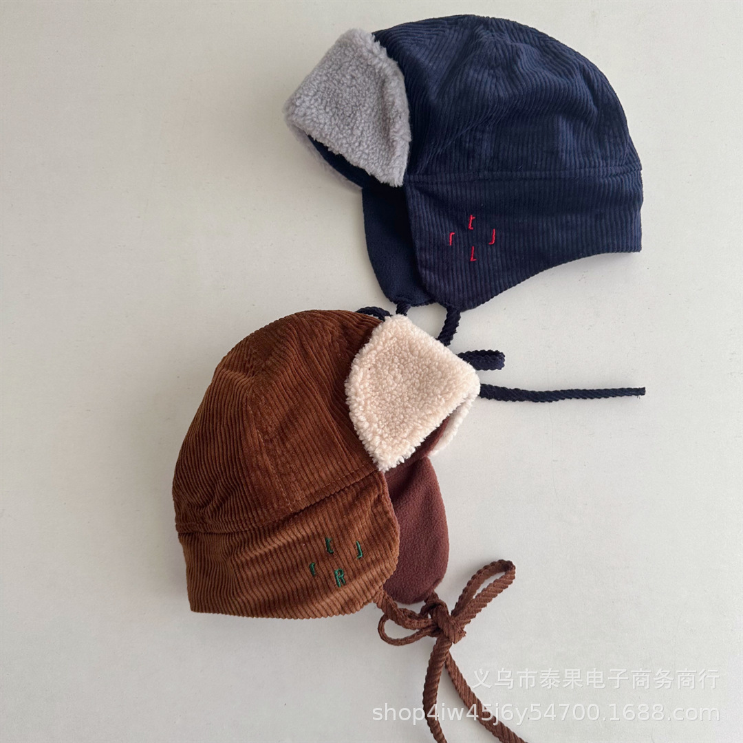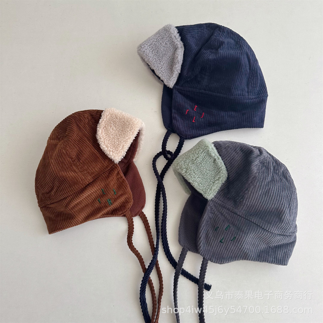 -한국 어린이 겨울 코듀로이 두꺼운 레이스 업 귀 보호 뒤집힌 레이 펑 모자 수 놓은 따뜻한 모자 소년 소녀스토어 가기