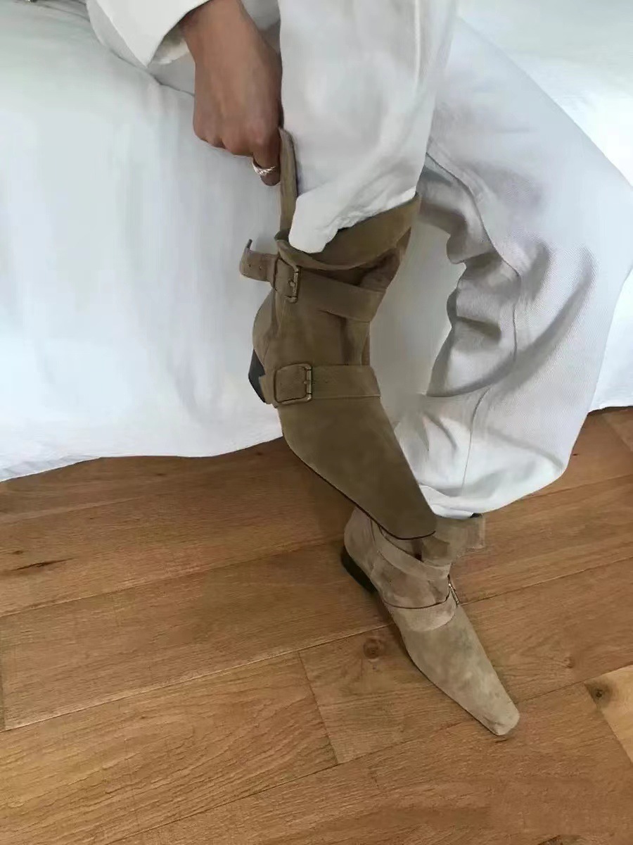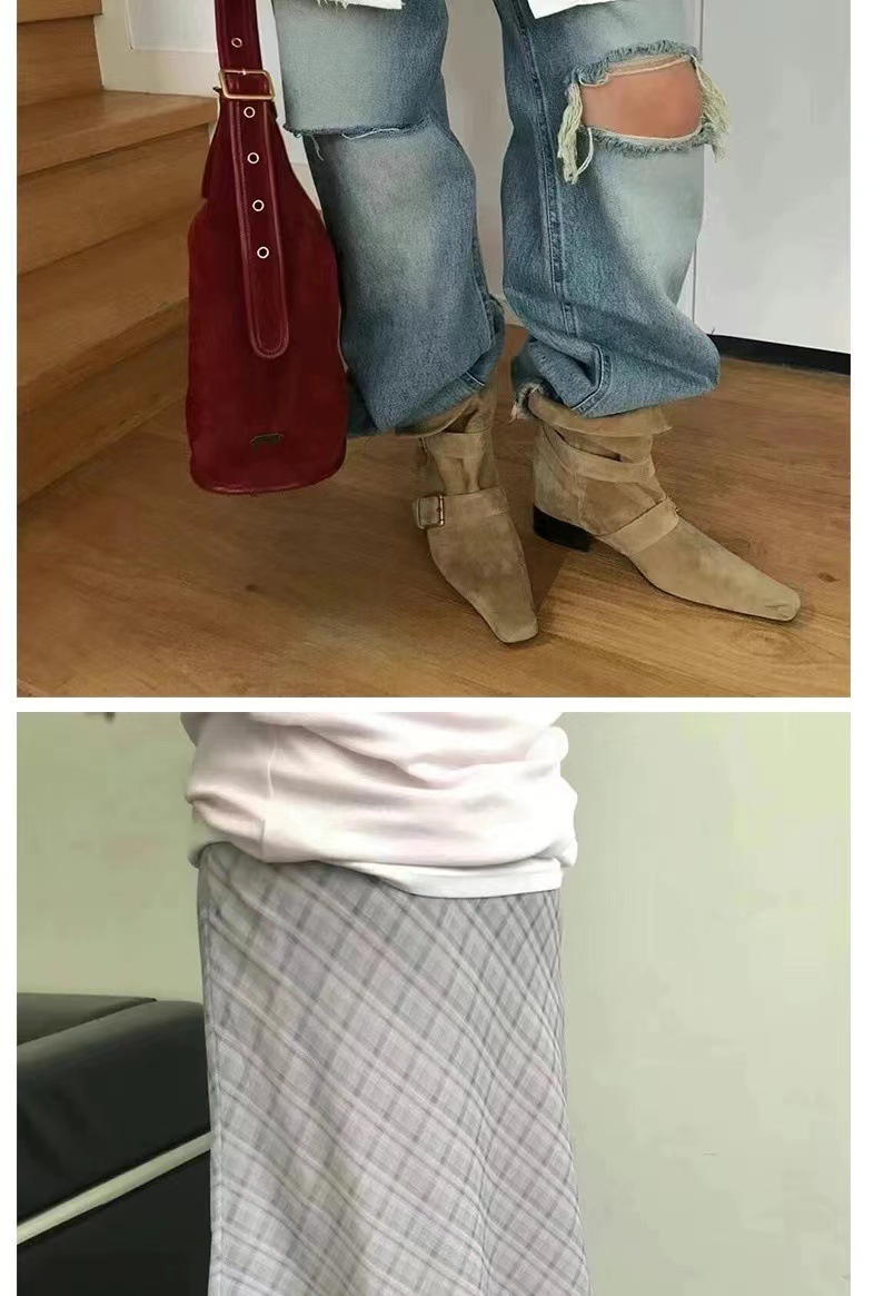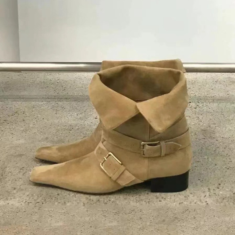 2024 가을과 겨울 새로운 스웨이드 레트로 작은 사각형 투웨어 접이식 두꺼운 힐 벨트 버클 부츠 여성용 마틴 짧은 부츠