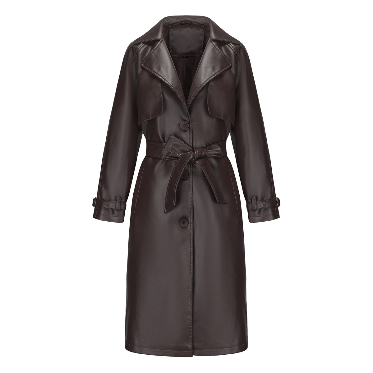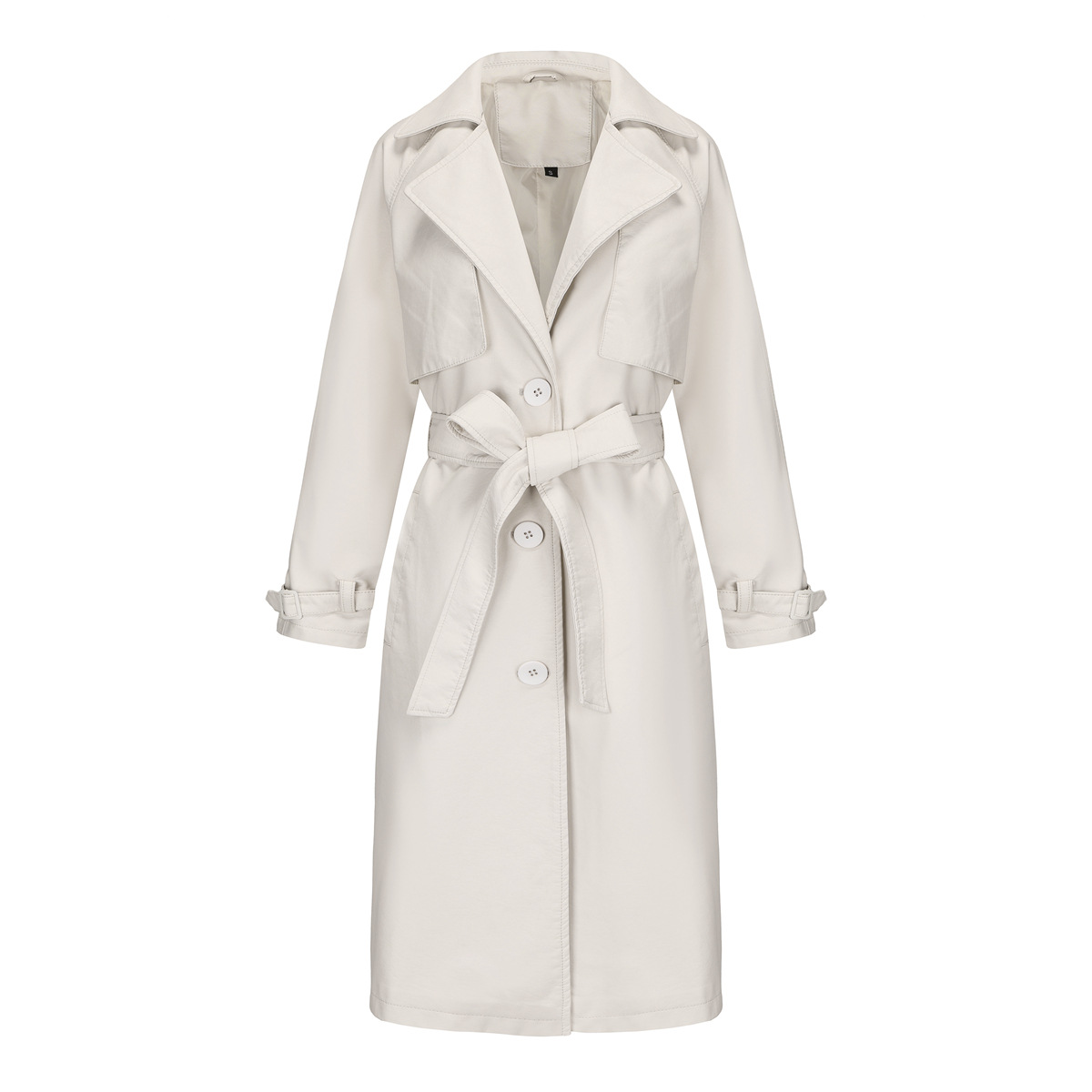 24 봄과 가을 여성 윈드 브레이커 긴 루즈 재킷 PU 가죽 여성용 오버 사이즈 클래식 옷깃 벨트