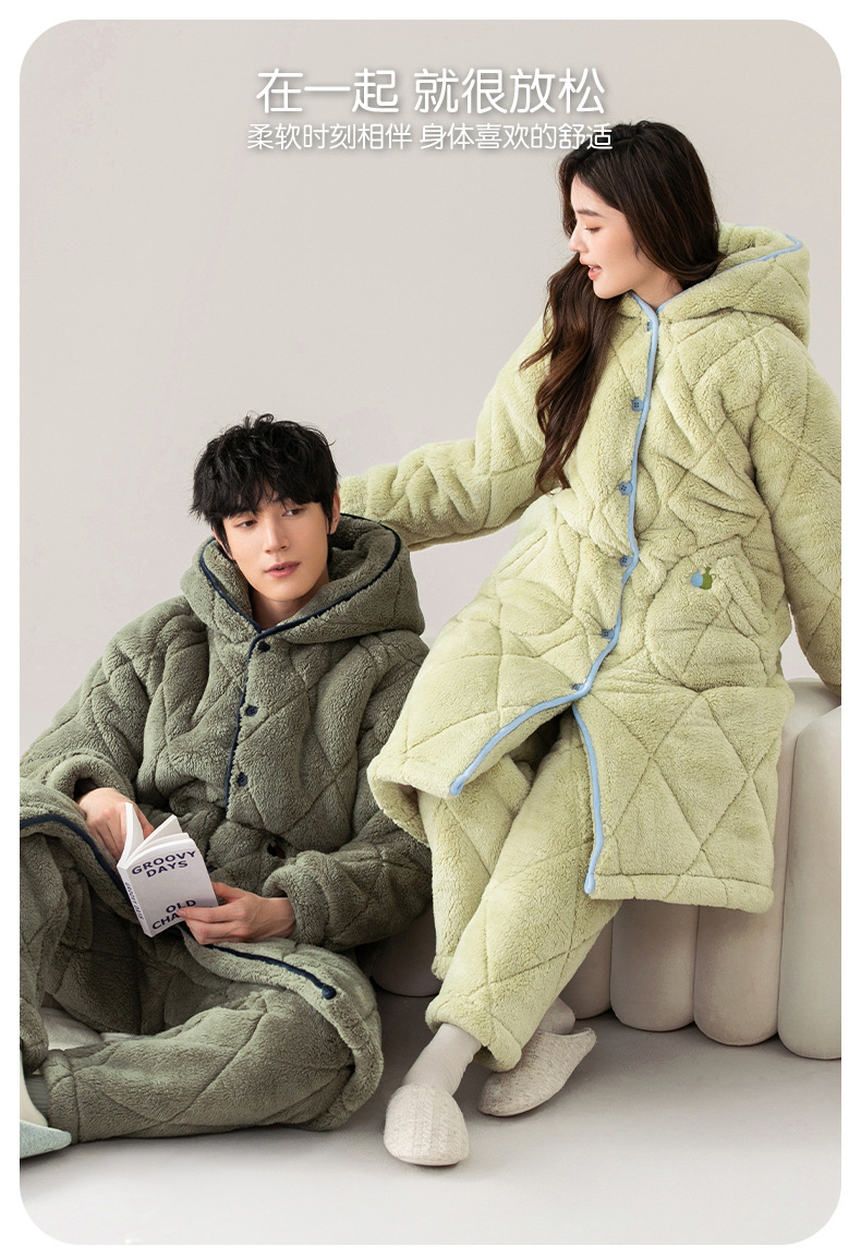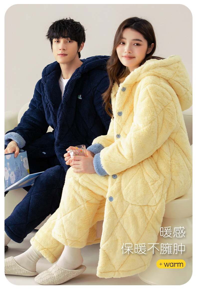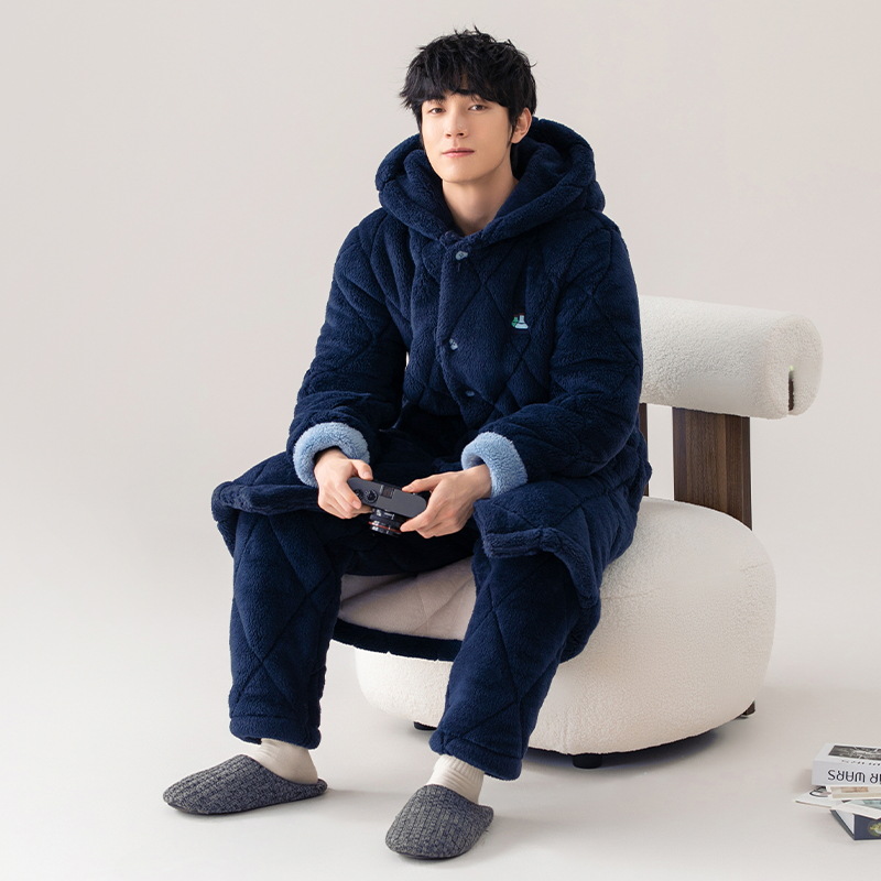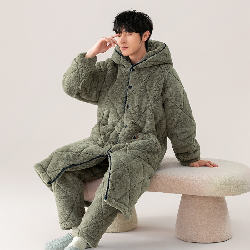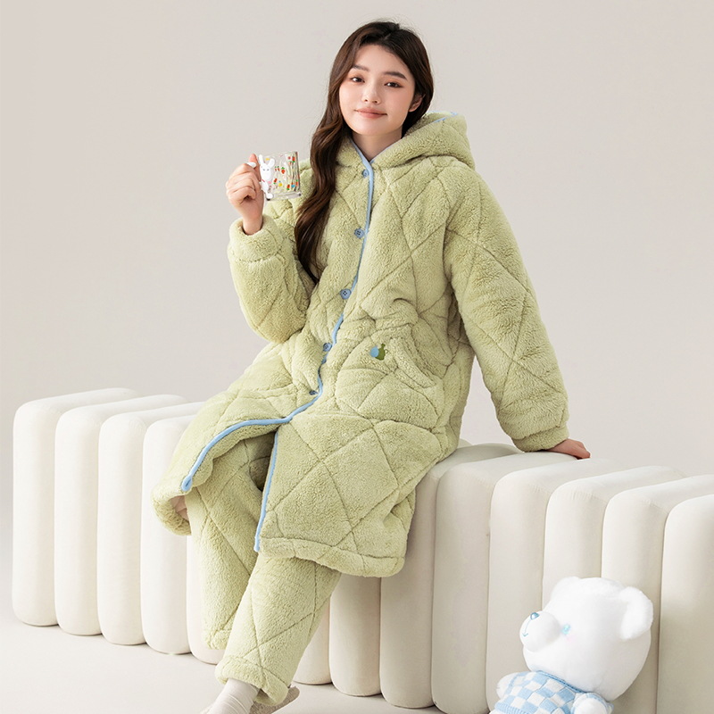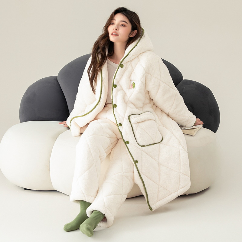 겨울 3 층 퀼트 가운 잠옷 세트 카디건 후드가 두꺼운 따뜻한 아웃도어 면화 재킷