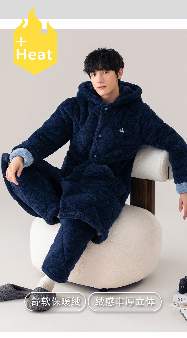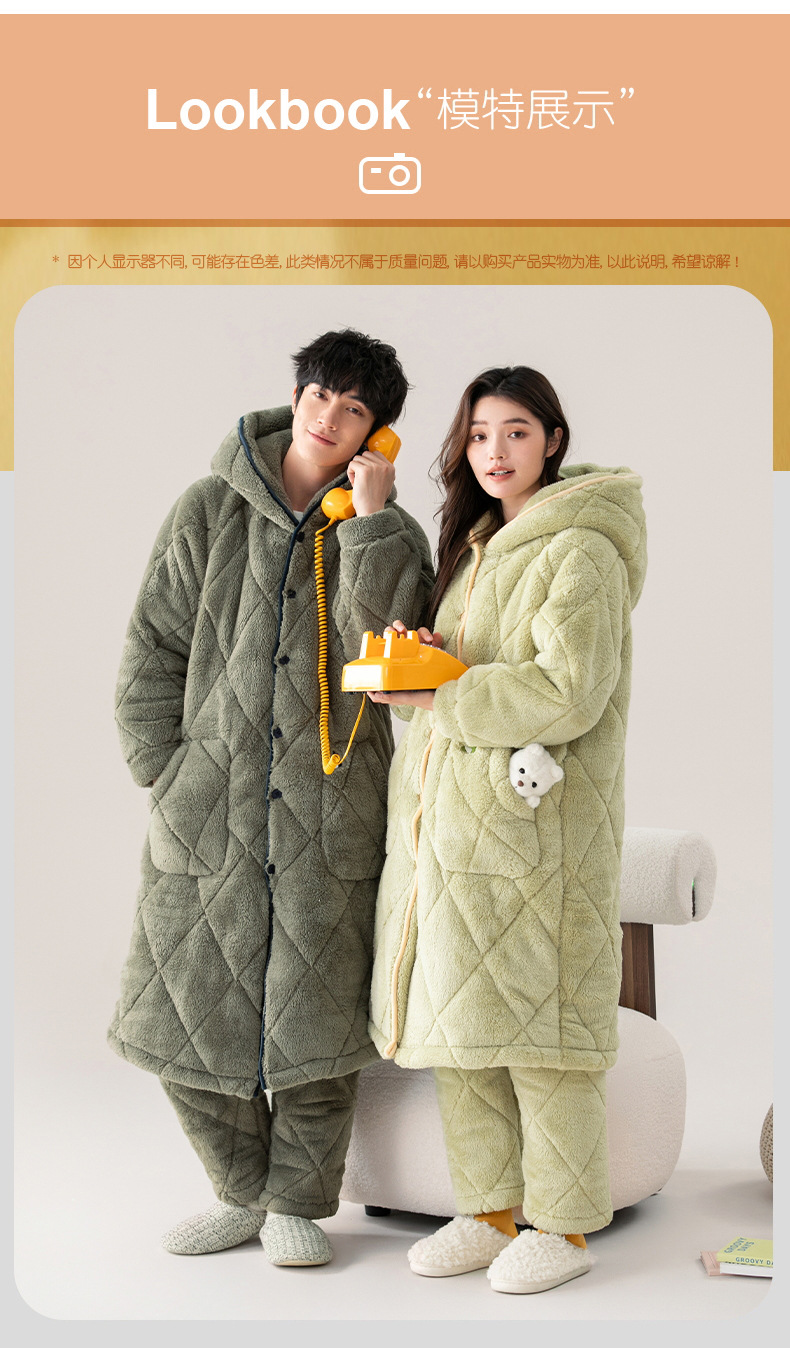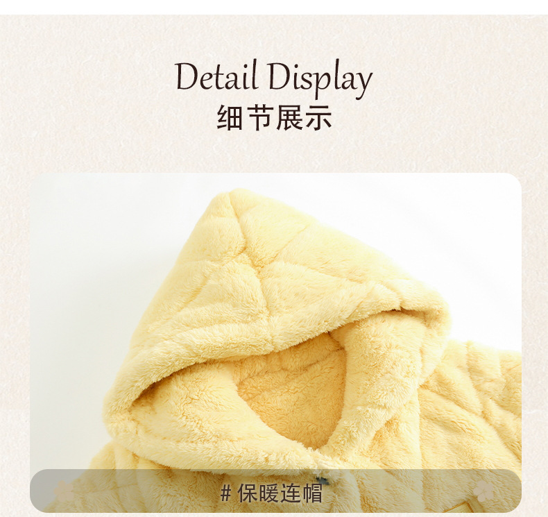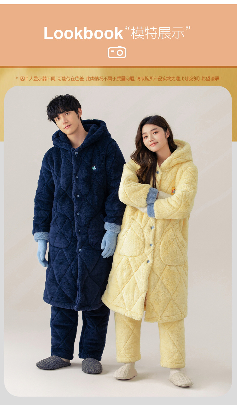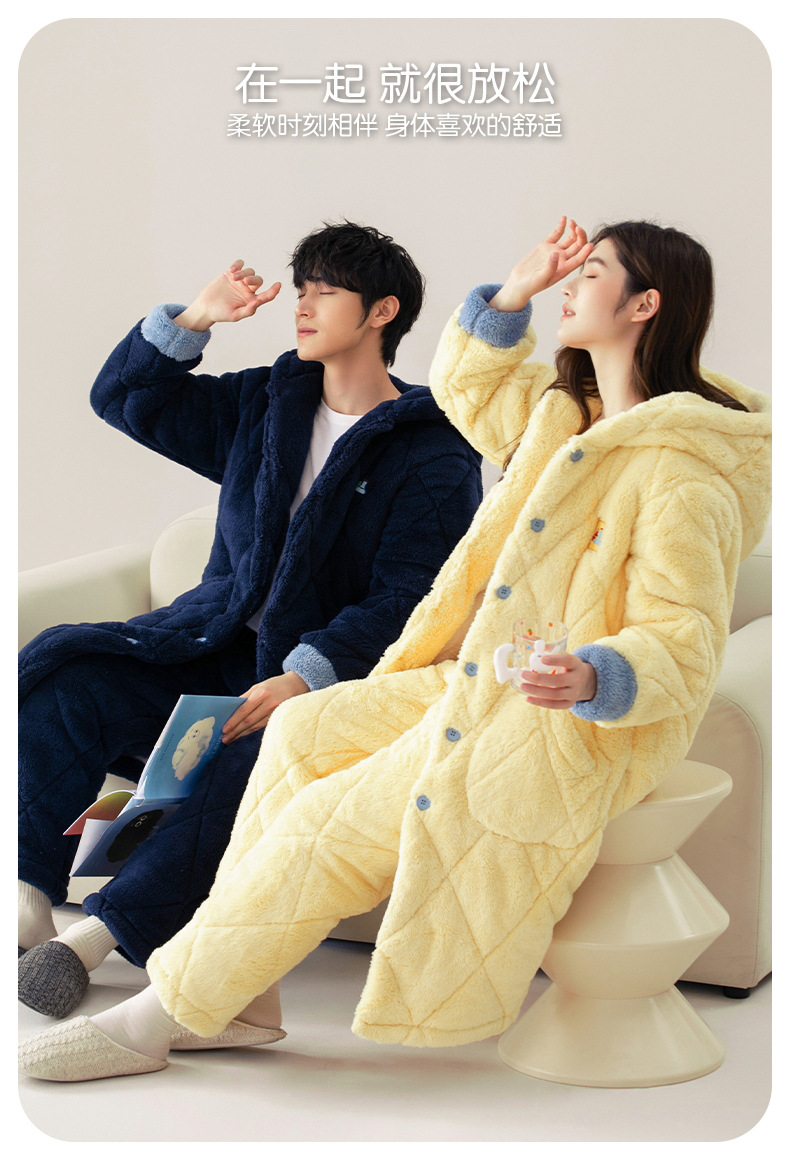 겨울 3 층 퀼트 가운 잠옷 세트 카디건 후드가 두꺼운 따뜻한 아웃도어 면화 재킷