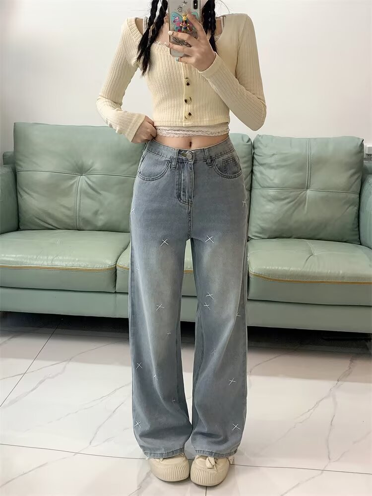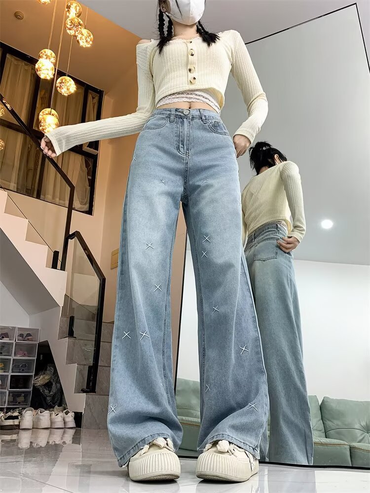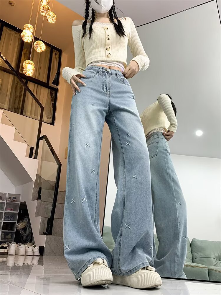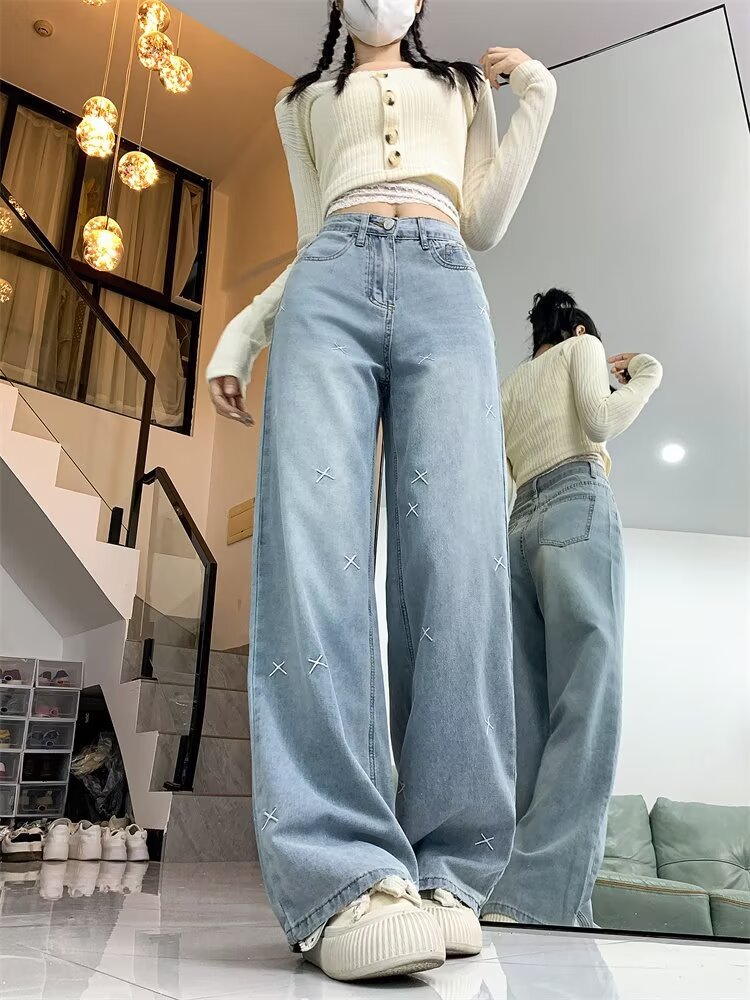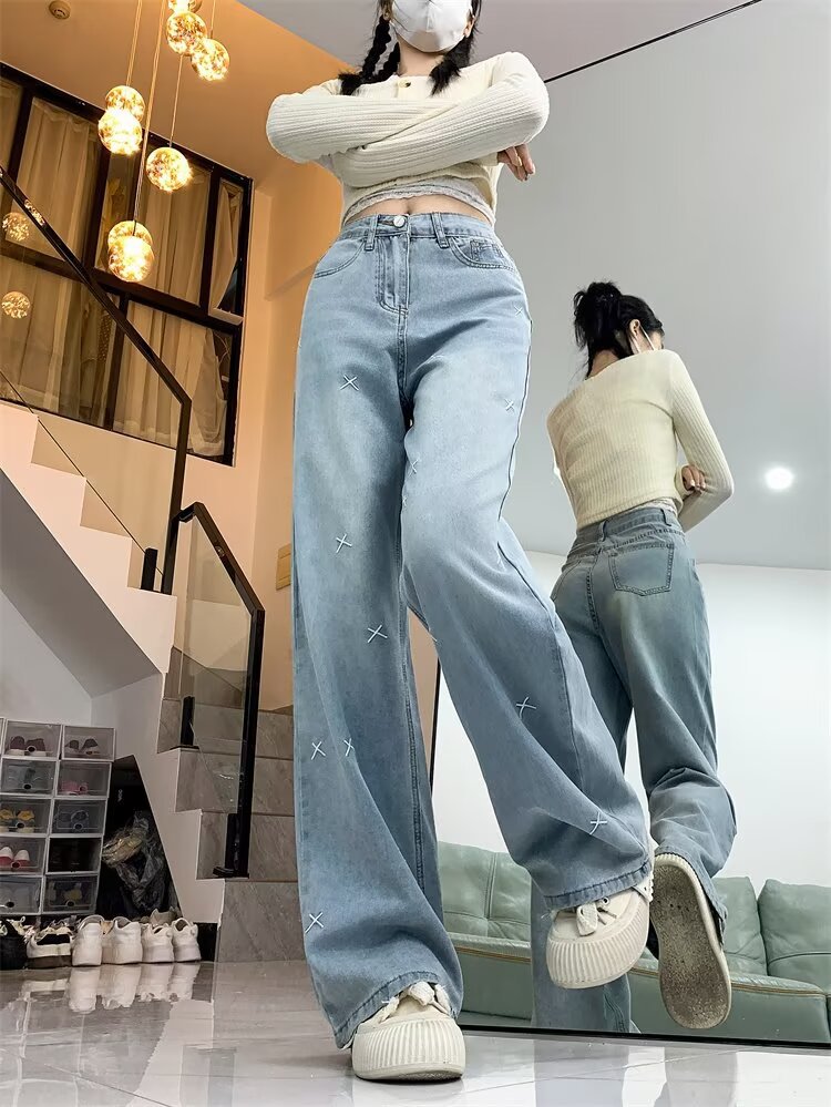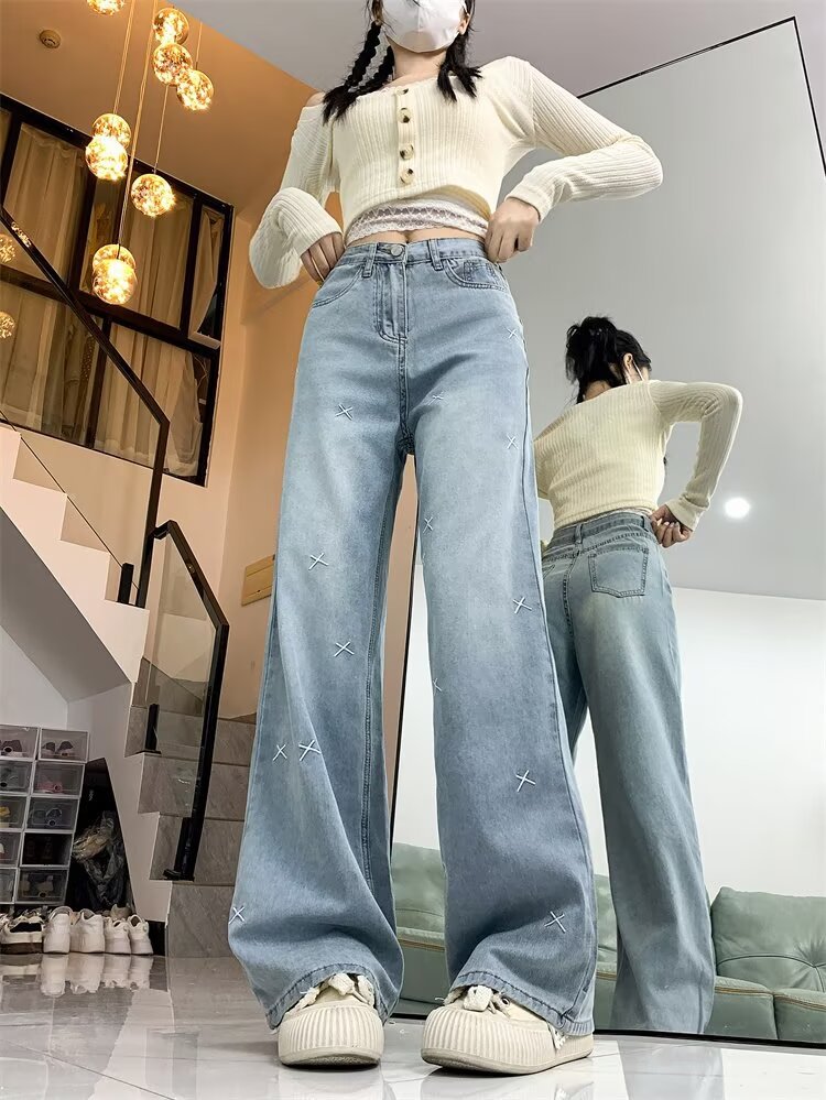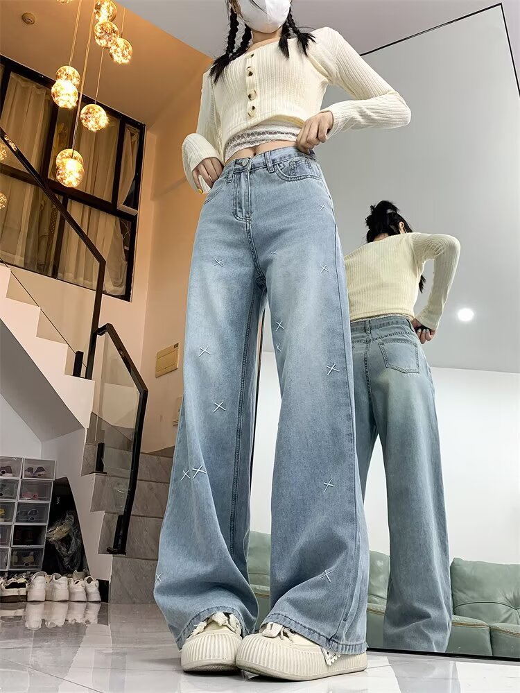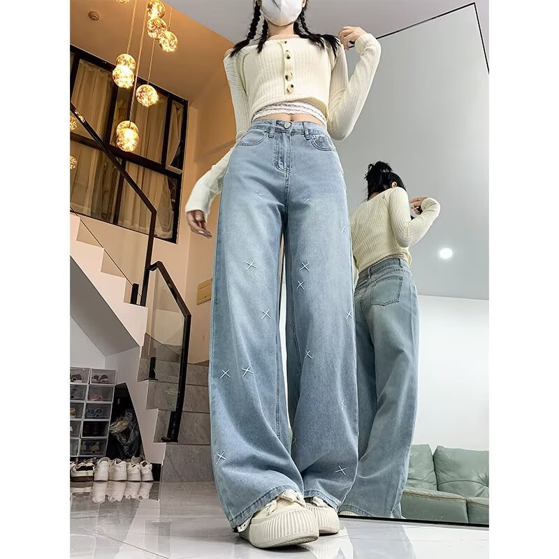 라이트 블루 넓은 다리 청바지 여자 가을 2024 새로운 높은 허리 느슨한 슬리밍 올매치 스트레이트 롱 팬츠스토어 가기