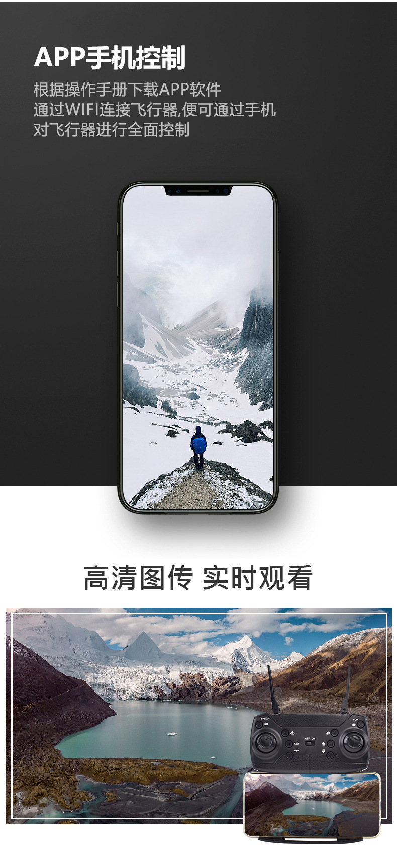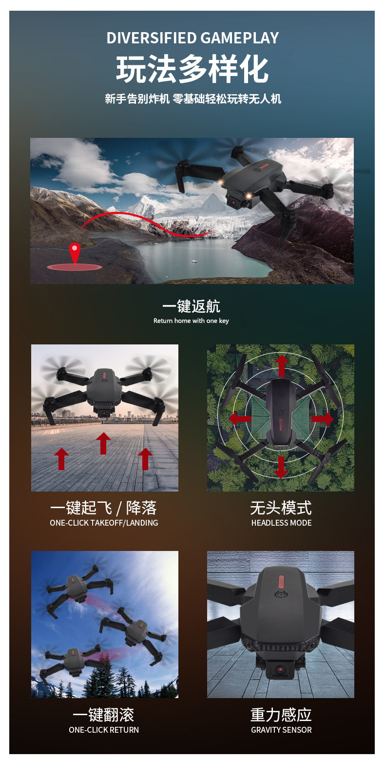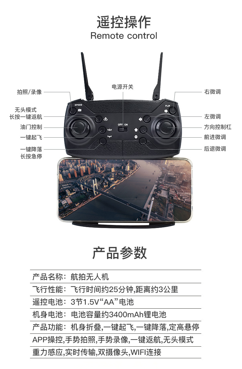 产品功能 折叠四轴,空中定高,上升/下降, 左转/右转,前进/后退左右侧飞,3D翻滚 ,翻滚转换,无头模式,WiFi摄像头录像/拍照/双摄像头/