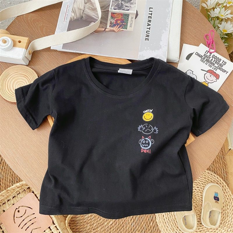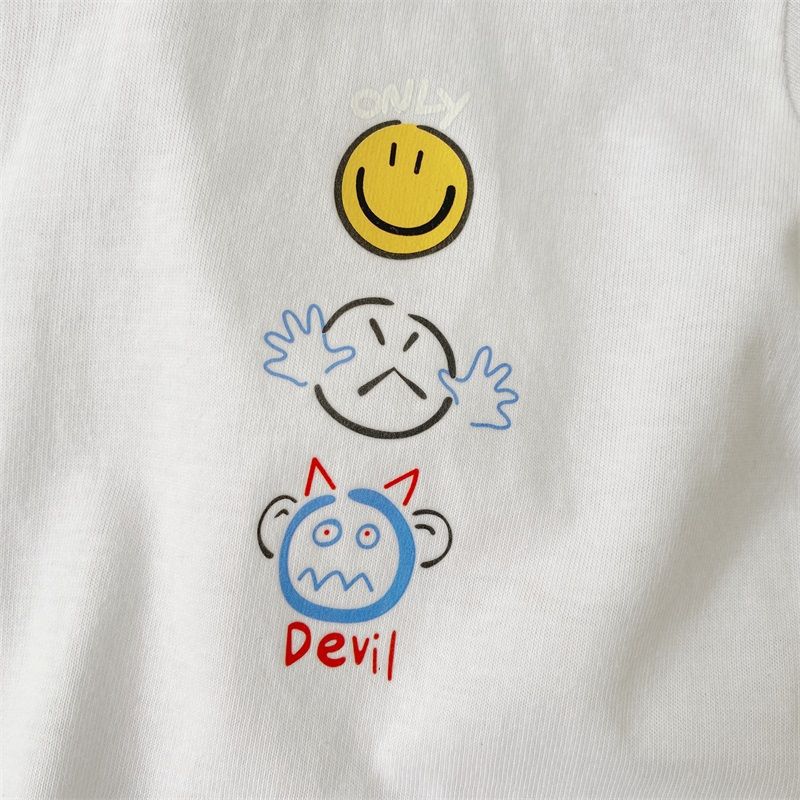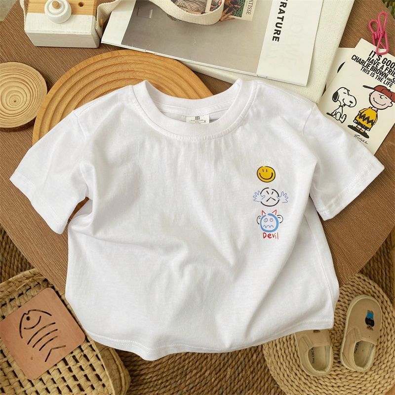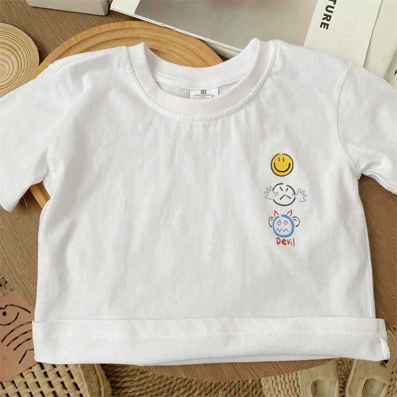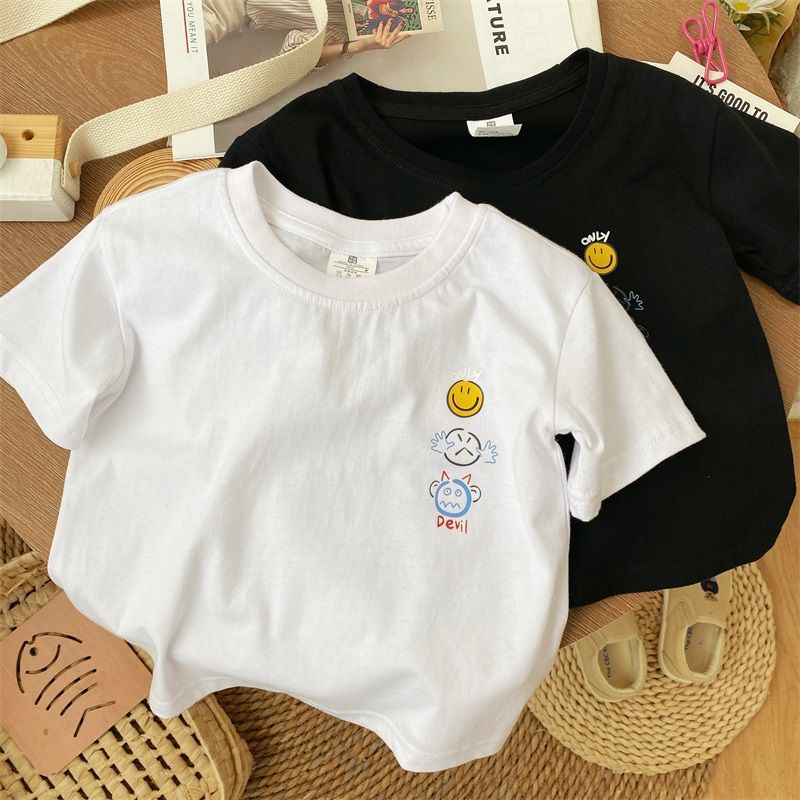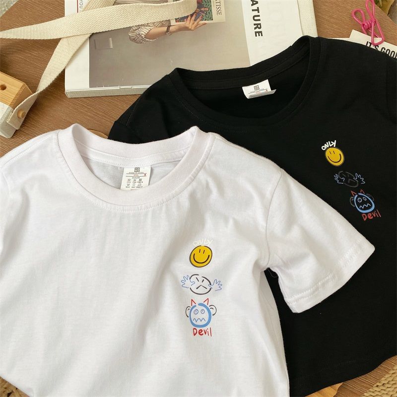 아동복 여름 어린이 새 만화 스마일리 순수 반팔 느슨한 스타일 티셔츠 소년 소녀 아기의 최고 트렌디 T스토어 가기