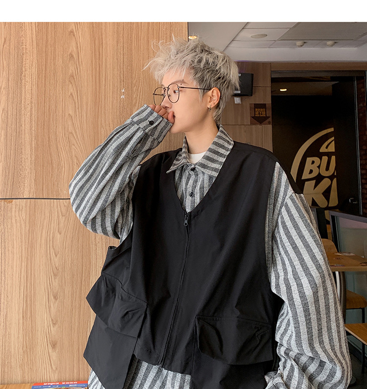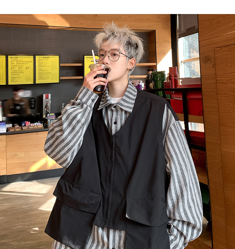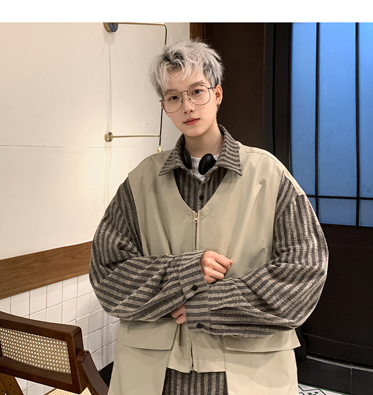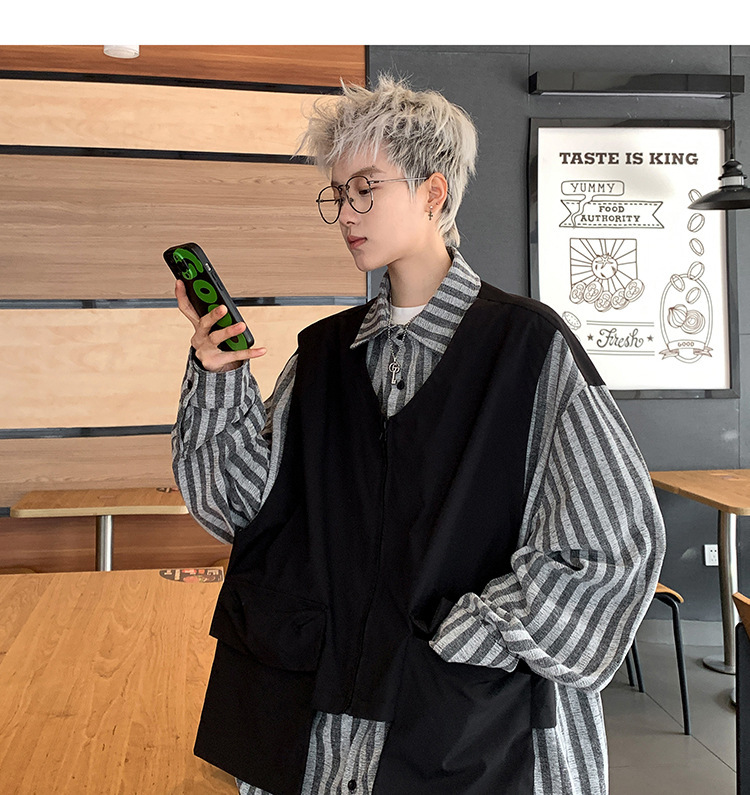 가짜 투피스 긴팔 셔츠 남자 2024 년 새 봄과 가을 레트로 스트라이프 오버 사이즈 탑스토어 가기