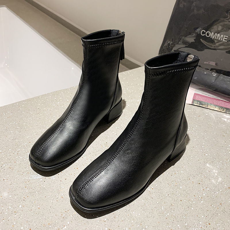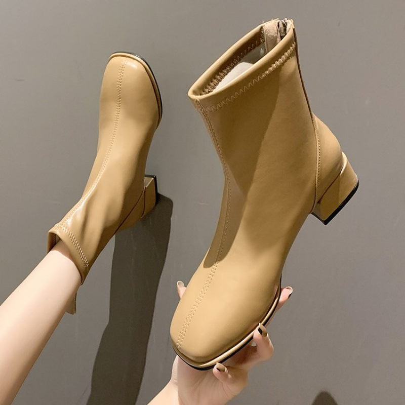 소프트 가죽 미드 힐 세련된 쇼트 부츠 여성의 2024 새로운 가을 및 겨울 올 매치 마틴 패션 세련된 두꺼운 힐 얇은 부츠