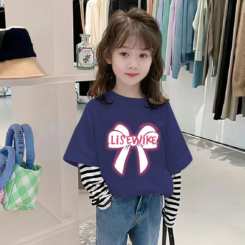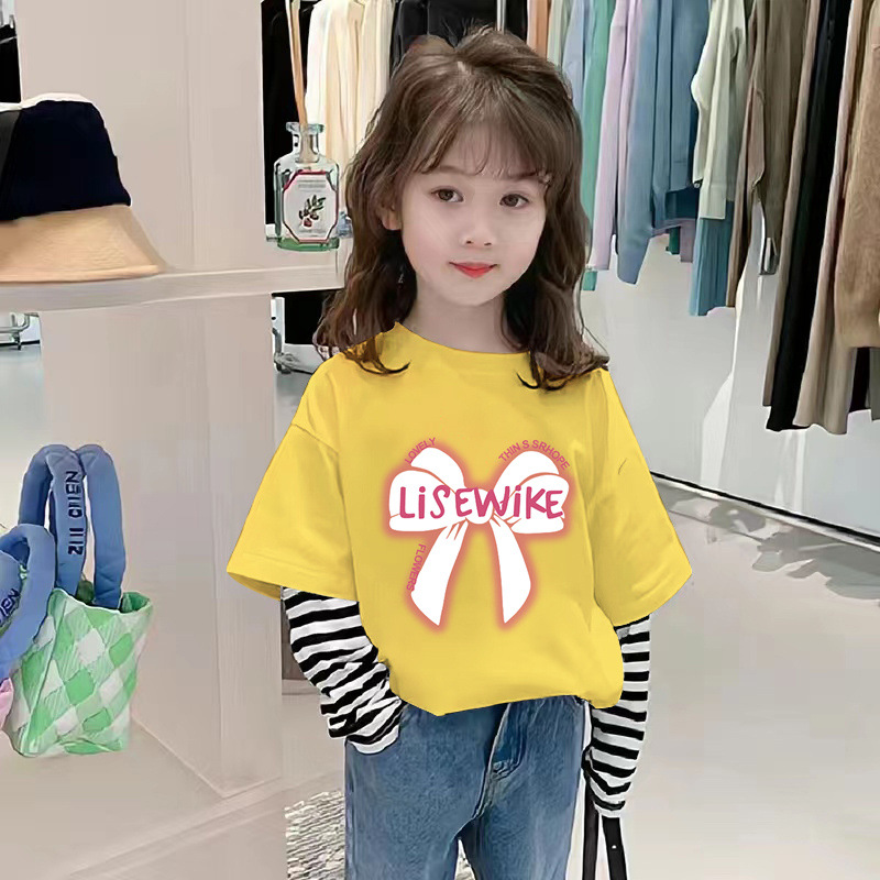 G2413 # 여자 가을 가짜 두 개의 새로운 외국 스타일 어린이 긴팔 면화 티셔츠 봄과 가을 어린이 캐주얼 티셔츠