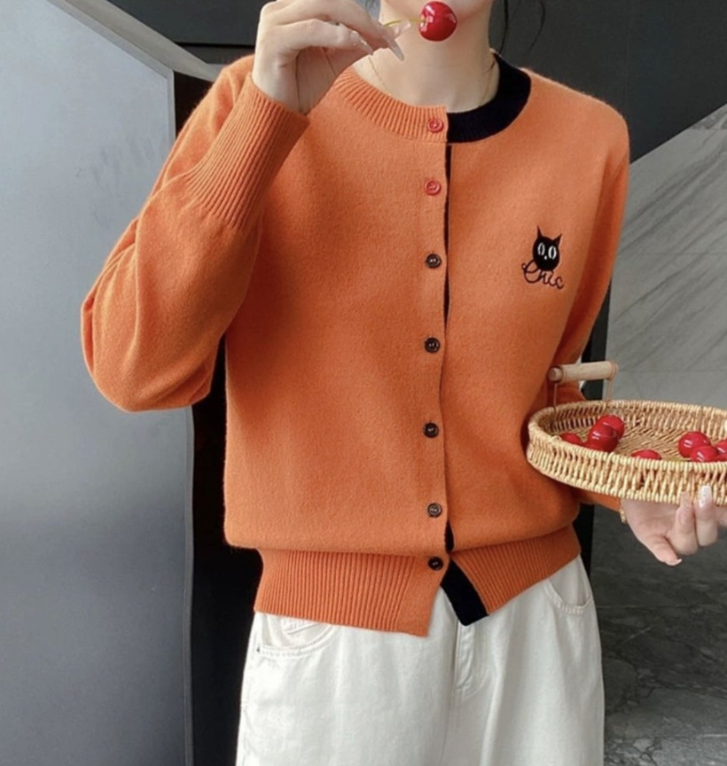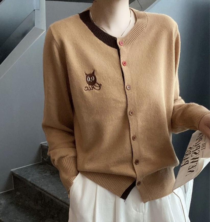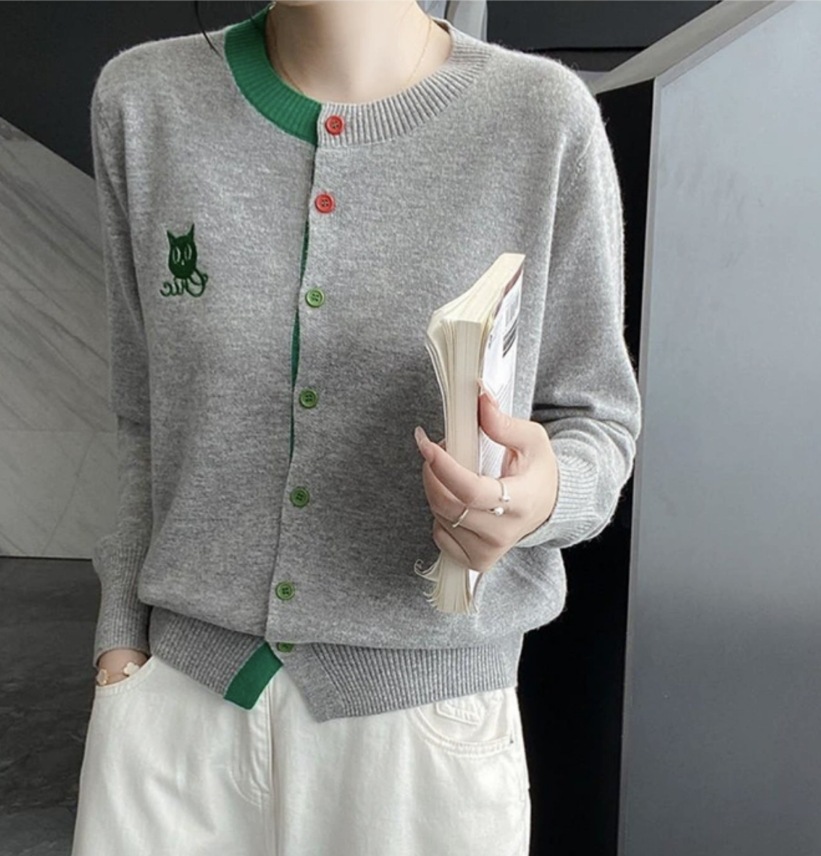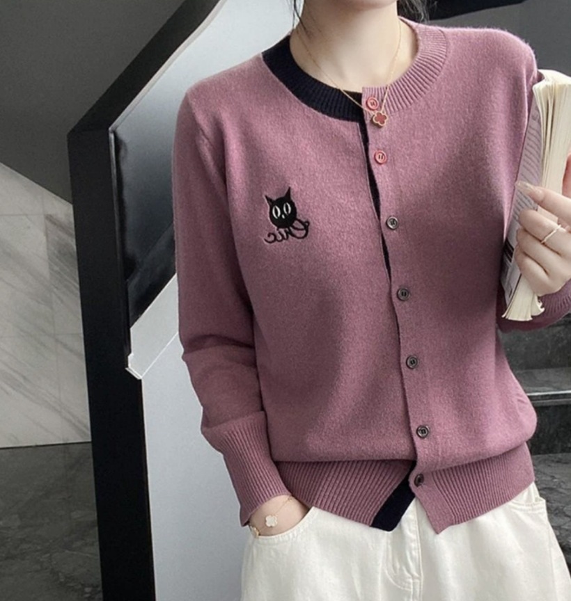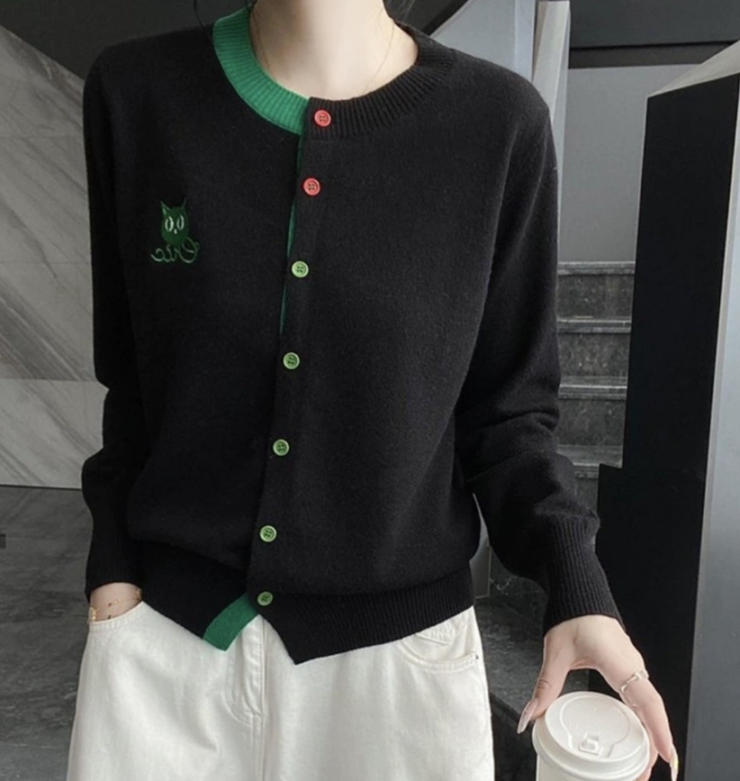 유럽 스타일 2025 가을 신상 고양이 자수 컬러풀 싱글 버튼 배색 니트 가디건 긴팔 여성용 코트스토어 가기