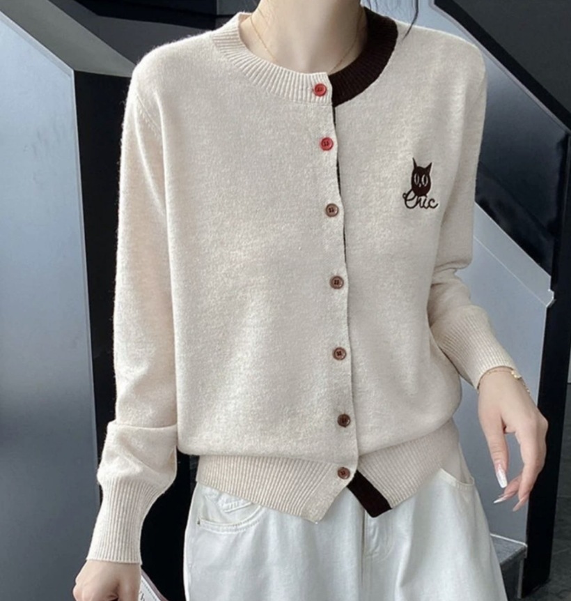 유럽 스타일 2025 가을 신상 고양이 자수 컬러풀 싱글 버튼 배색 니트 가디건 긴팔 여성용 코트