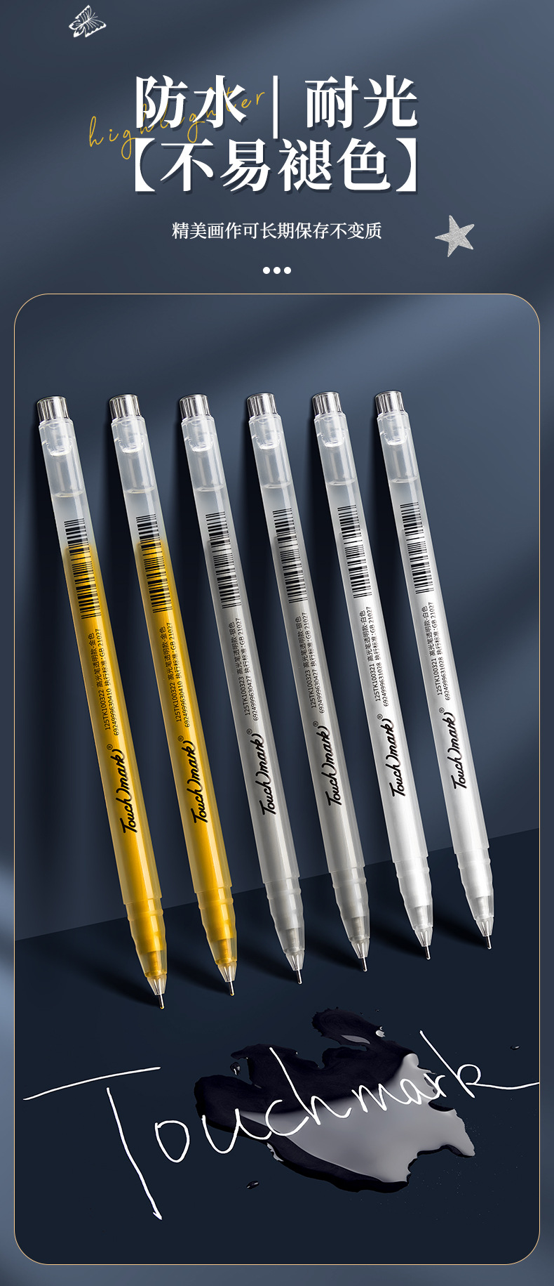 터치 마크 하이라이트 펜 황금 흰색 실버 1.0mm 펜촉 많은 양의 잉크 장식 학생 예술 하이라이트 펜스토어 가기