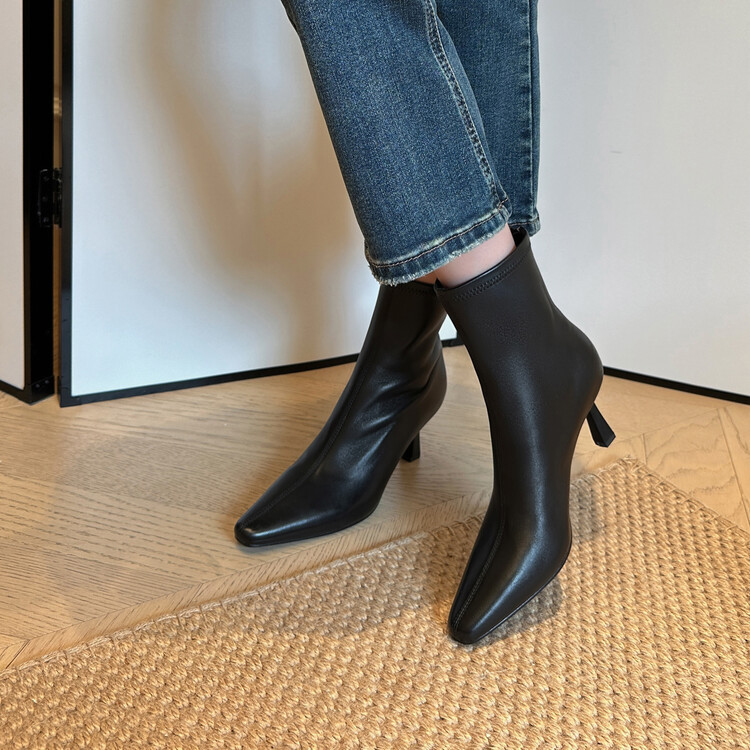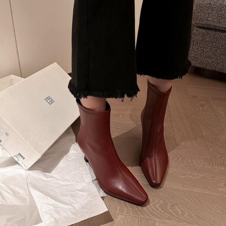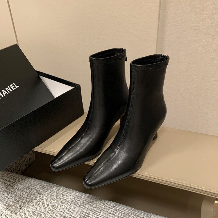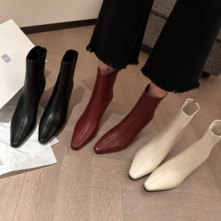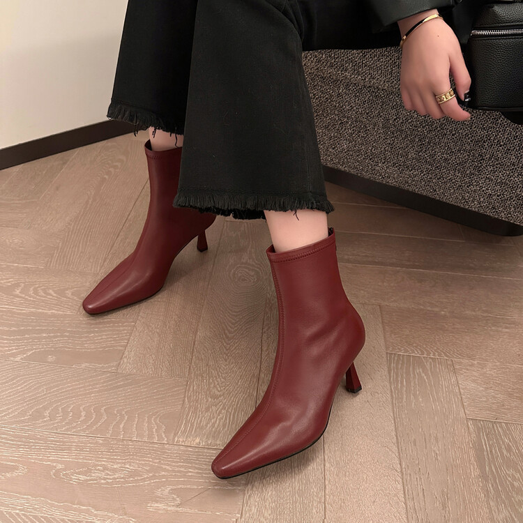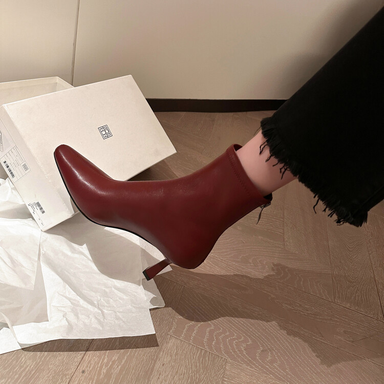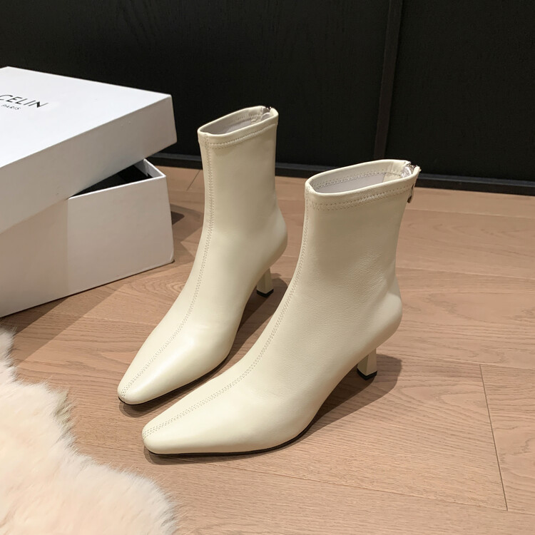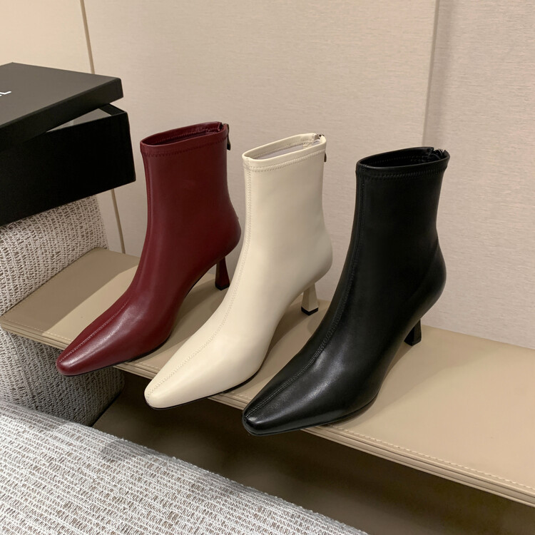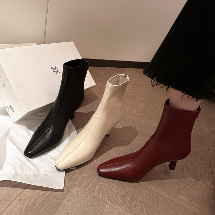 양가죽 작은 발목 부츠 여성용 하이힐 싱글 부츠 가을 및 겨울 뉴 스퀘어 헤드 리어 지퍼 얇은 힐 여성용 발목 부츠 소프트 가죽 발목 부츠