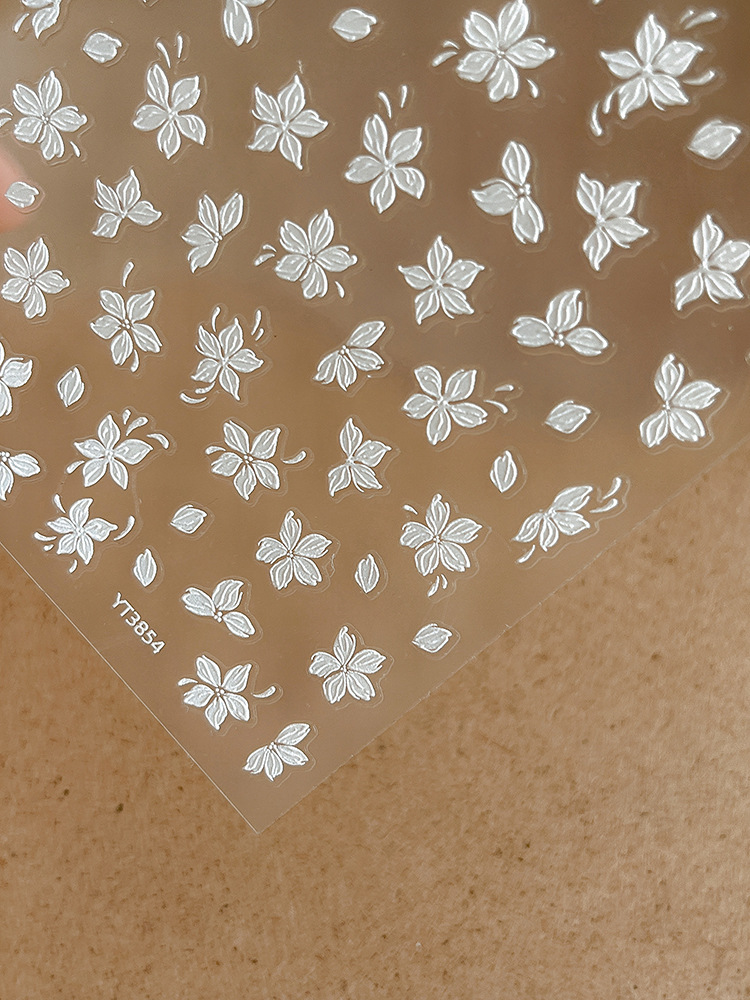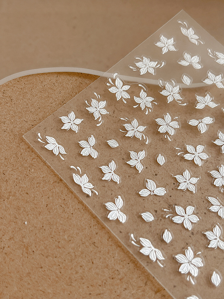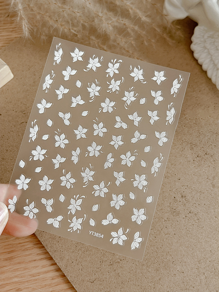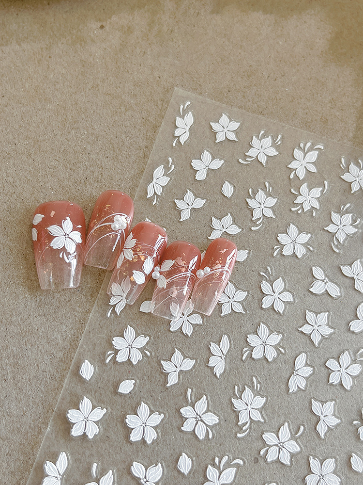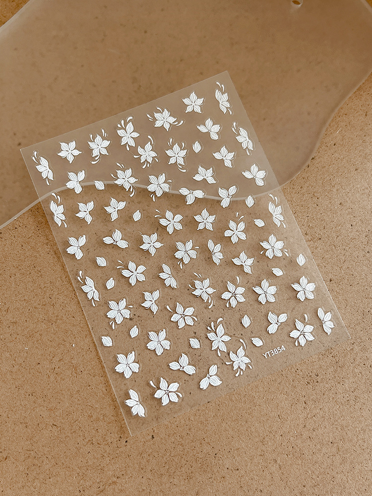 절묘한 작은 흰색 꽃 네일 아트 스티커 5 꽃잎 꽃 작은 신선한 체크 릴리프 접착제 네일 장식 도매스토어 가기