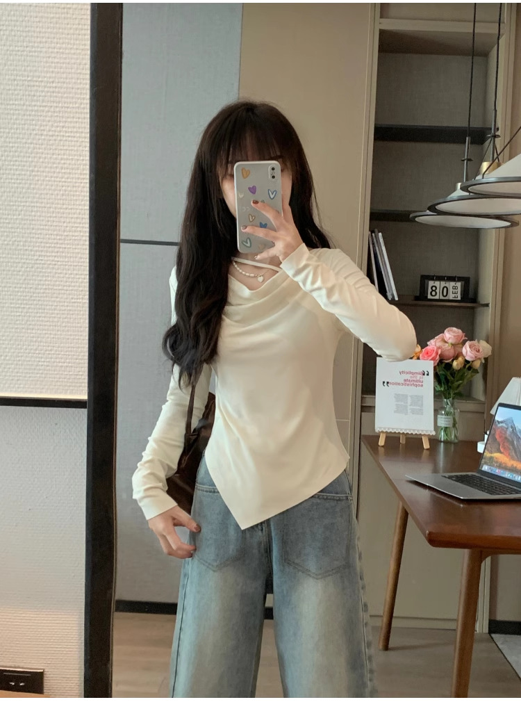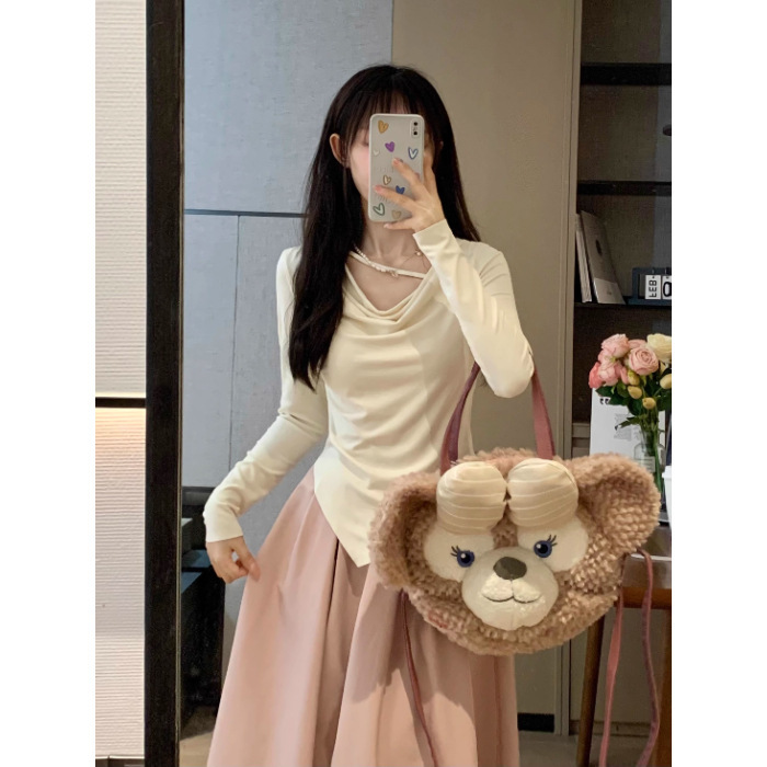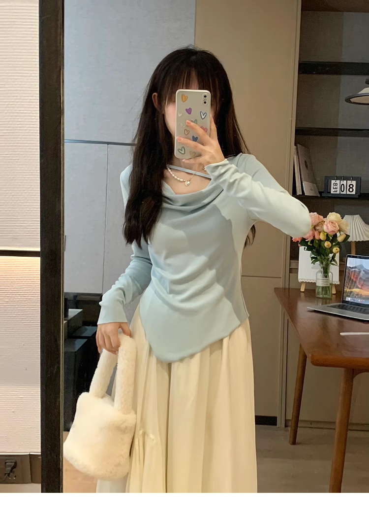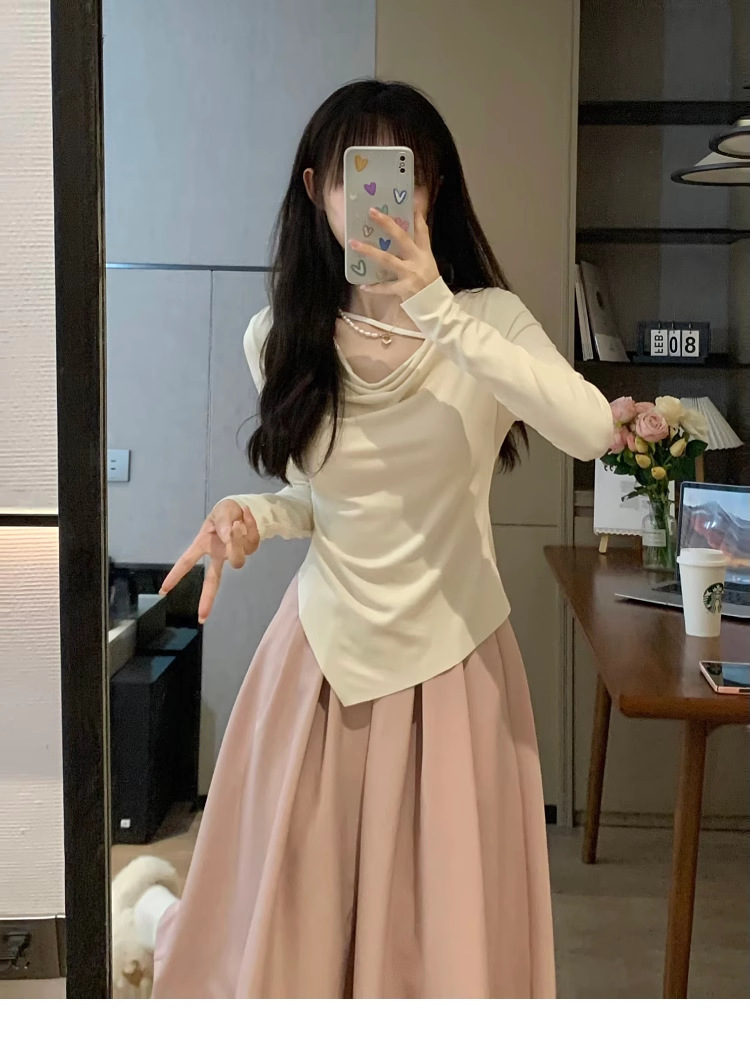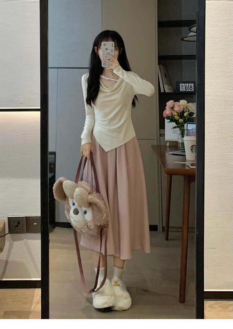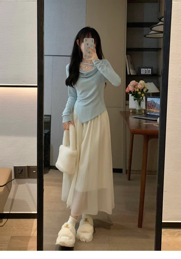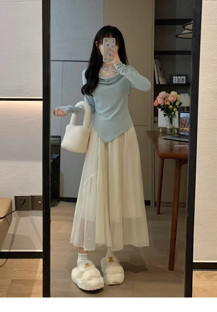 부드러운 스타일 세트 불규칙한 긴팔 티셔츠 최고 여성 가을 높은 허리 A 라인 스커트 치마 우아한 투피스 세트
