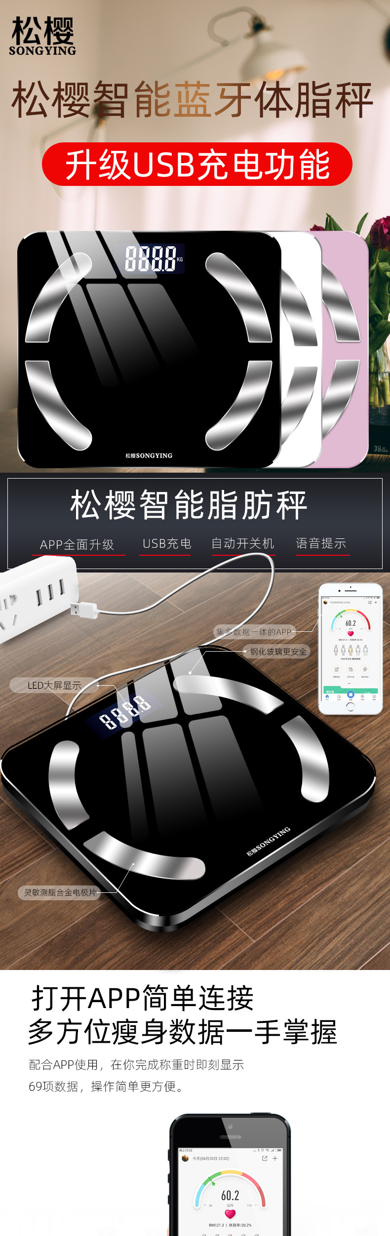 홈 충전 스마트 블루투스 지방 규모 APP 무게 스케일 전자 스케일 홈 건강 규모 체중 감량 머리카락 세대스토어 가기