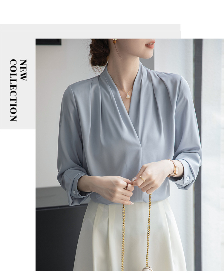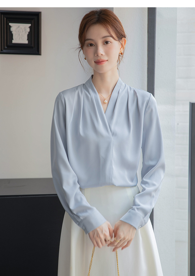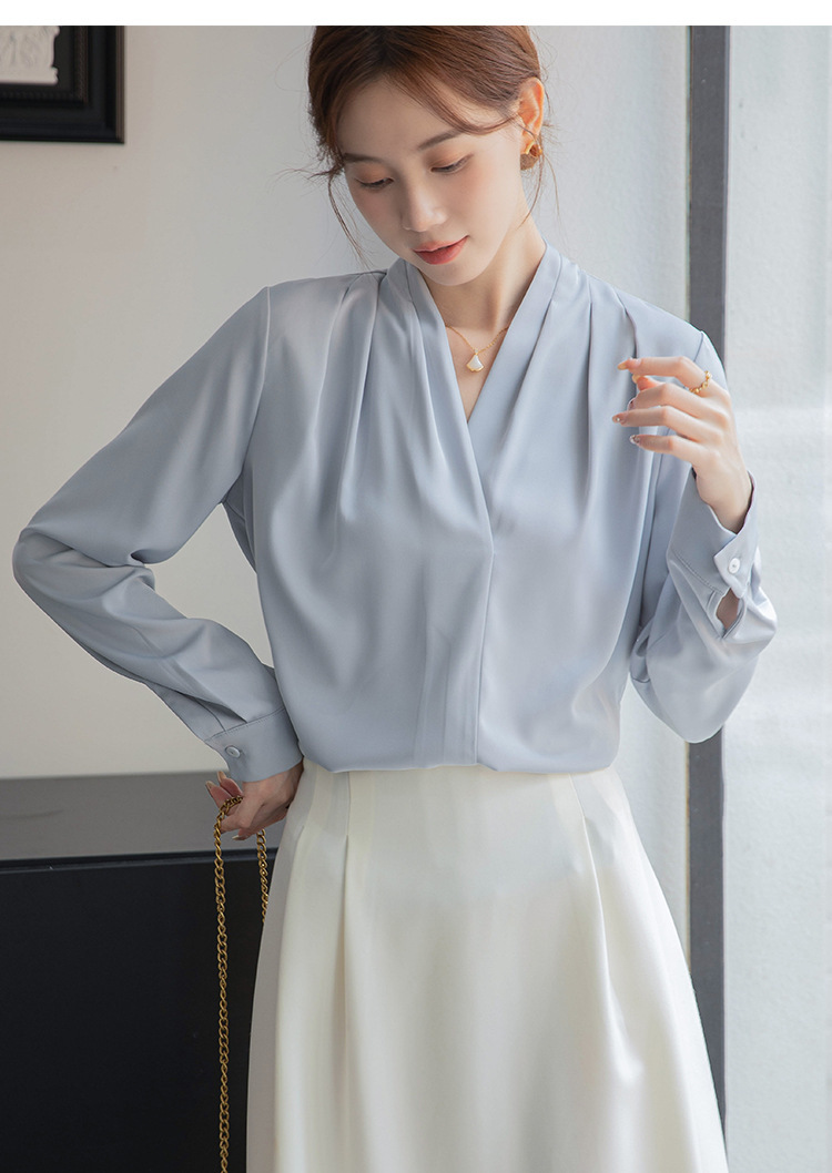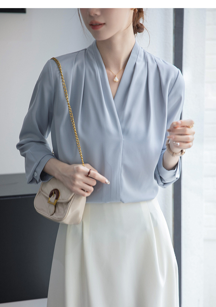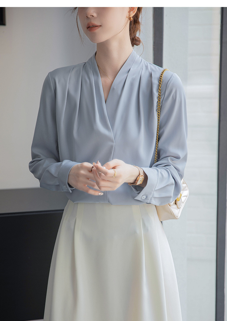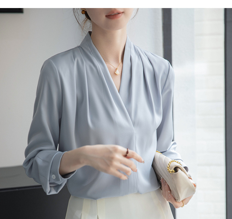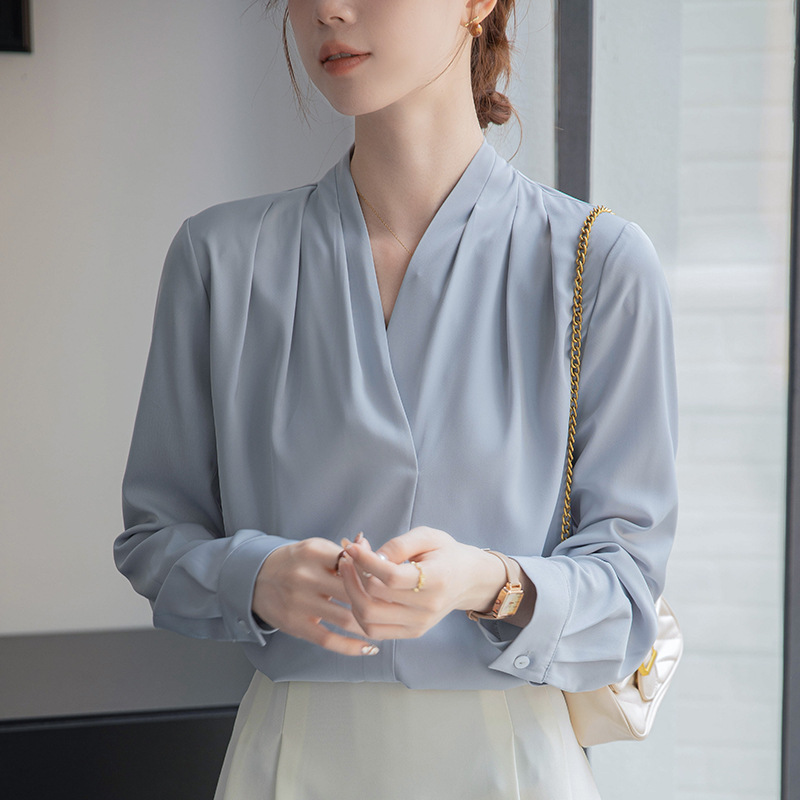 블루 그레이 V 넥 셔츠 여성용 긴팔 가을 착용 라이트 성숙한 스타일 직장 통근 교육 경력 입고 인터뷰 원피스스토어 가기