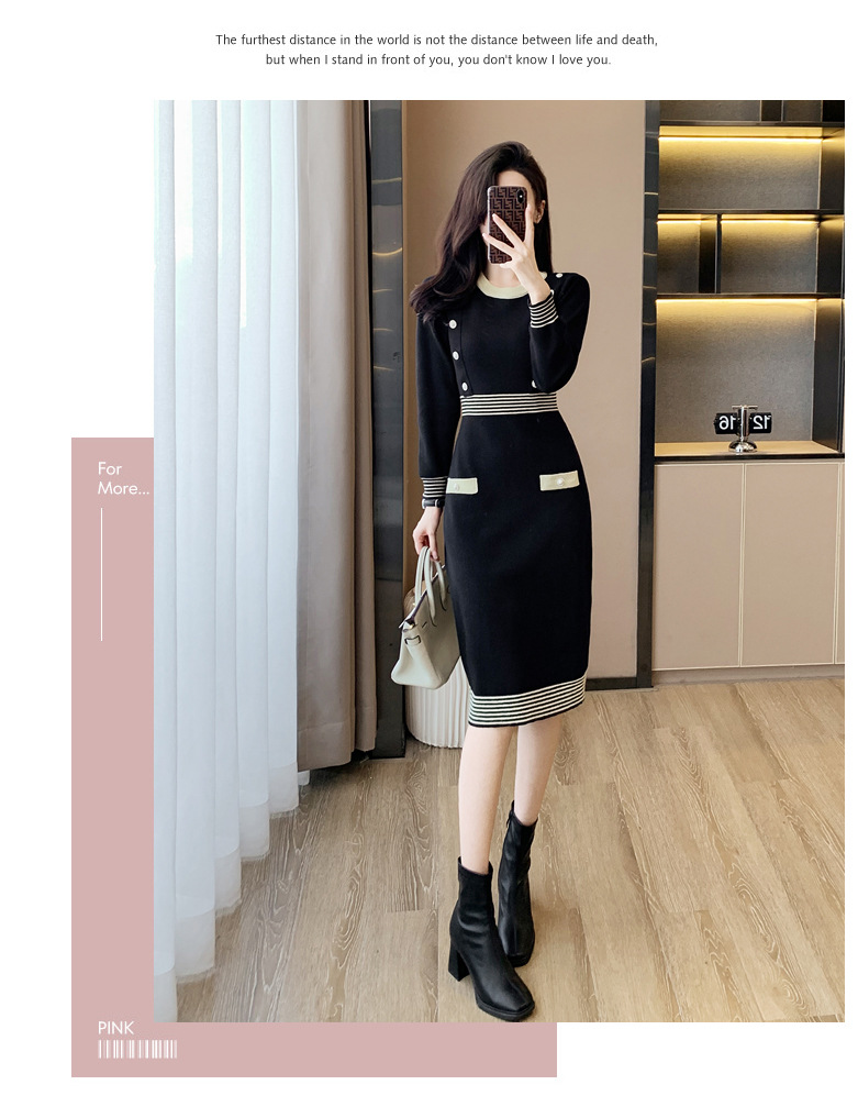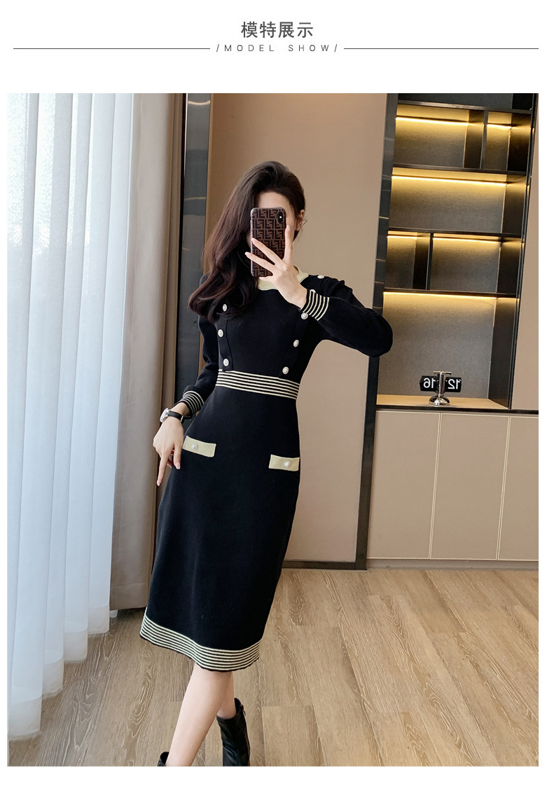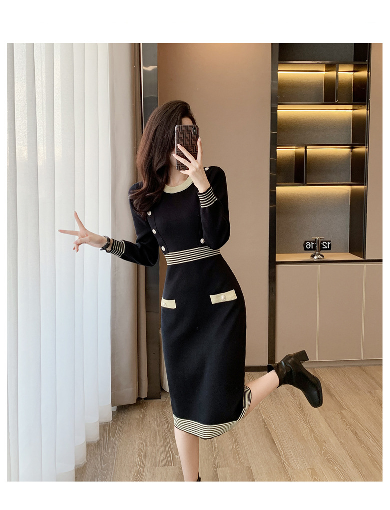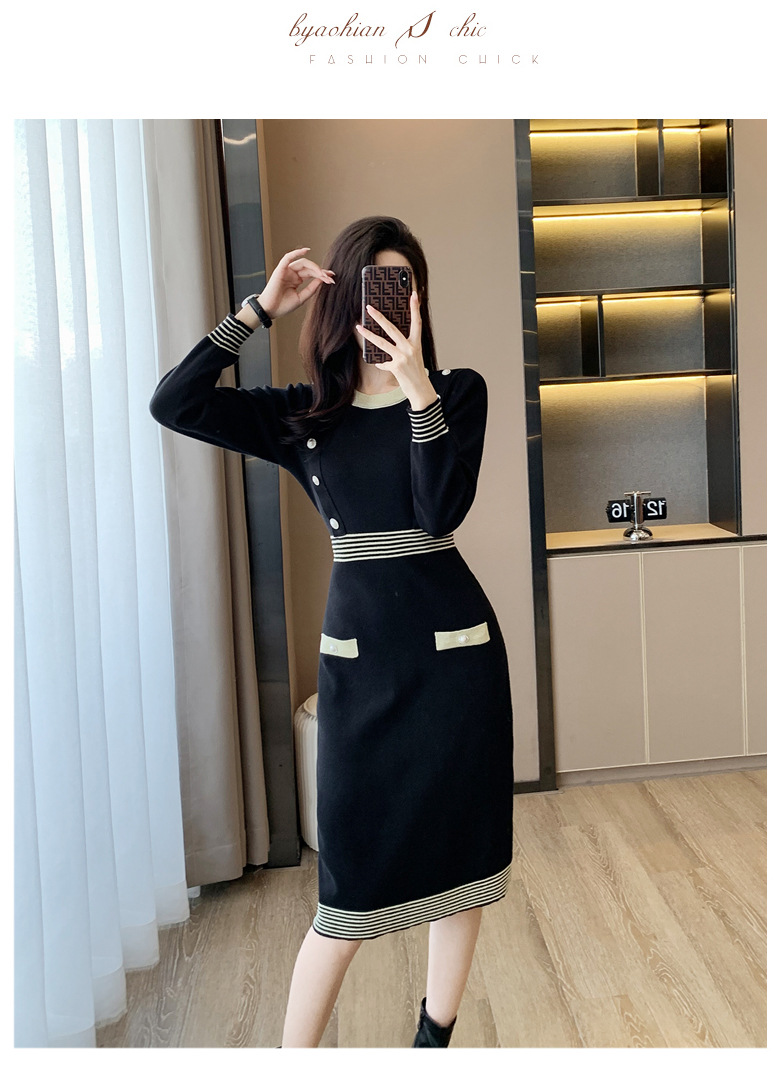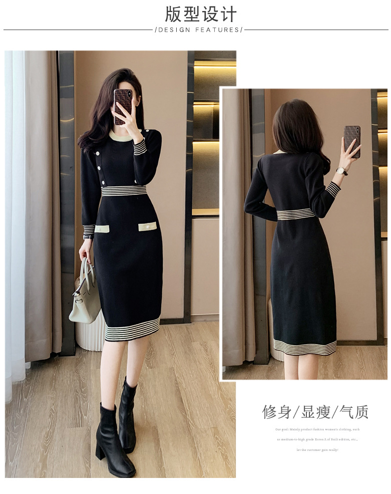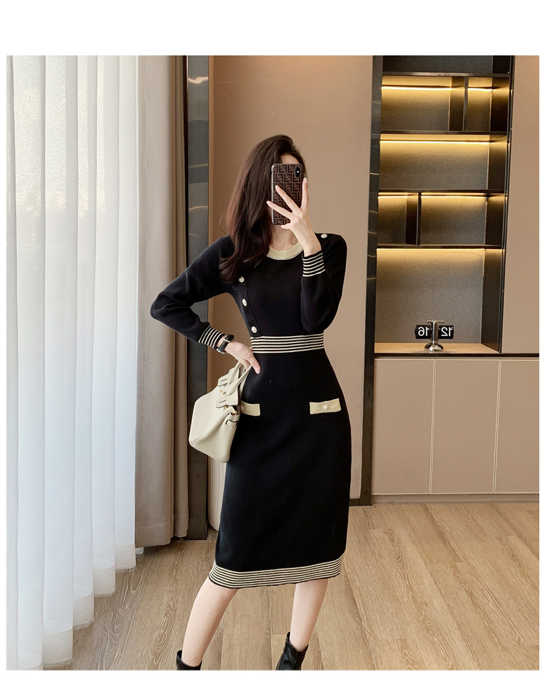 하이 엔드 가을과 겨울 여성의 작은 샤넬 스타일 긴팔 크루 넥 니트 원피스 엉덩이 중간 길이의 보토 밍 스웨터 원피스스토어 가기