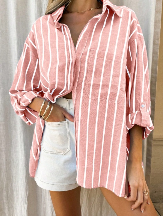 2024 국경 간 대외 무역 유럽과 미국 여성 레저 느슨한 셔츠 여성 최고 여성 코트 스트라이프 셔츠 긴 소매스토어 가기