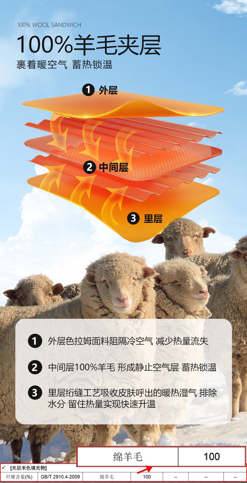 夹层采用羊毛100%成分,具有轻盈,蓬松,保暖等特点。