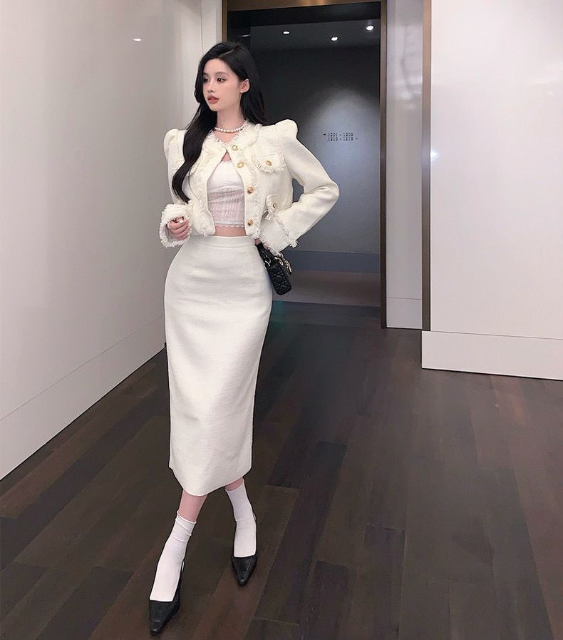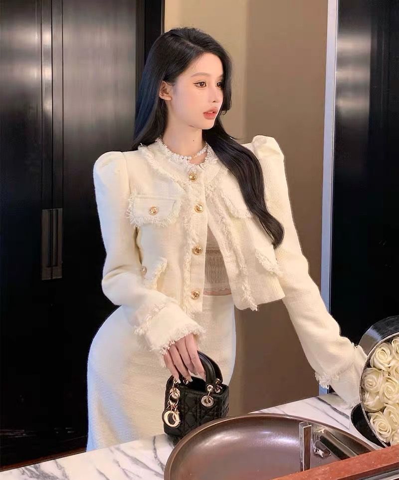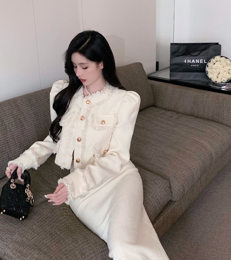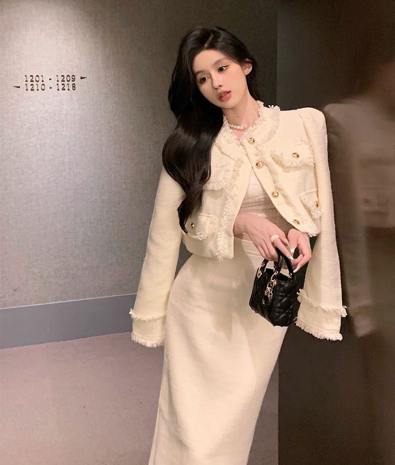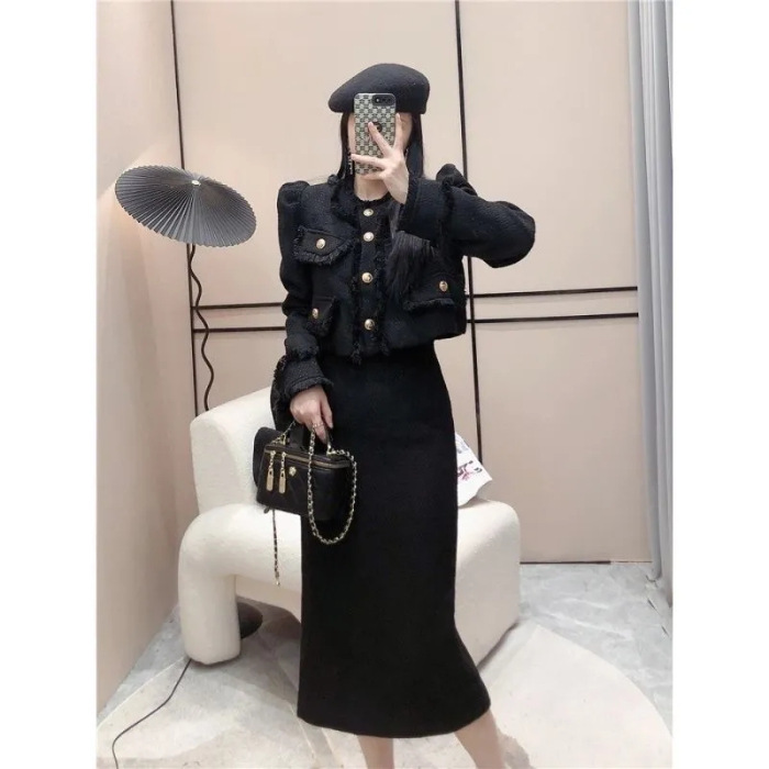작은 샤넬 스타일 원피스 두 조각 세트 가을과 겨울 새로운 프랑스 우아한 사교계 짧은 재킷 스커트 투피스 세트
