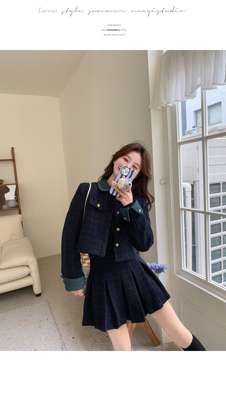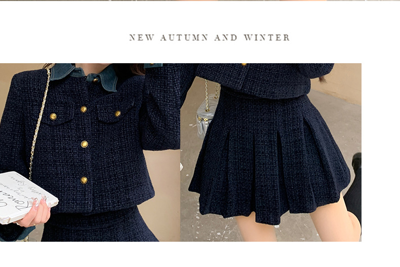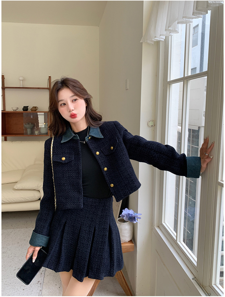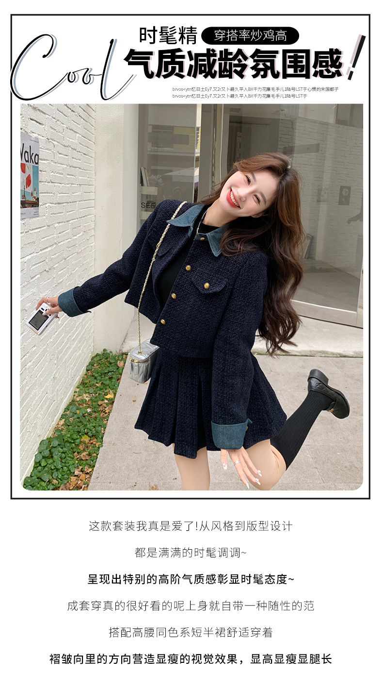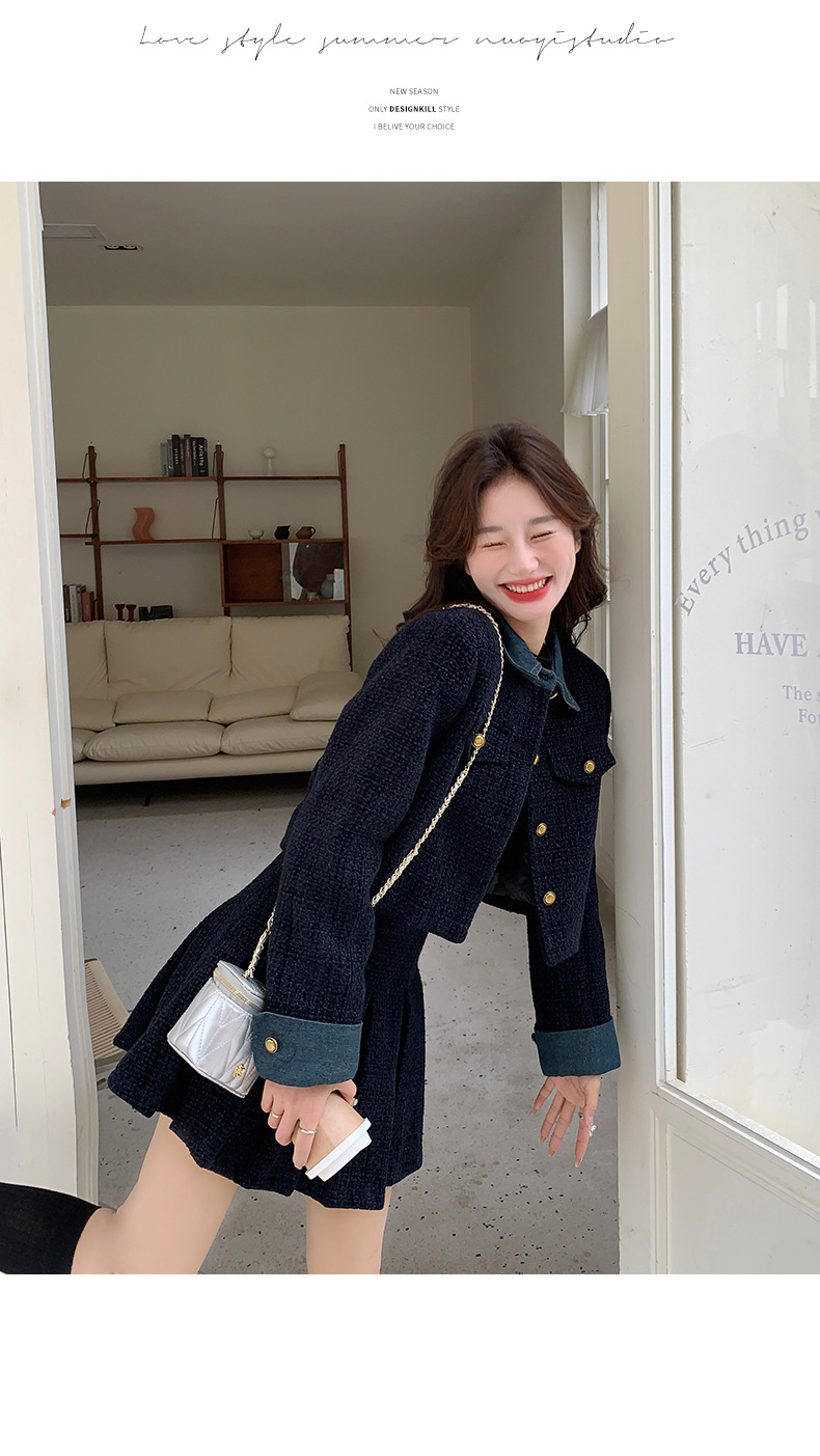 블랙 디자인 센스 세트 원피스 여성 대외 무역 가을 새로운 데님 스티칭 작은 샤넬 스타일 재킷 스커트 투피스 세트
