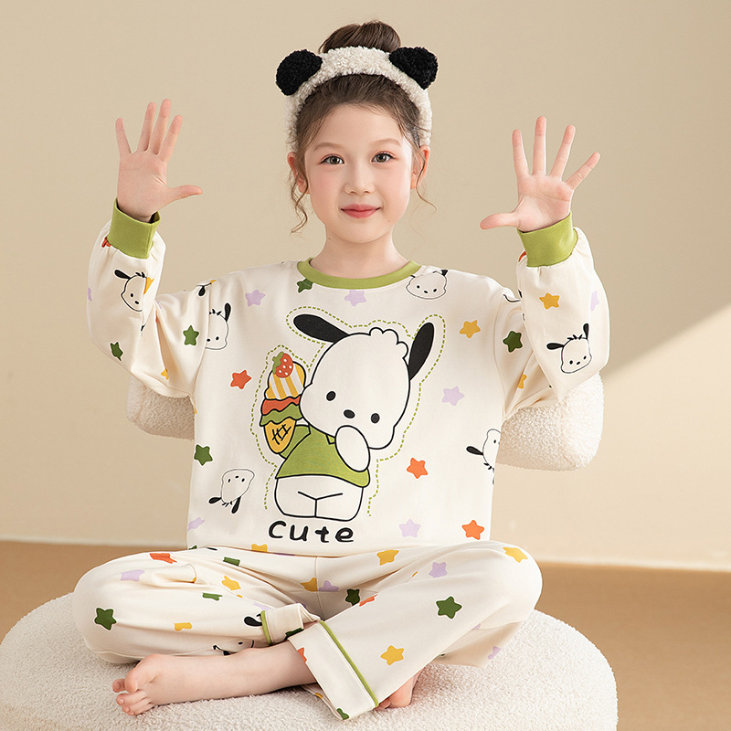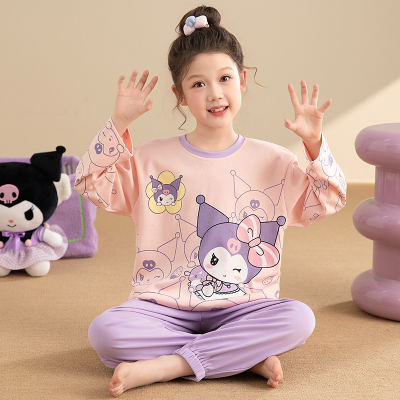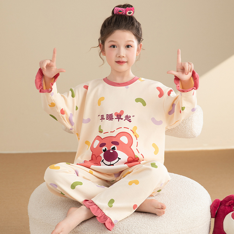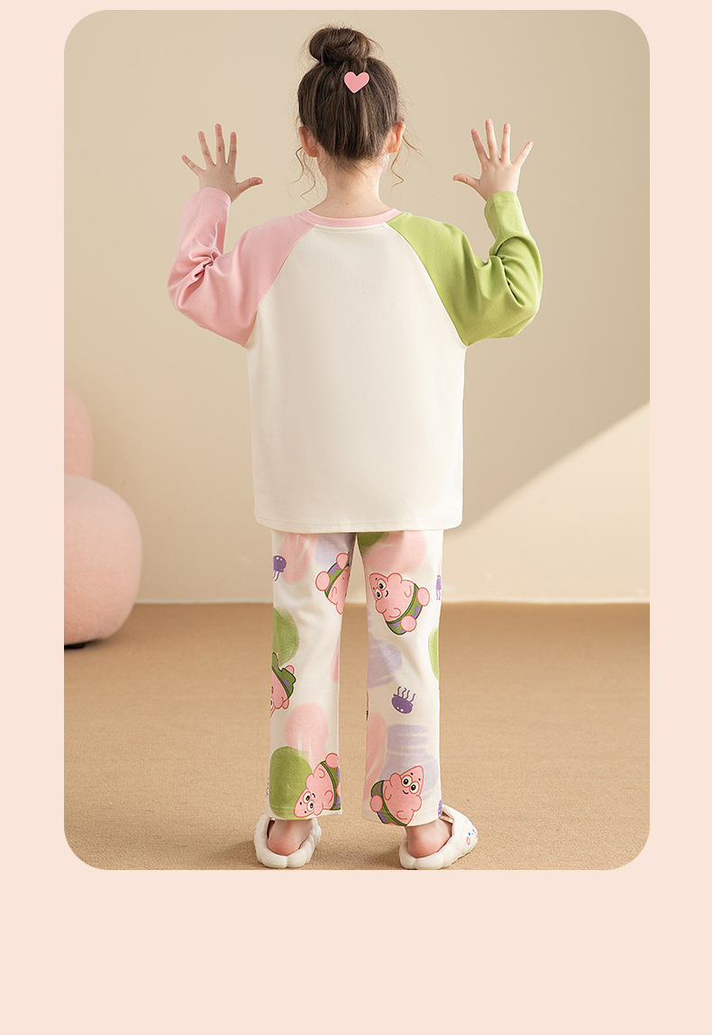 면 어린이 잠옷 봄과 가을 귀여운 만화 느슨한 캐주얼 소녀 2024 새로운 둥근 목 긴 소매 세트