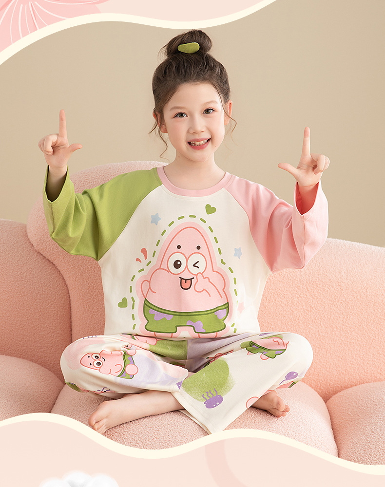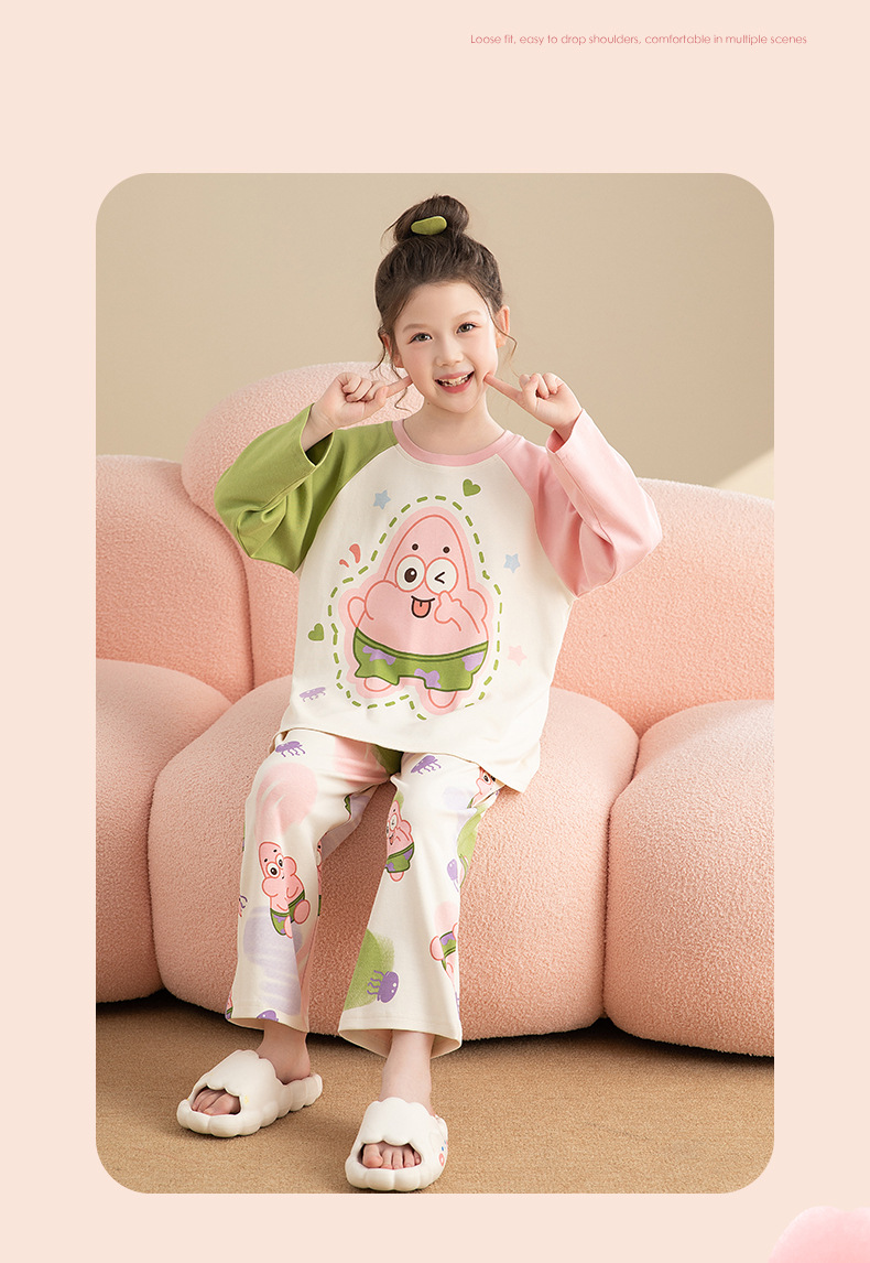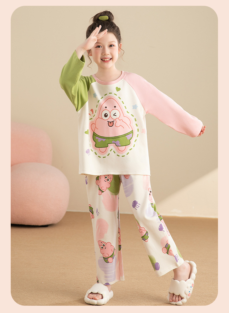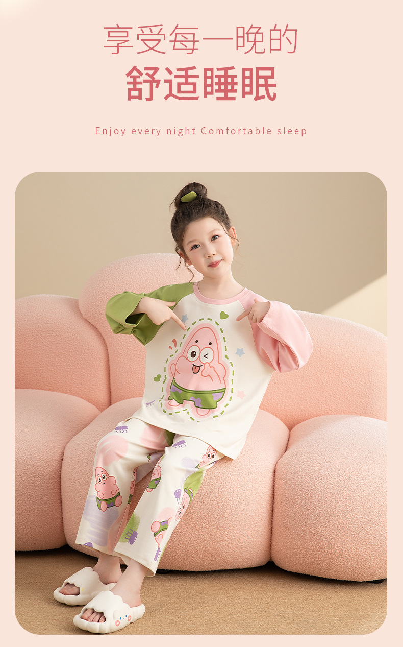 면 어린이 잠옷 봄과 가을 귀여운 만화 느슨한 캐주얼 소녀 2024 새로운 둥근 목 긴 소매 세트스토어 가기
