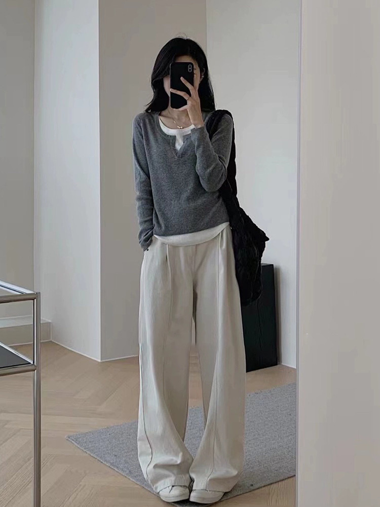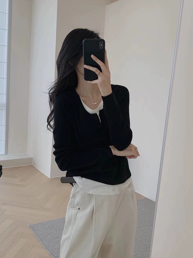 [하이 퀄리티 원단] 검은 가짜 투피스 v-neck 여성용 가을 슬림 베이스 셔츠 긴소매 탑스토어 가기