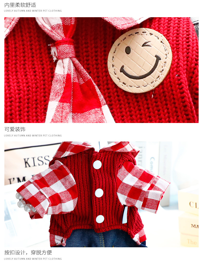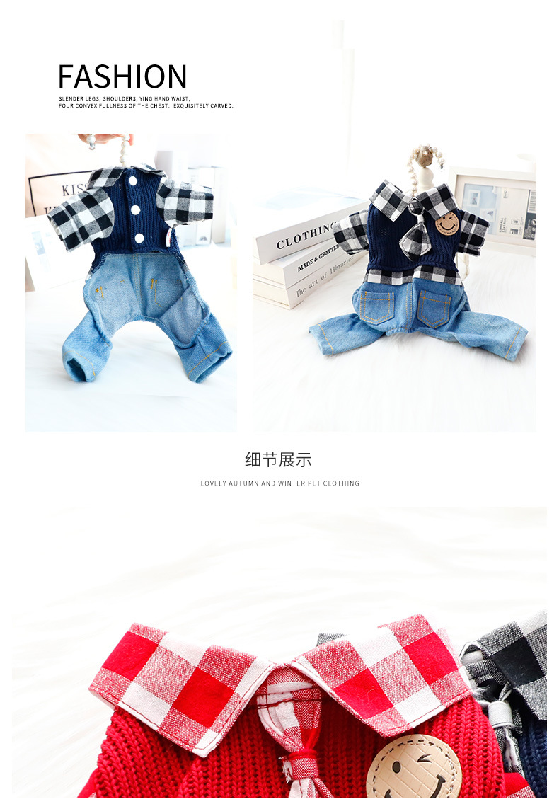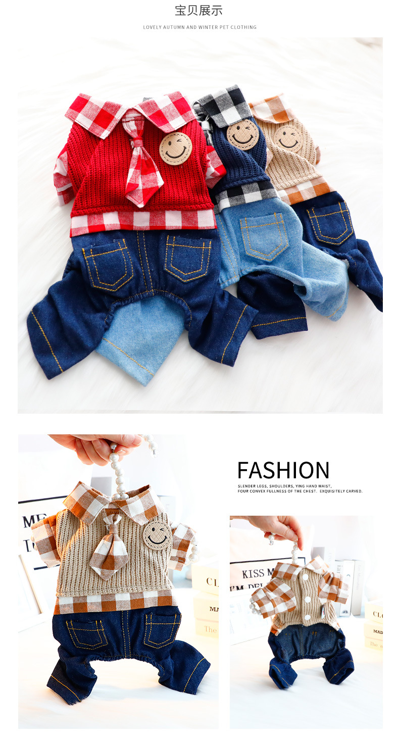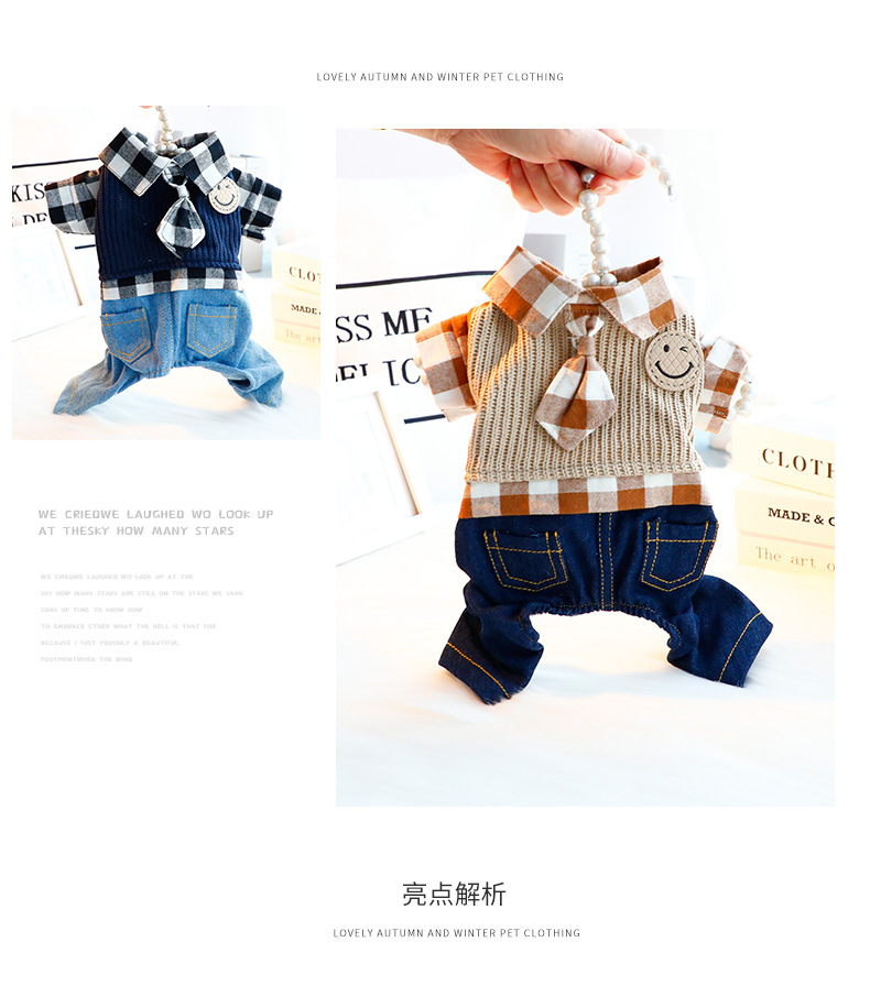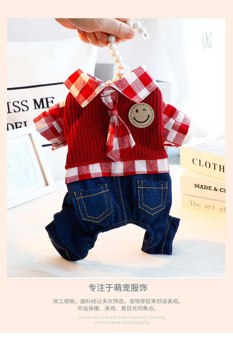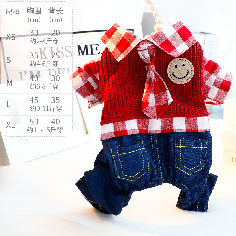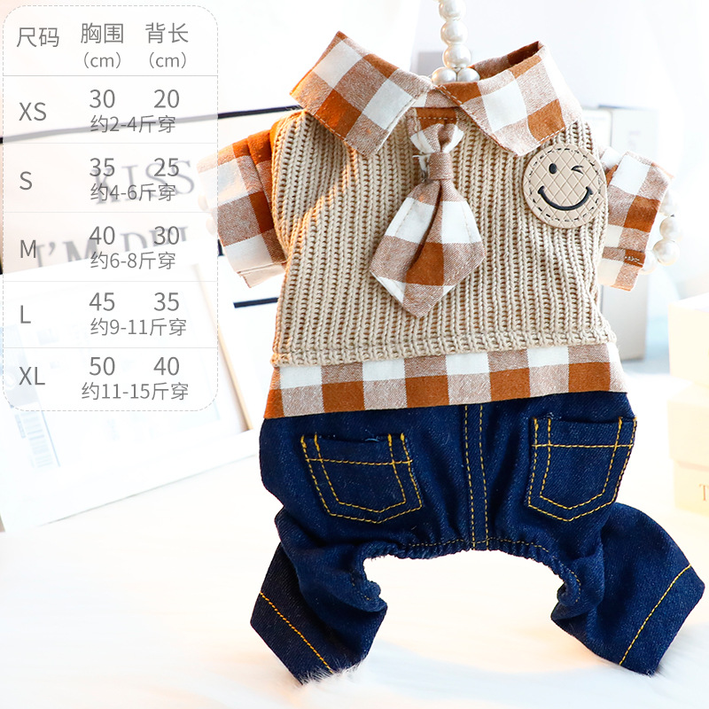 개 옷 봄과 가을 웃는 얼굴 격자 무늬 넥타이 데님 세트 잘 생긴 네 다리 작은 개 테디 애완 동물 6329스토어 가기