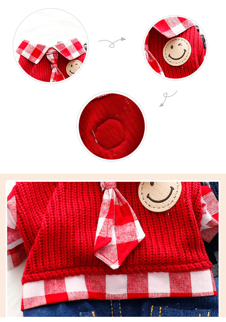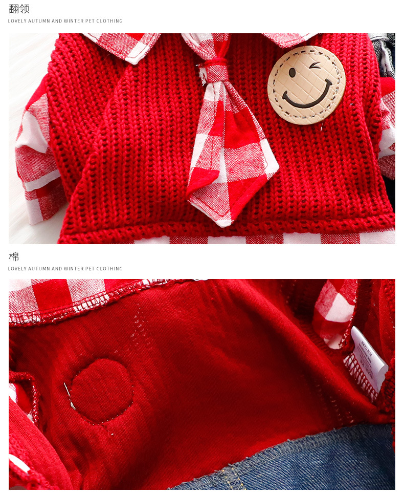개 옷 봄과 가을 웃는 얼굴 격자 무늬 넥타이 데님 세트 잘 생긴 네 다리 작은 개 테디 애완 동물 6329