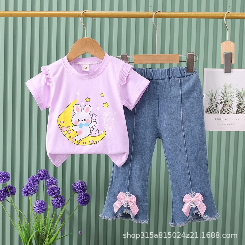 여자 세트 2024 새 만화 귀여운 동물 한국 청바지 레이스 반팔 중소 어린이 투피스 세트