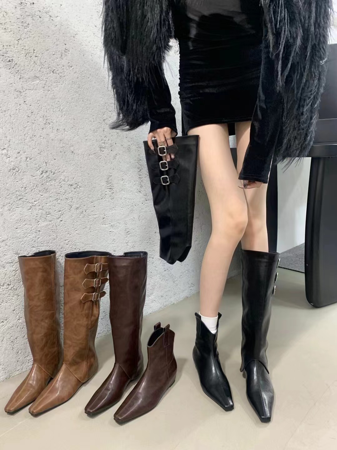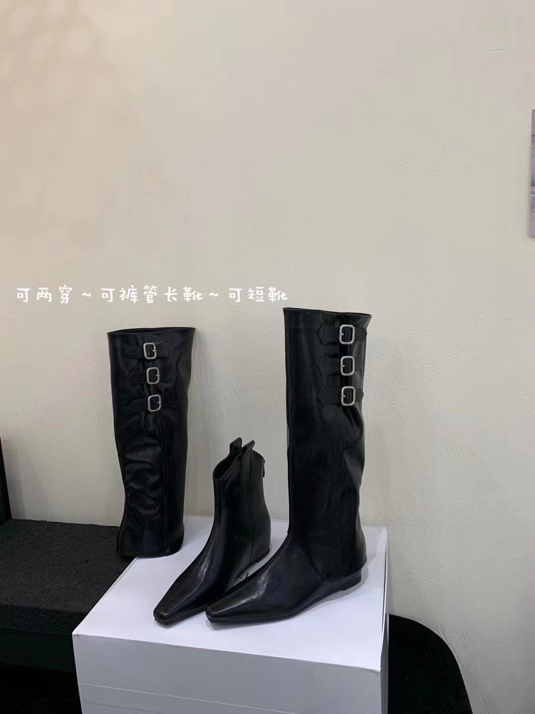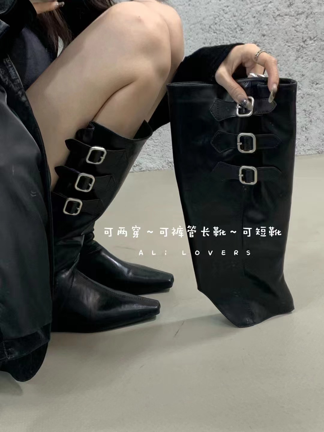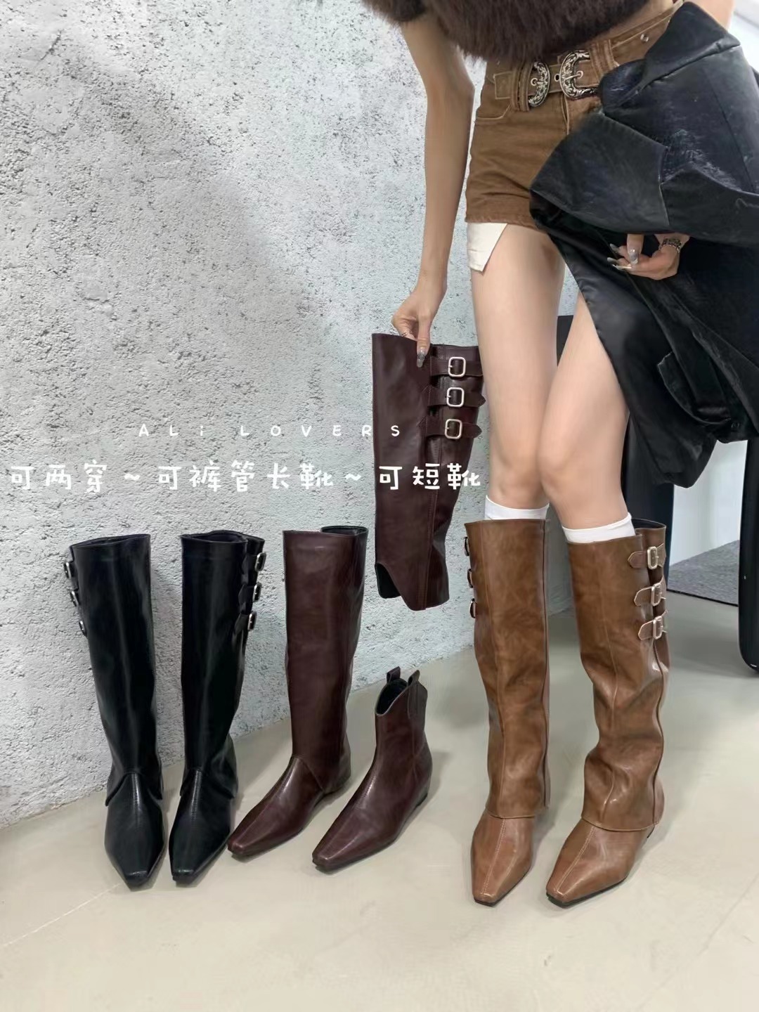 벨트 버클 2024 가을 및 겨울 새로운 2 복 분리 가능한 부츠 벨트 버클 뾰족한 미드 힐 발목 부츠 여성용 하이 부츠스토어 가기