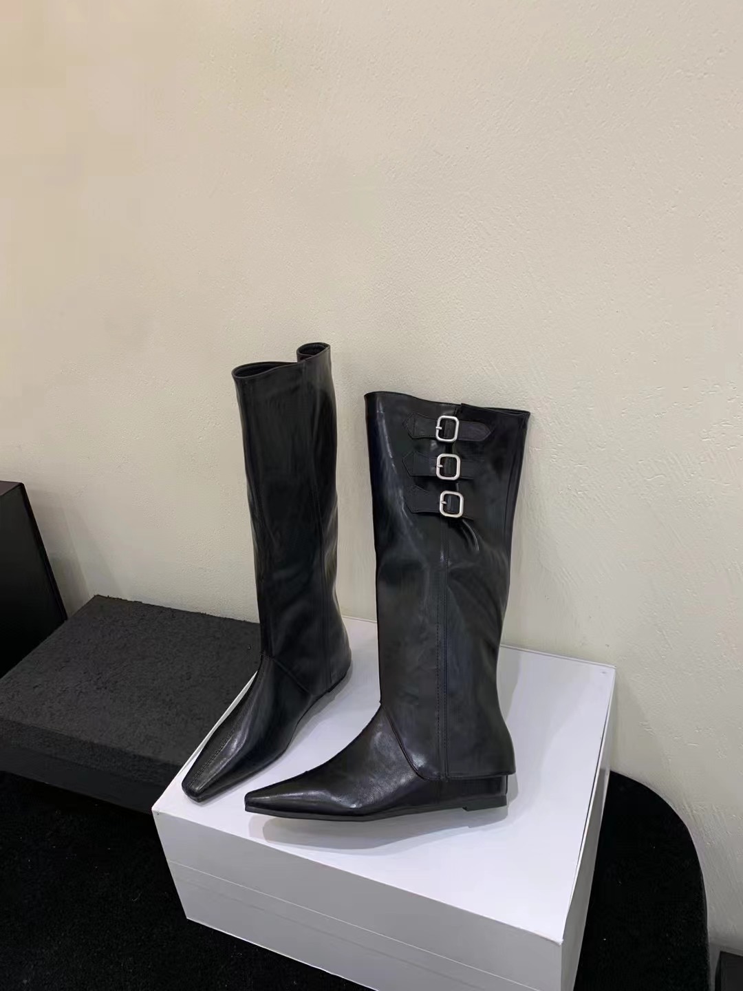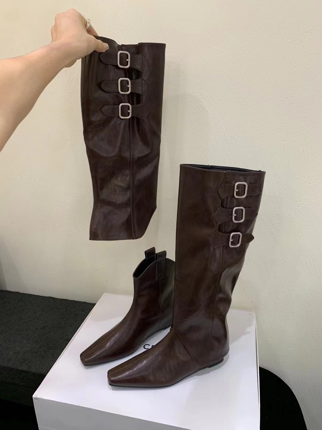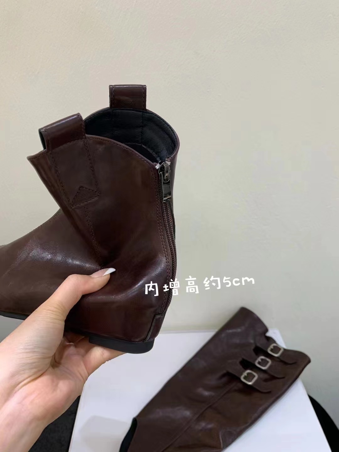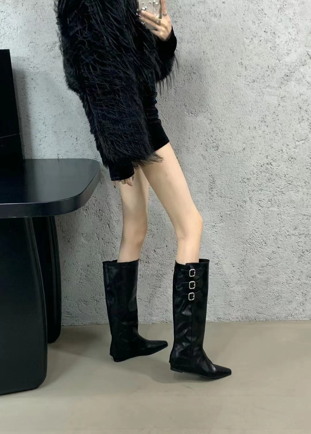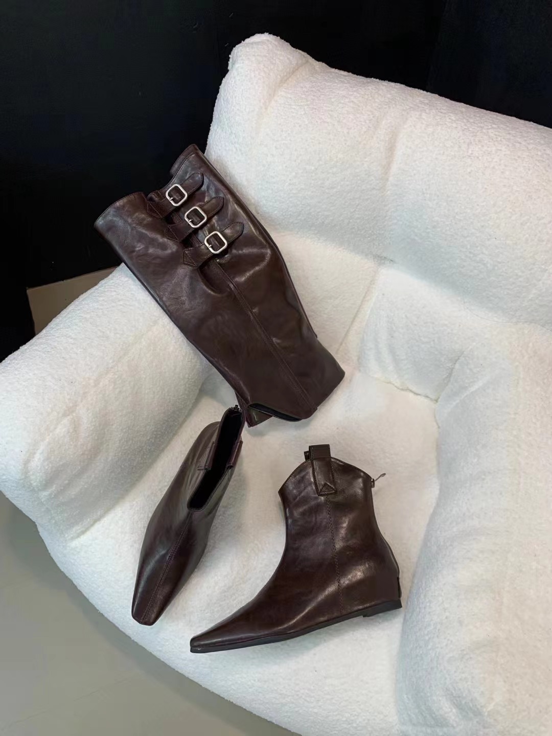 벨트 버클 2024 가을 및 겨울 새로운 2 복 분리 가능한 부츠 벨트 버클 뾰족한 미드 힐 발목 부츠 여성용 하이 부츠스토어 가기