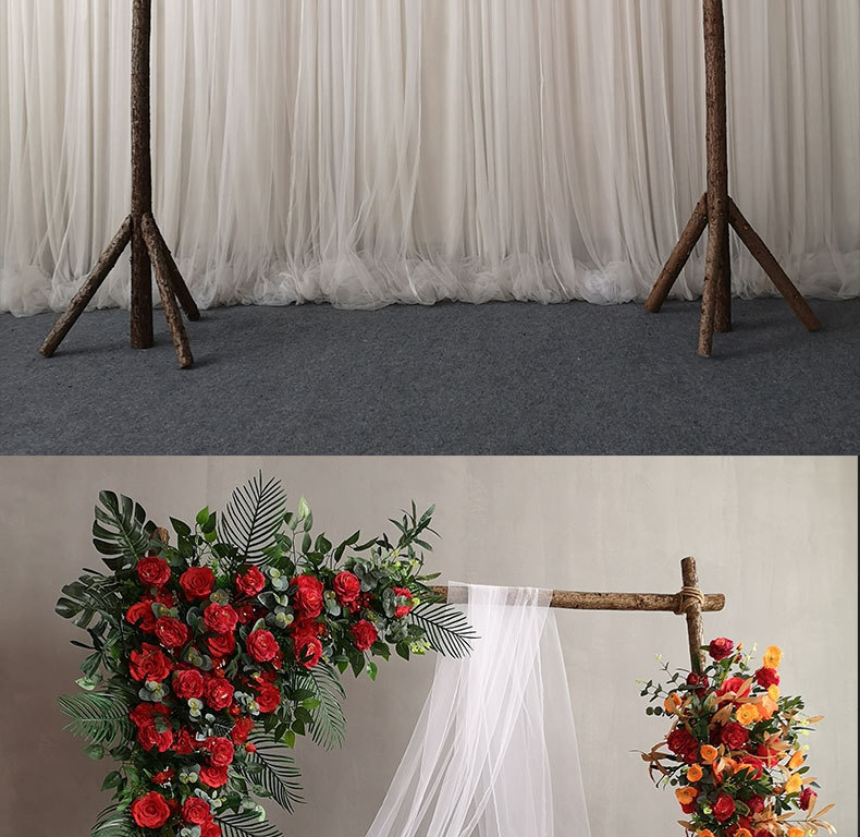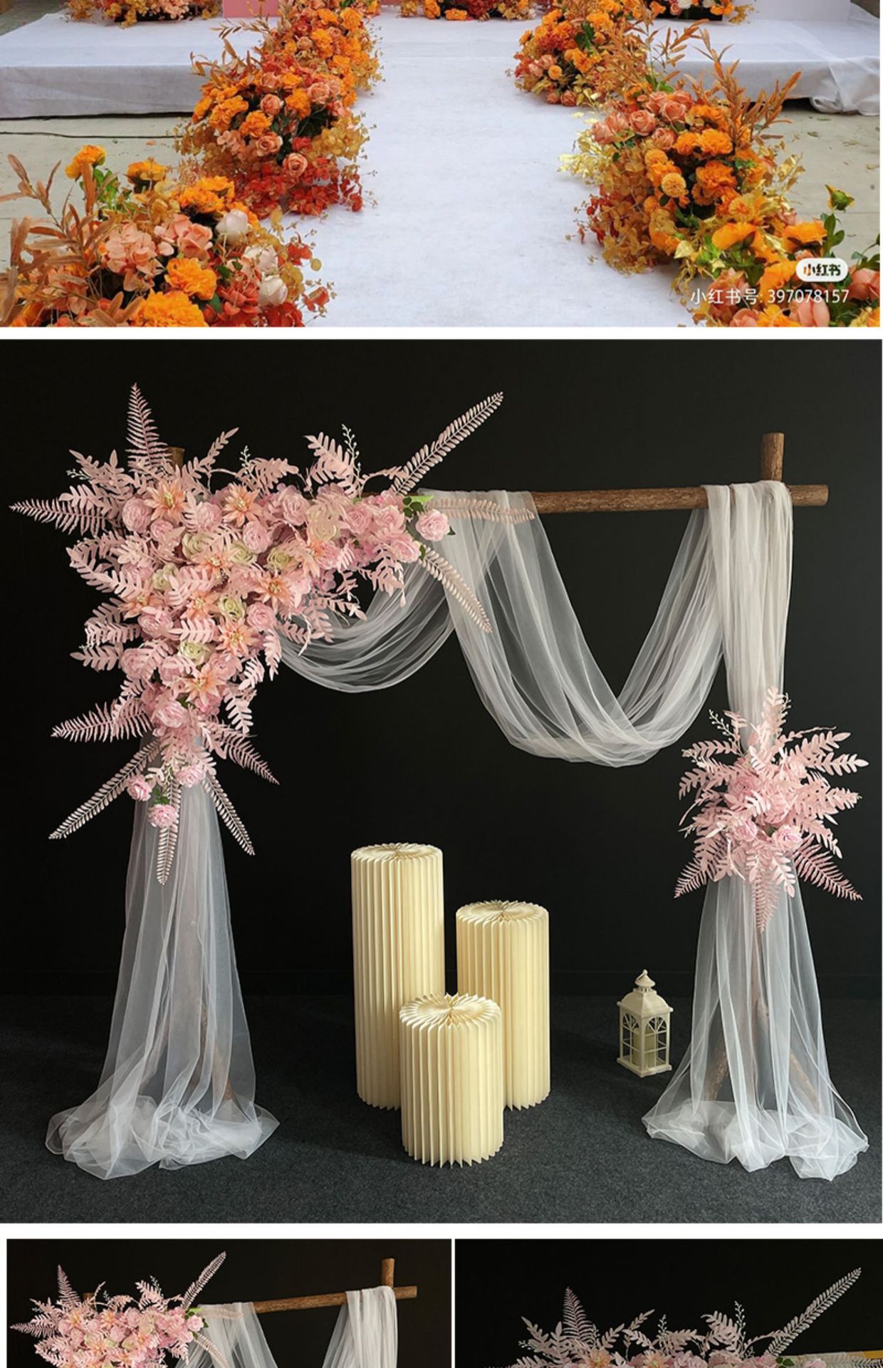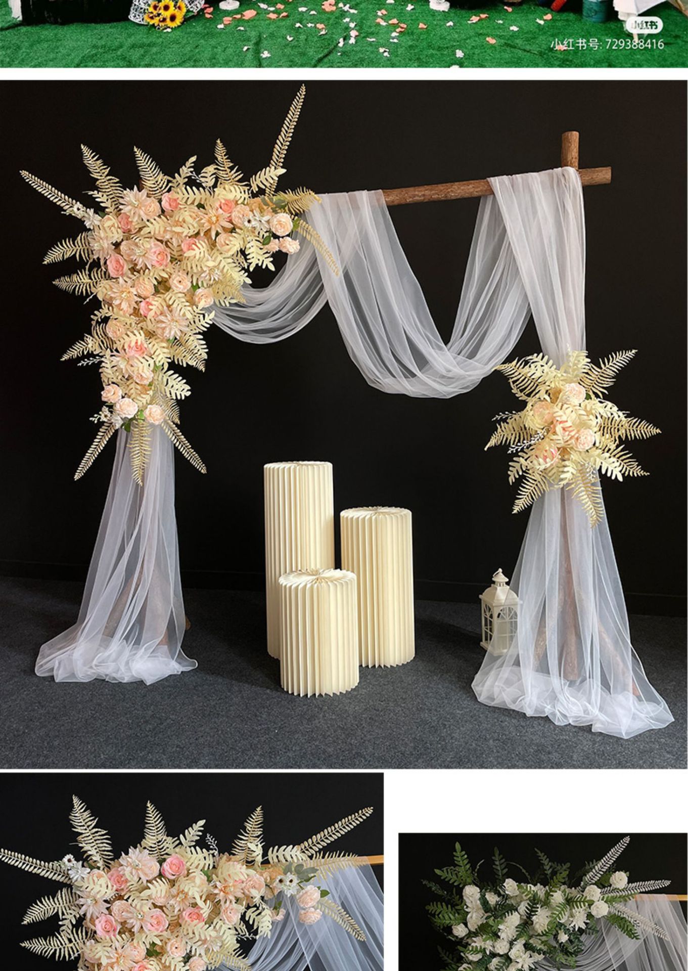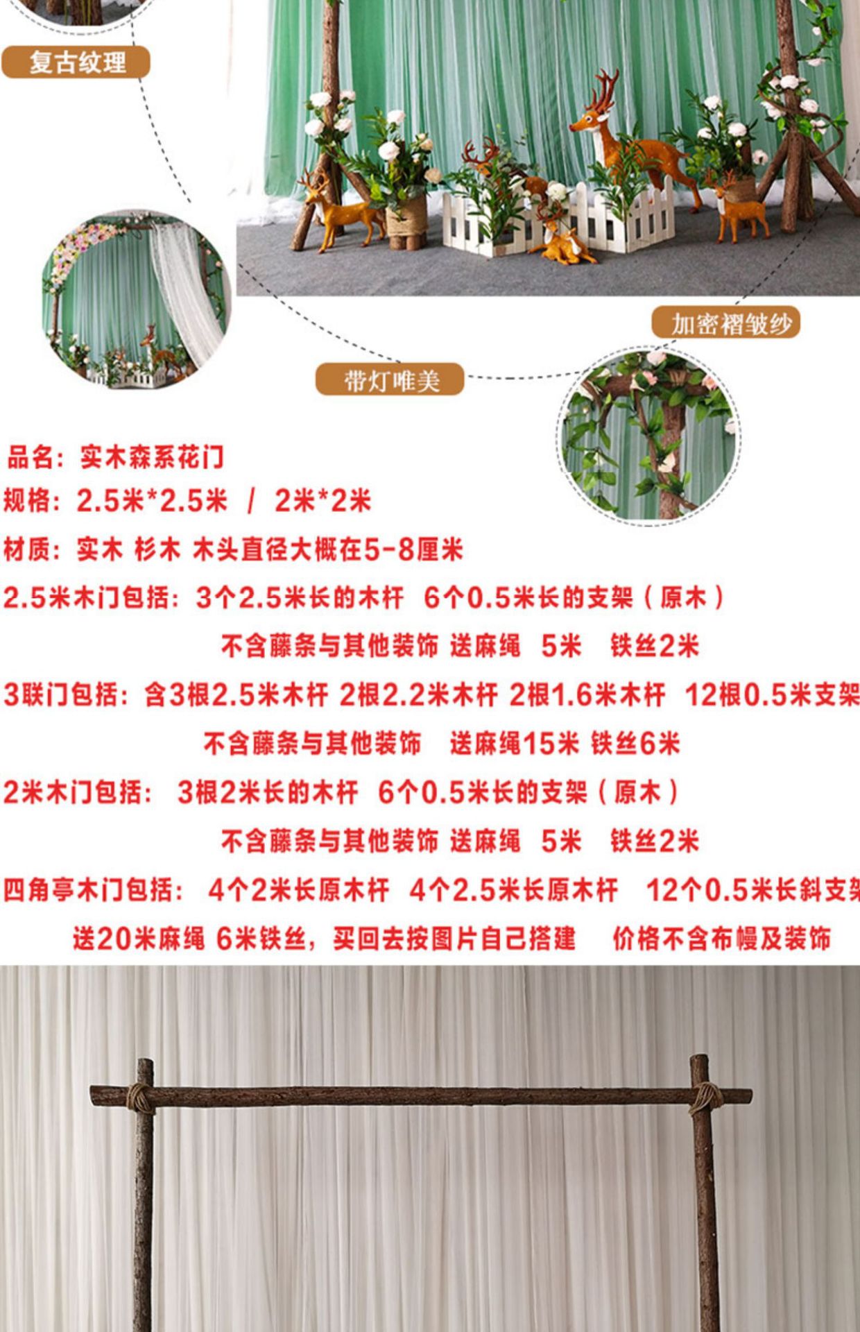 웨딩 모리 우드 스테이크 도어 아치 잔디 야외 웨딩 우드 선반 꽃 문 배열 나무 스테이크 배경 장식품스토어 가기