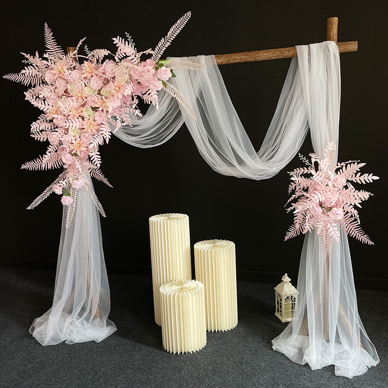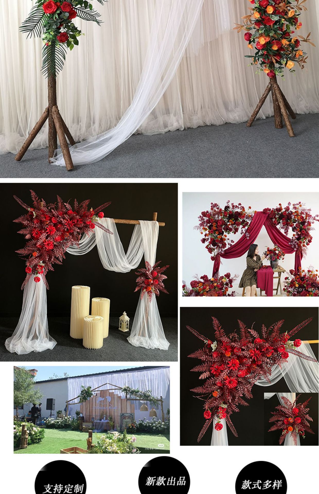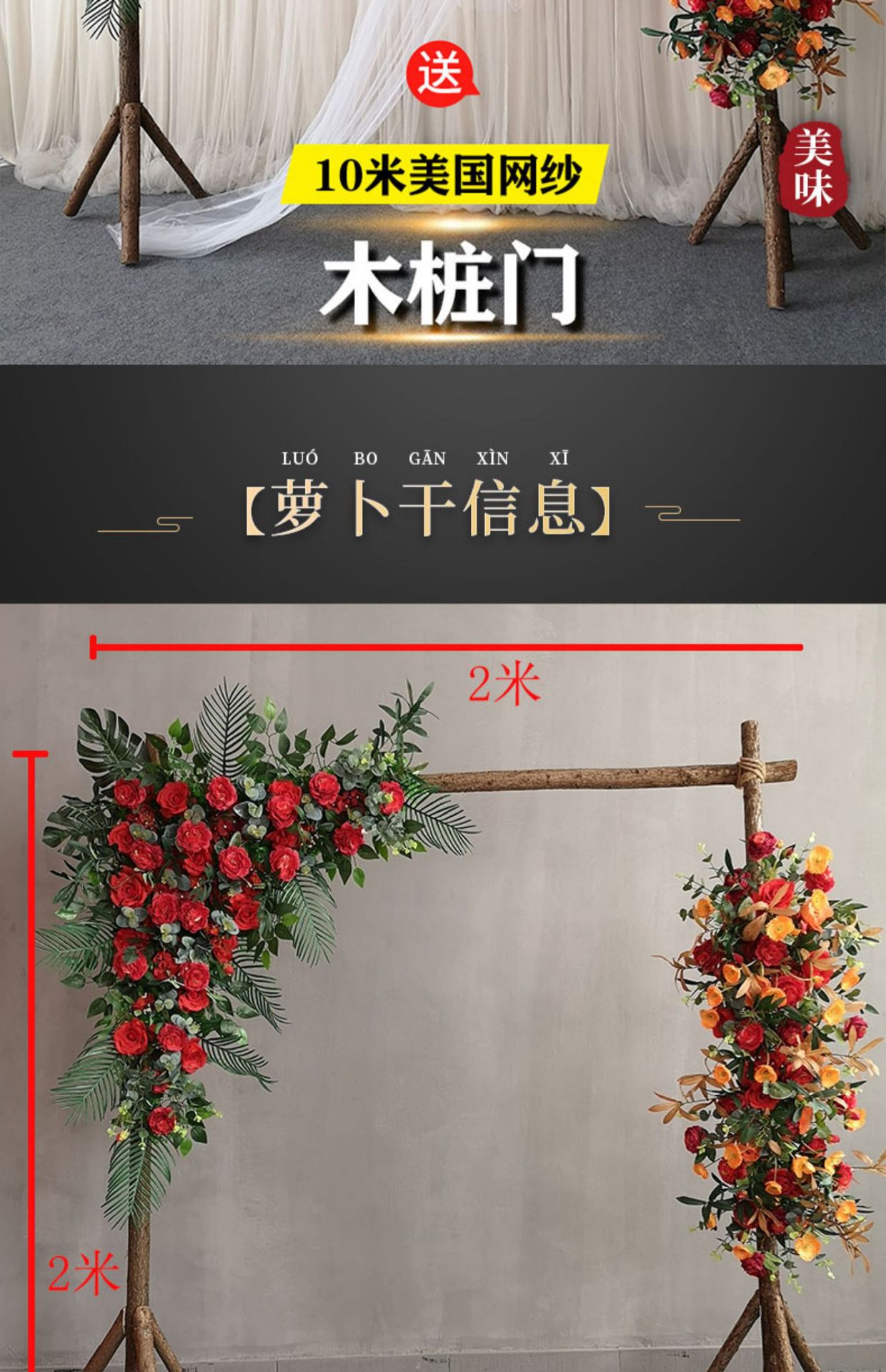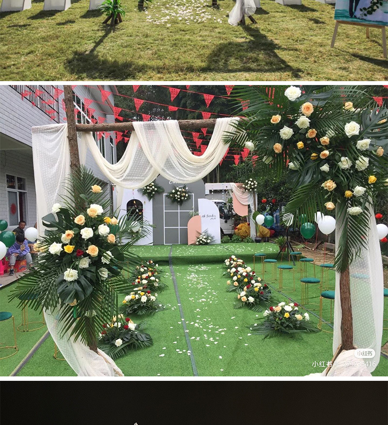 웨딩 모리 우드 스테이크 도어 아치 잔디 야외 웨딩 우드 선반 꽃 문 배열 나무 스테이크 배경 장식품스토어 가기