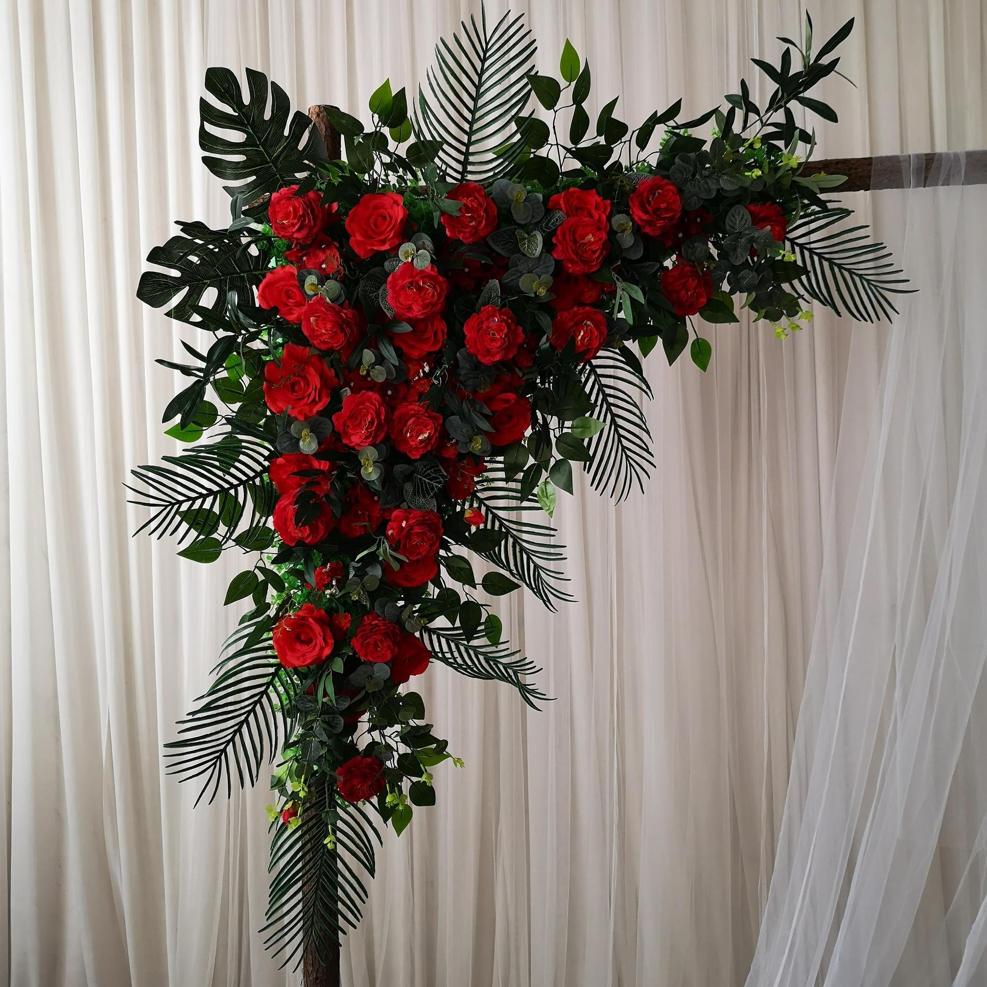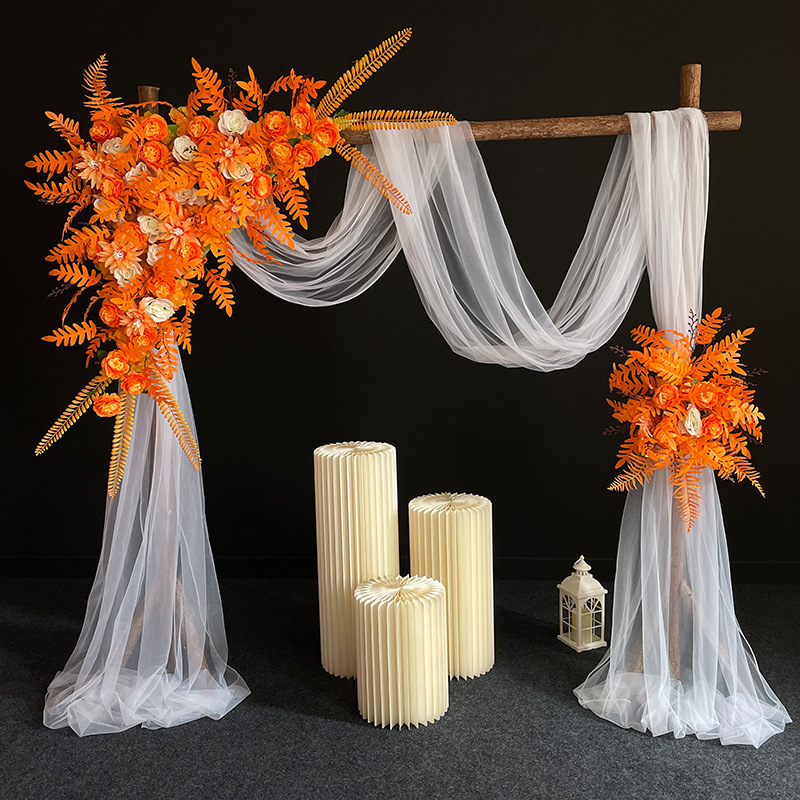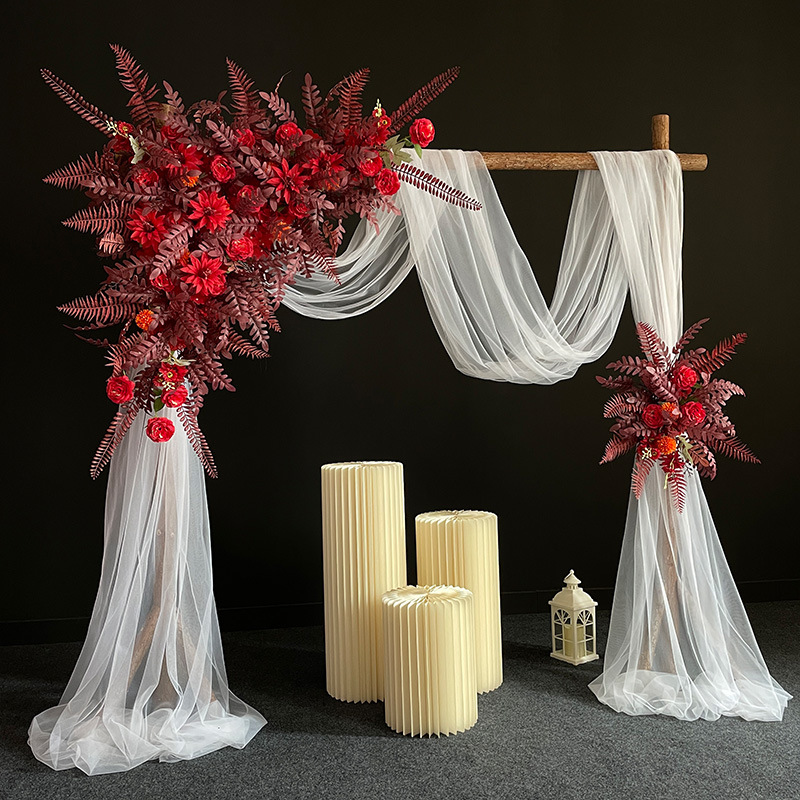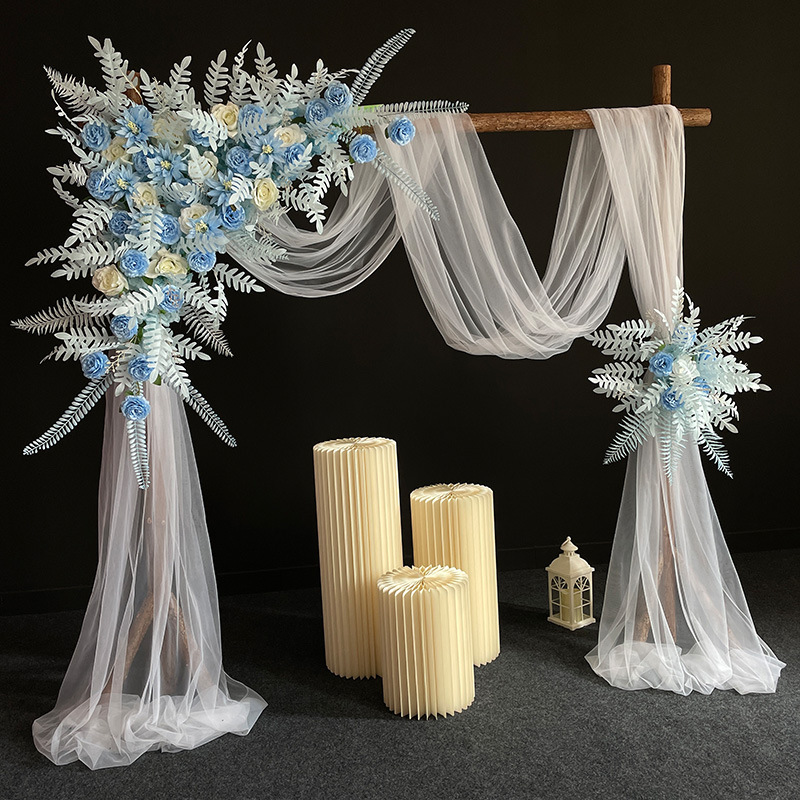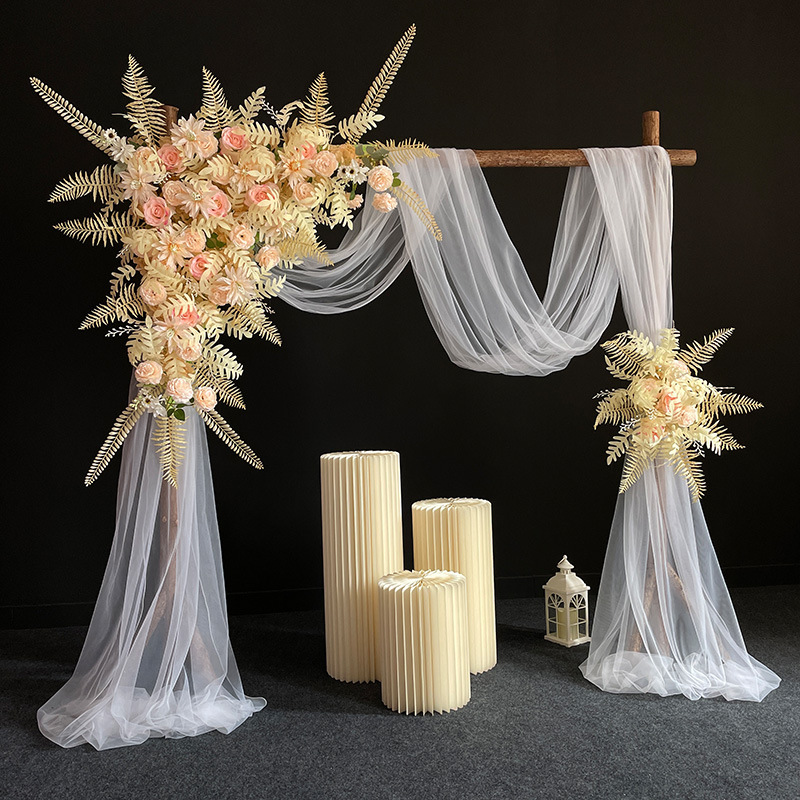 웨딩 모리 우드 스테이크 도어 아치 잔디 야외 웨딩 우드 선반 꽃 문 배열 나무 스테이크 배경 장식품