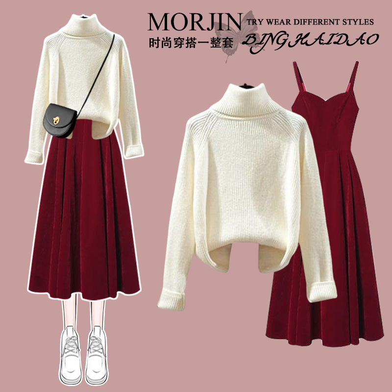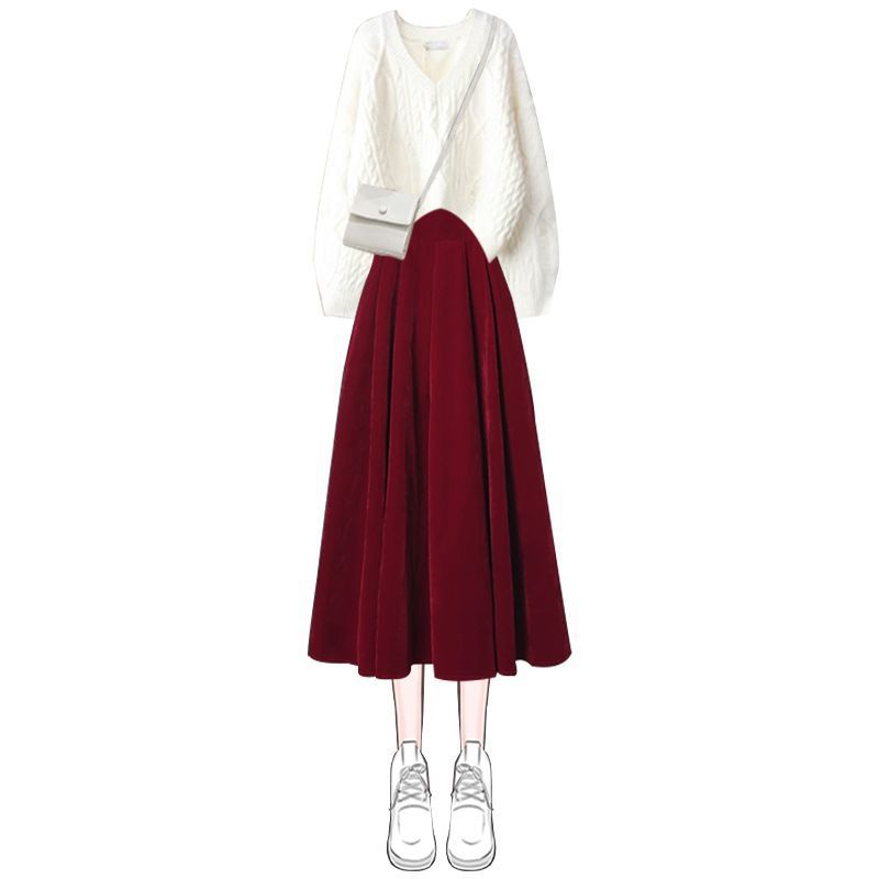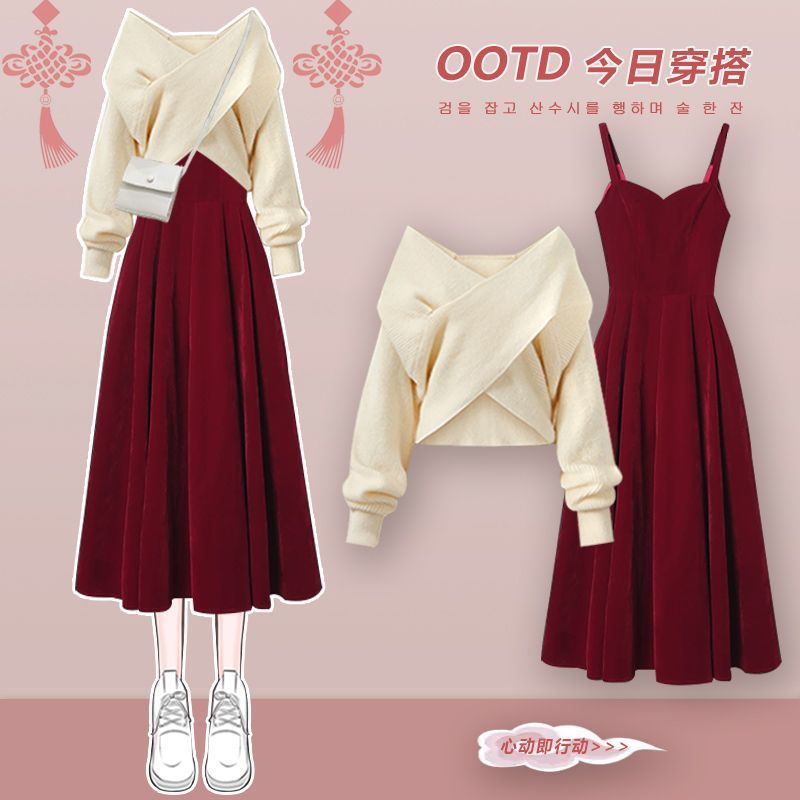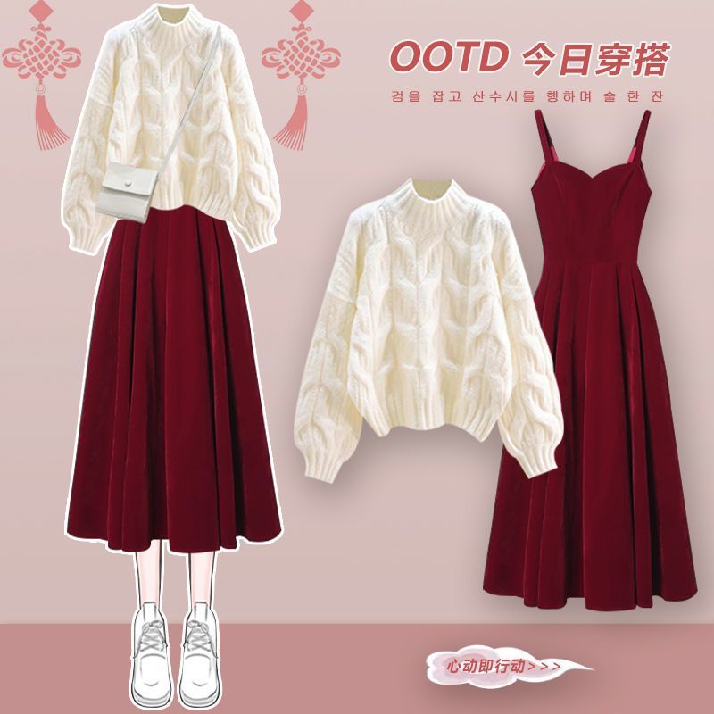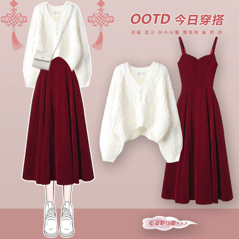 • 흰색 스웨터 + 빨간색 드레스 투피스 세트