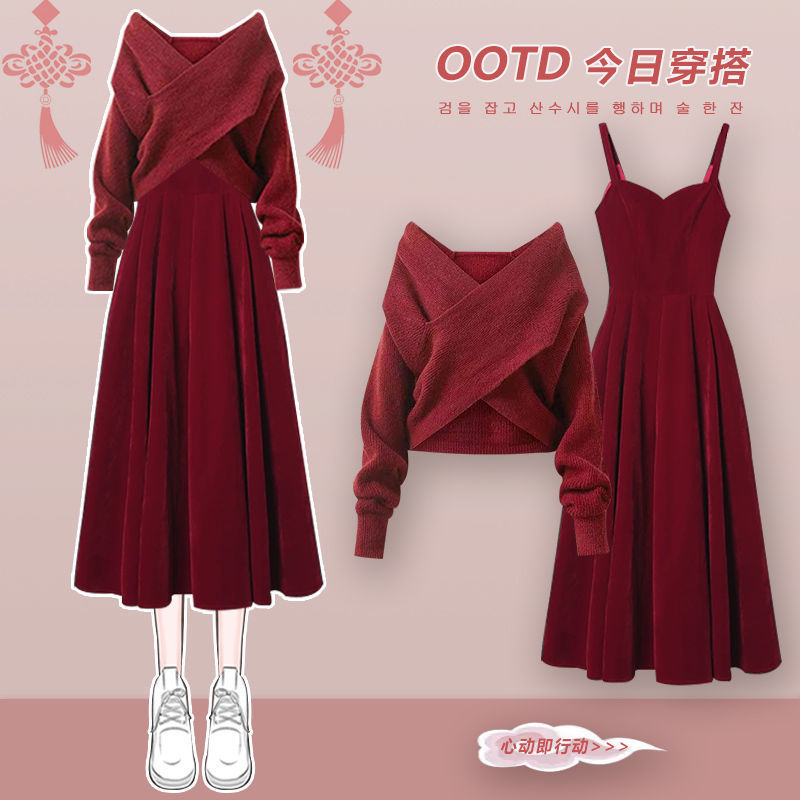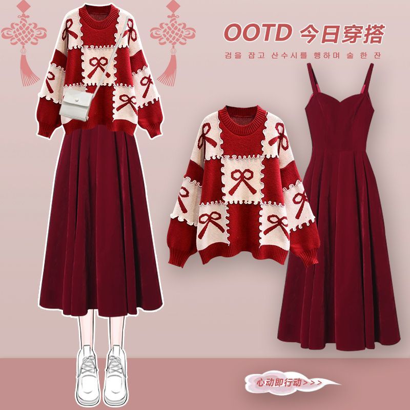 여성을 위한 봄 정장, 새로운 스타일, 니트 스웨터, 슬림하고 다재다능한 여성용 레드 드레스 투피스 세트스토어 가기