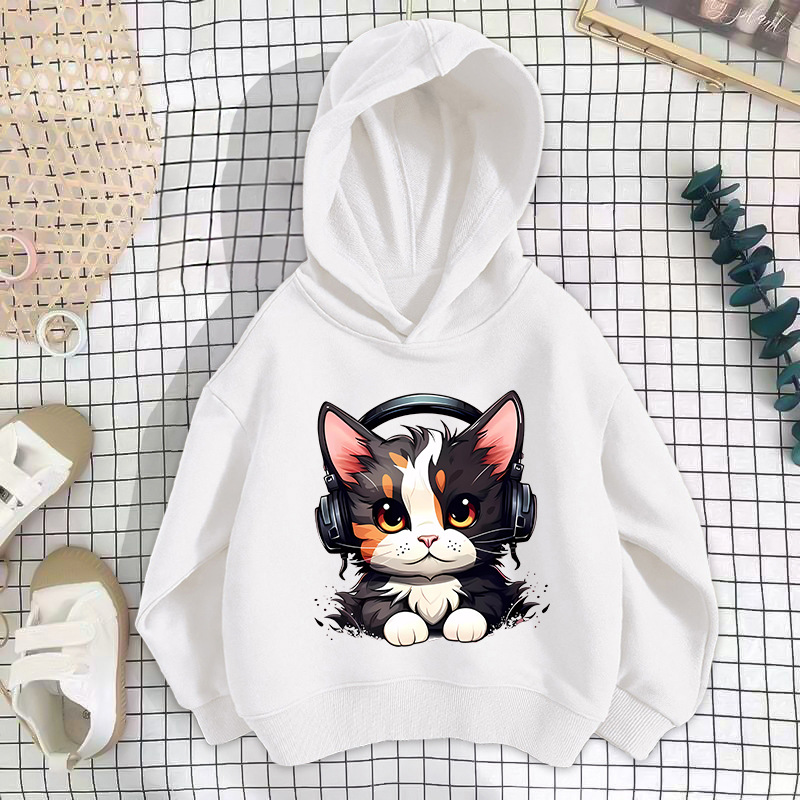 • 흰색 이어폰 고양이 스웨트셔츠 얇은 스타일